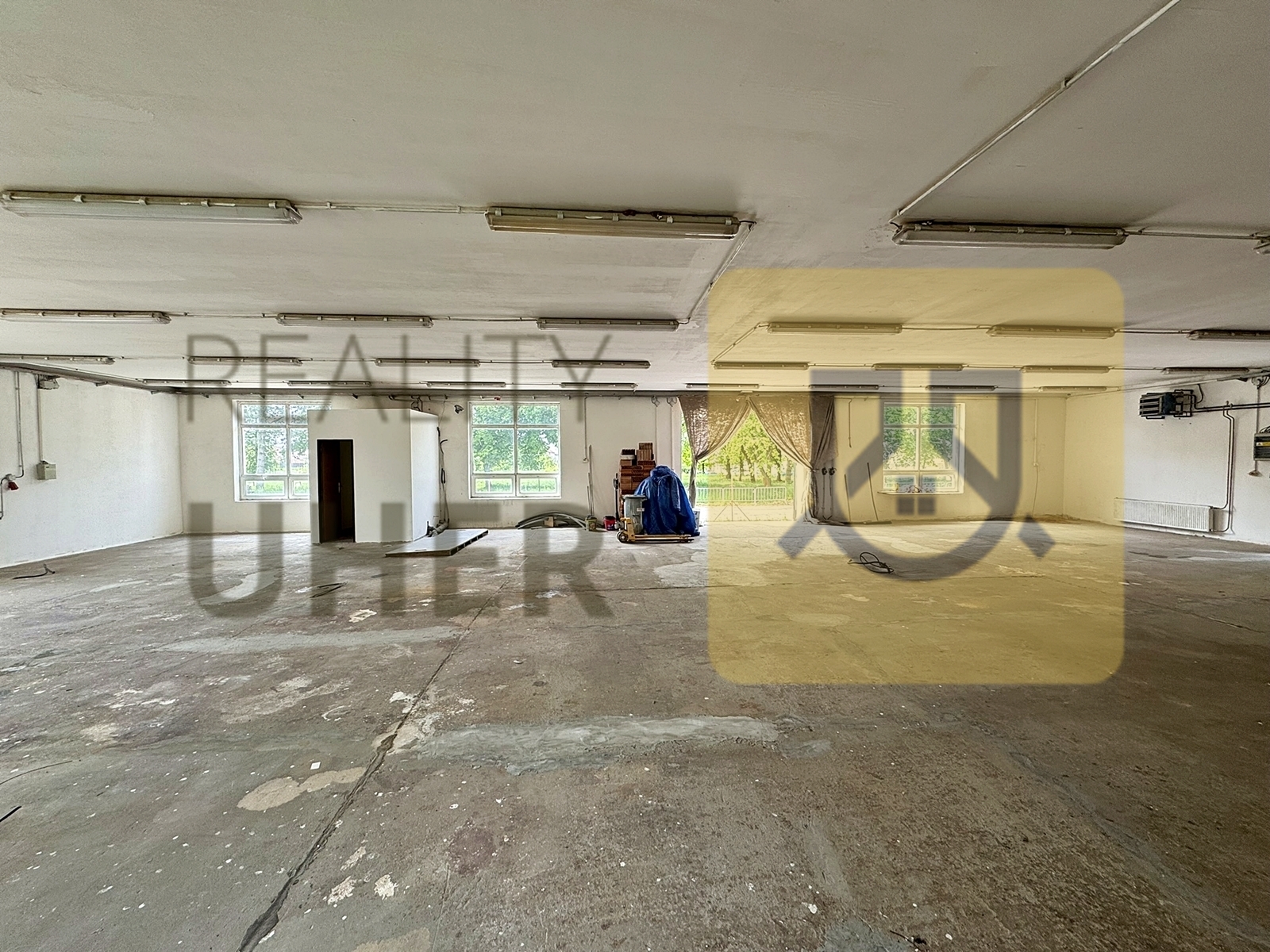 Hala je na vyvýšeném základu, přístupná po schodech ze strany dveřmi nebo přes rampu čelními vraty (3x3 m). Vnitřní rozměry 21,3 x 12,6 m, světlá výška činí 3,15 m, nosnost podlahy cca 3 t/m2. Uvnitř nové rozvody ele, vzduchotechniky i topení. Světlo zajišťuje dostatek oken a 5 okruhů zářivek na stropě. El. zásuvky a přípojky vzduchu po celém obvodu haly a/nebo v betonové podlaze. 380V zásuvka je i vně budovy, stejně jako několik světel pro osvětlení venkovní manipulační plochy. Vytápění elektrokotlem napojeným na radiátory s termoventily a dvě "sahary". Téměř v rohu haly je komora s WC a umyvadlem a přípravou na sprchový kout. V této části možnost zbudovat kancelářské zázemí nějakou jednoduchou příčkou. Objekt střežen kamerovým systémem (4x vně, 2x uvnitř + možnost přidat další kamery).