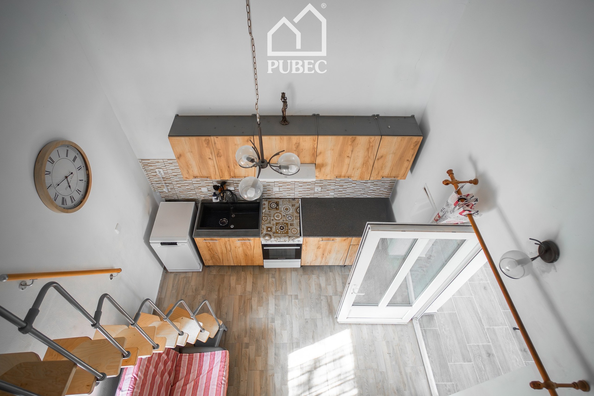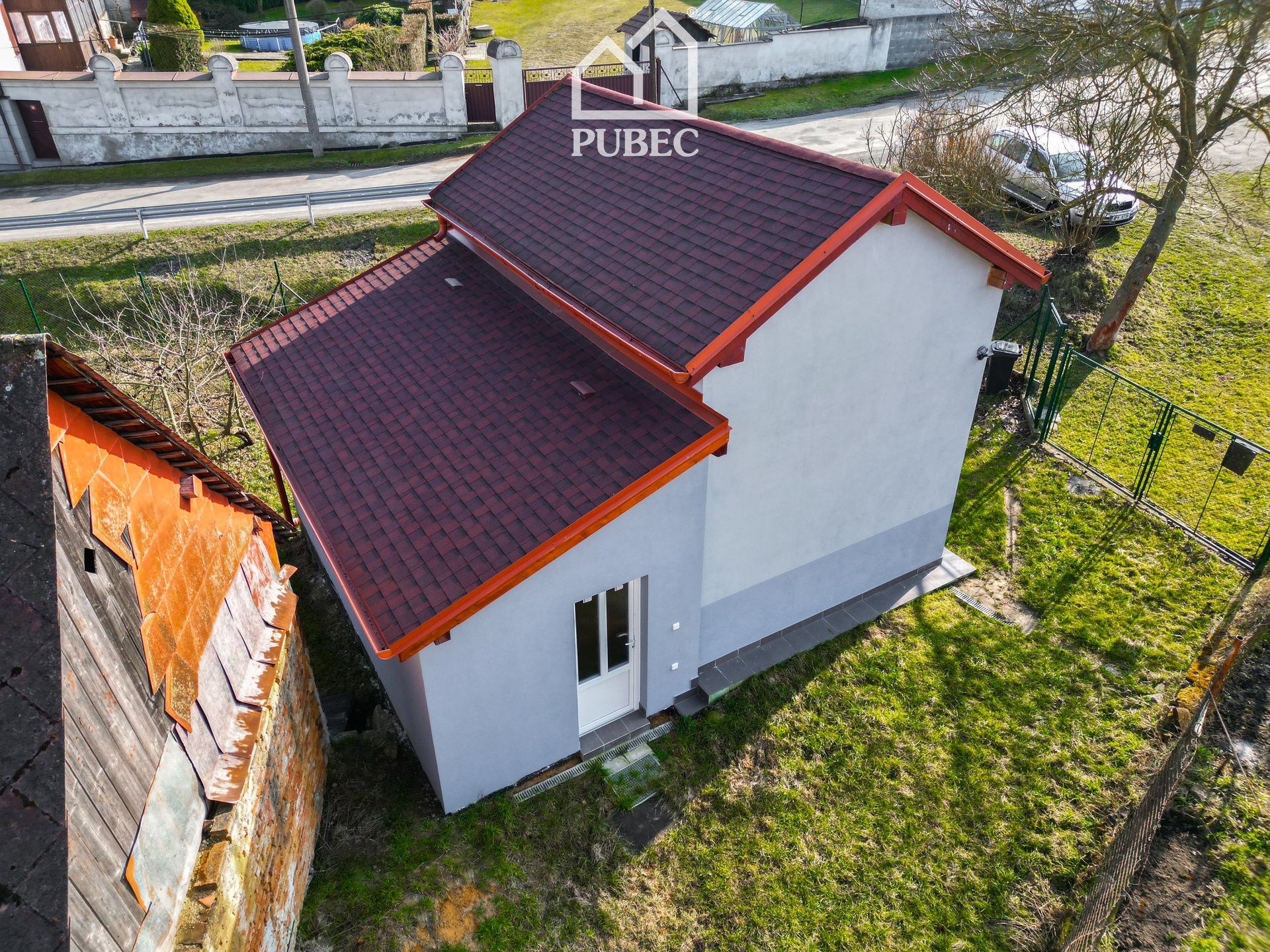 Moderní stavba (41 m² užitné plochy): Atypický loftový domek 2+kk. Vzdušný interiér, koupelna s WC v přízemí + toaleta v patře. Vytápěno elektřinou – připraveno k okamžitému užívání.