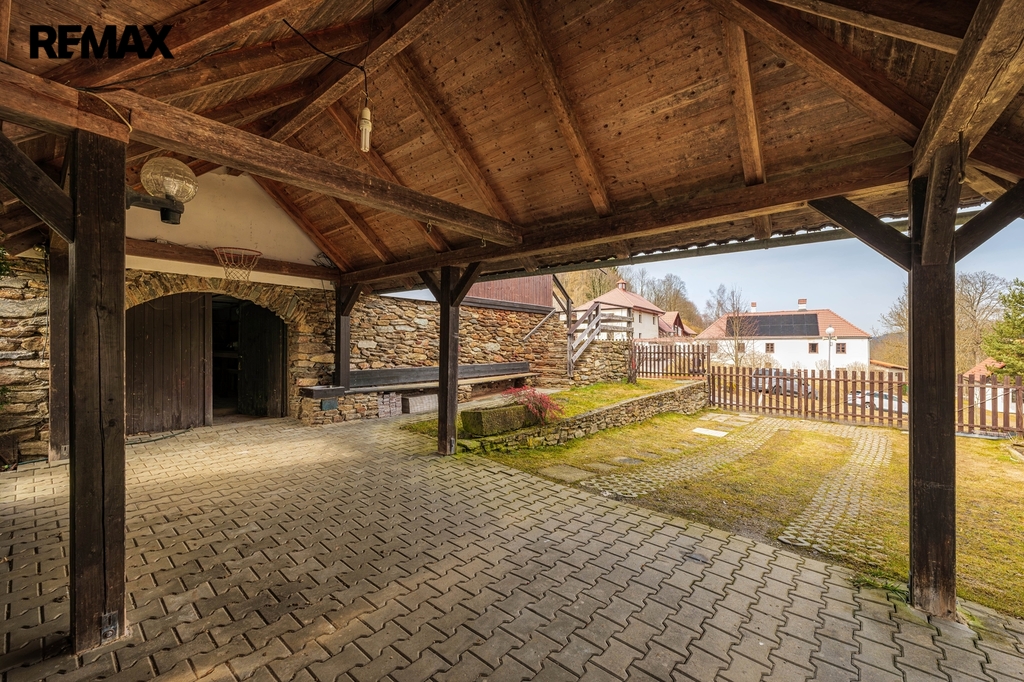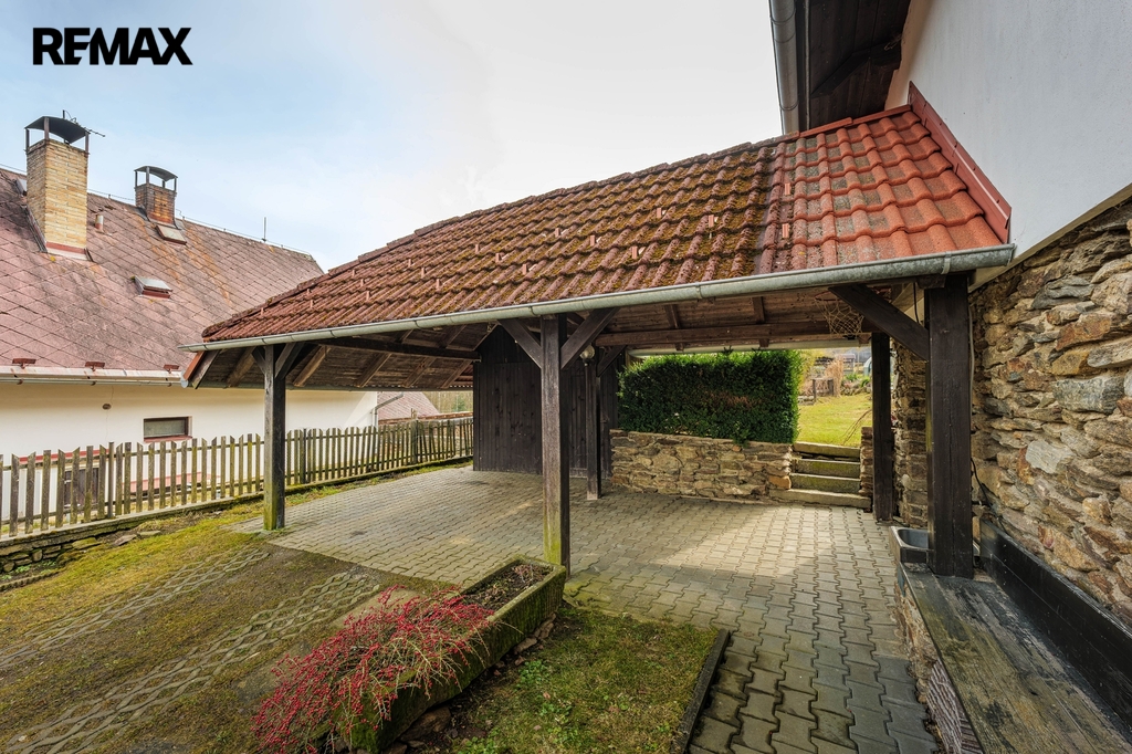 - samostatná garáž s navazujícím krytým parkovacím stáním a další zpevněnou plochou