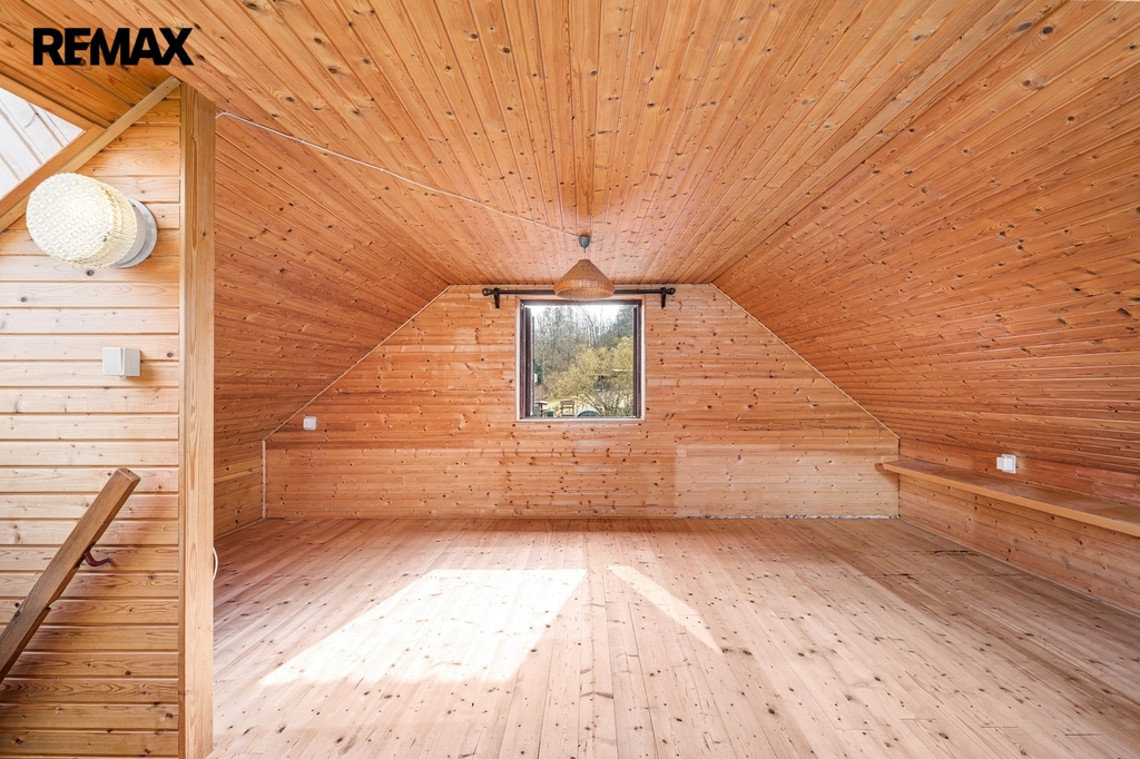 V podkroví (přístup po dřevěných schodech z hlavní chodby) se nalézá velký obytný prostor (8,7 x 5,7 m) s možností dílčího předělení a rozdělení.