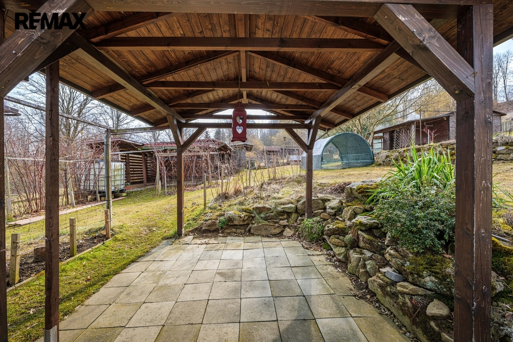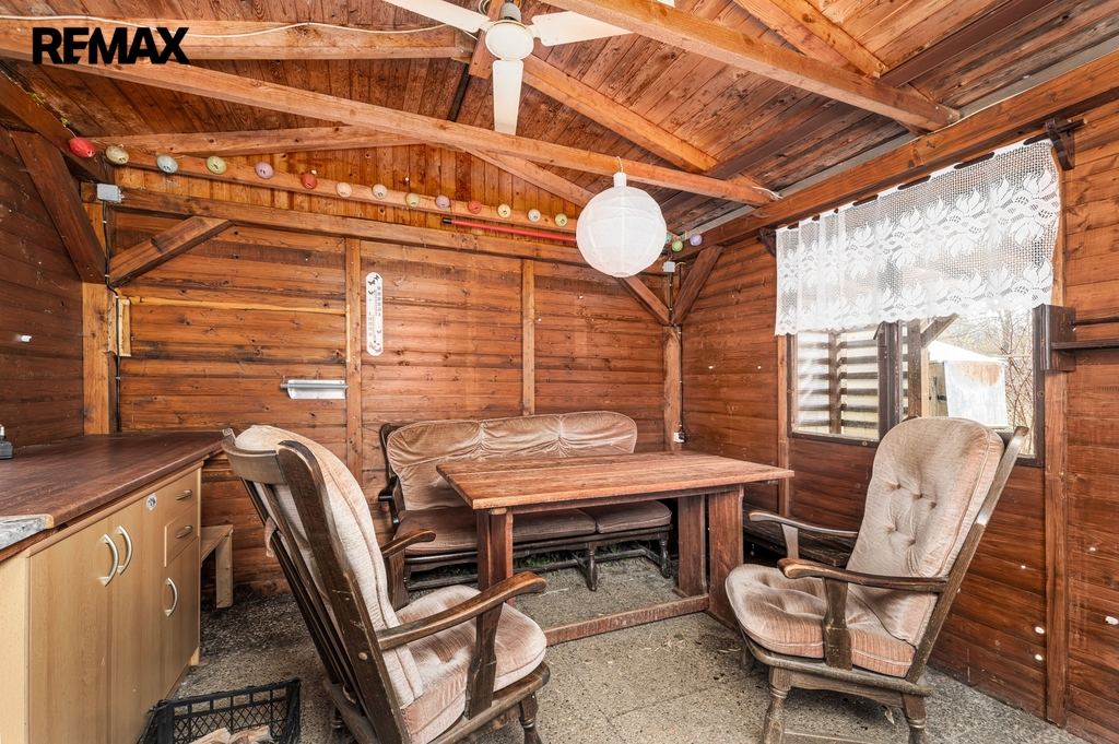 - dřevěný zahradní domek (venkovní kuchyně s posezením a grilem) s navazujícím zahradním altánem