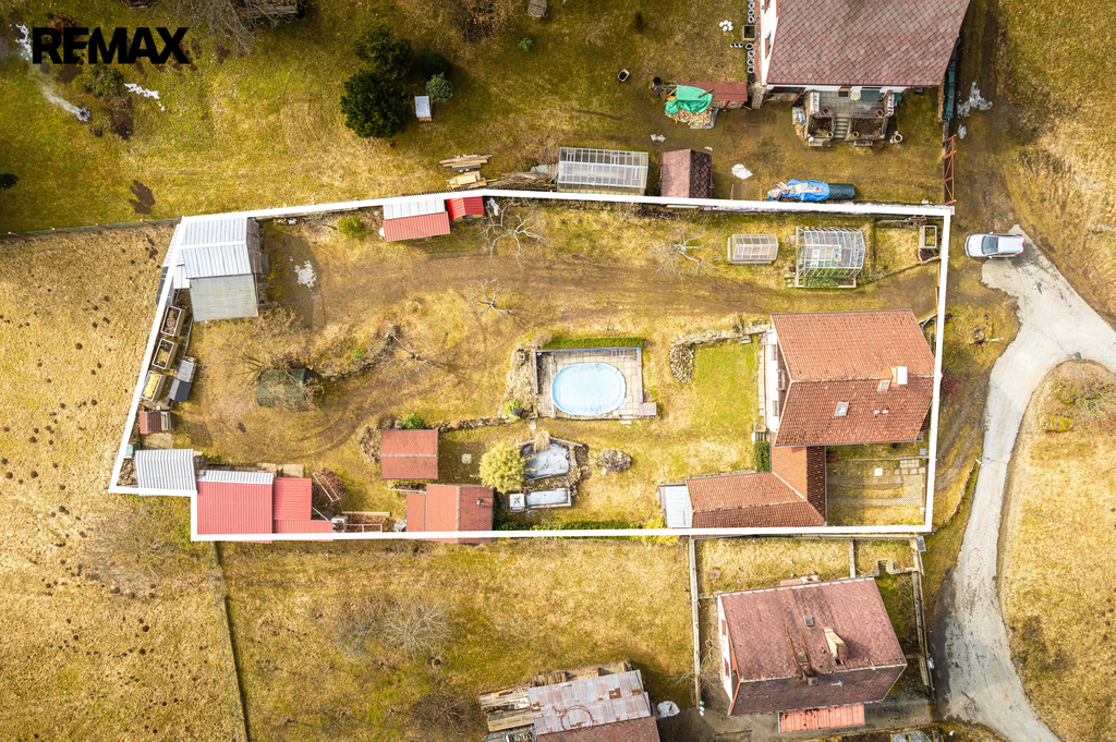 Na pozemku s celkovou plochou 1.376 m2 se nachází hlavní obytná stavba (kolaudována jako stavba pro rodinou rekreaci a cca 15 roků využívána pro trvalé bydlení) s vedlejšími a doplňkovými objekty, příslušenstvím a zařízením.