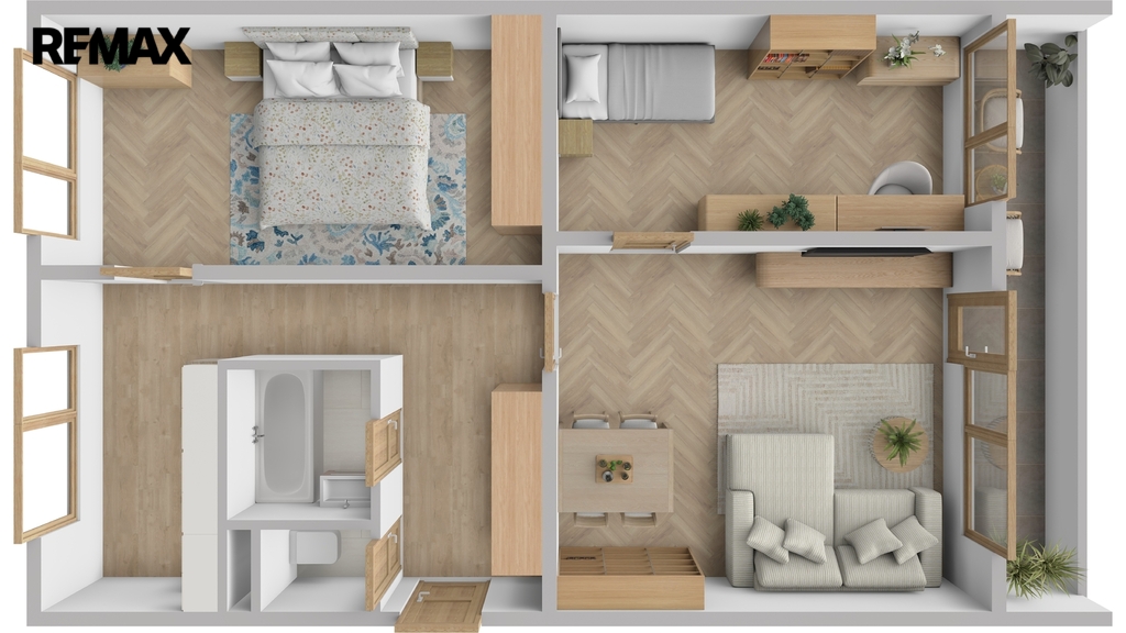• Dispozice: byt má tři pokoje, samostatnou kuchyni a prostornou lodžii.