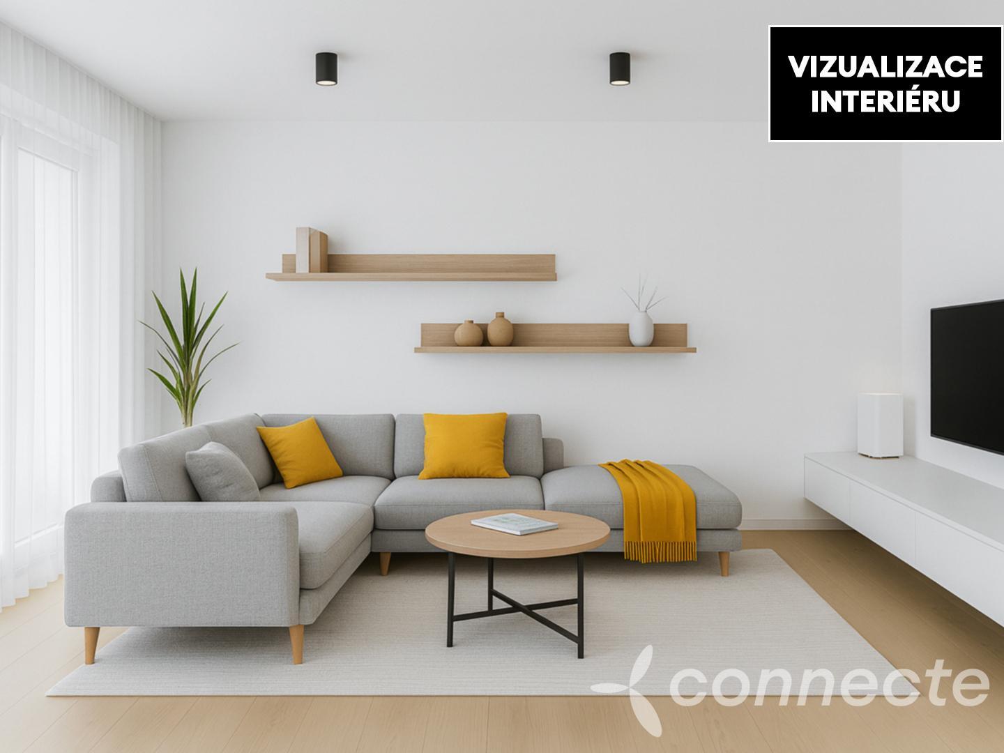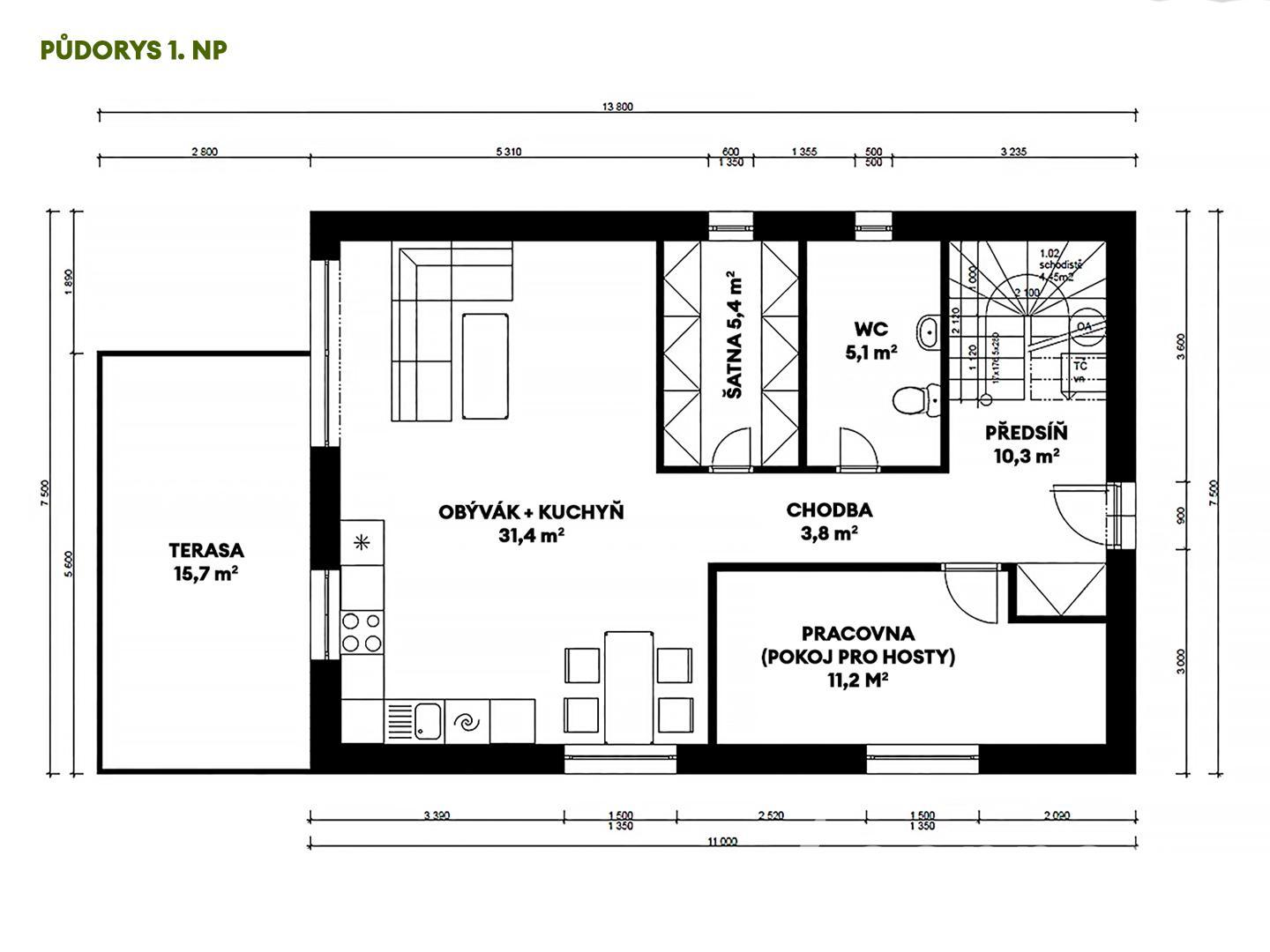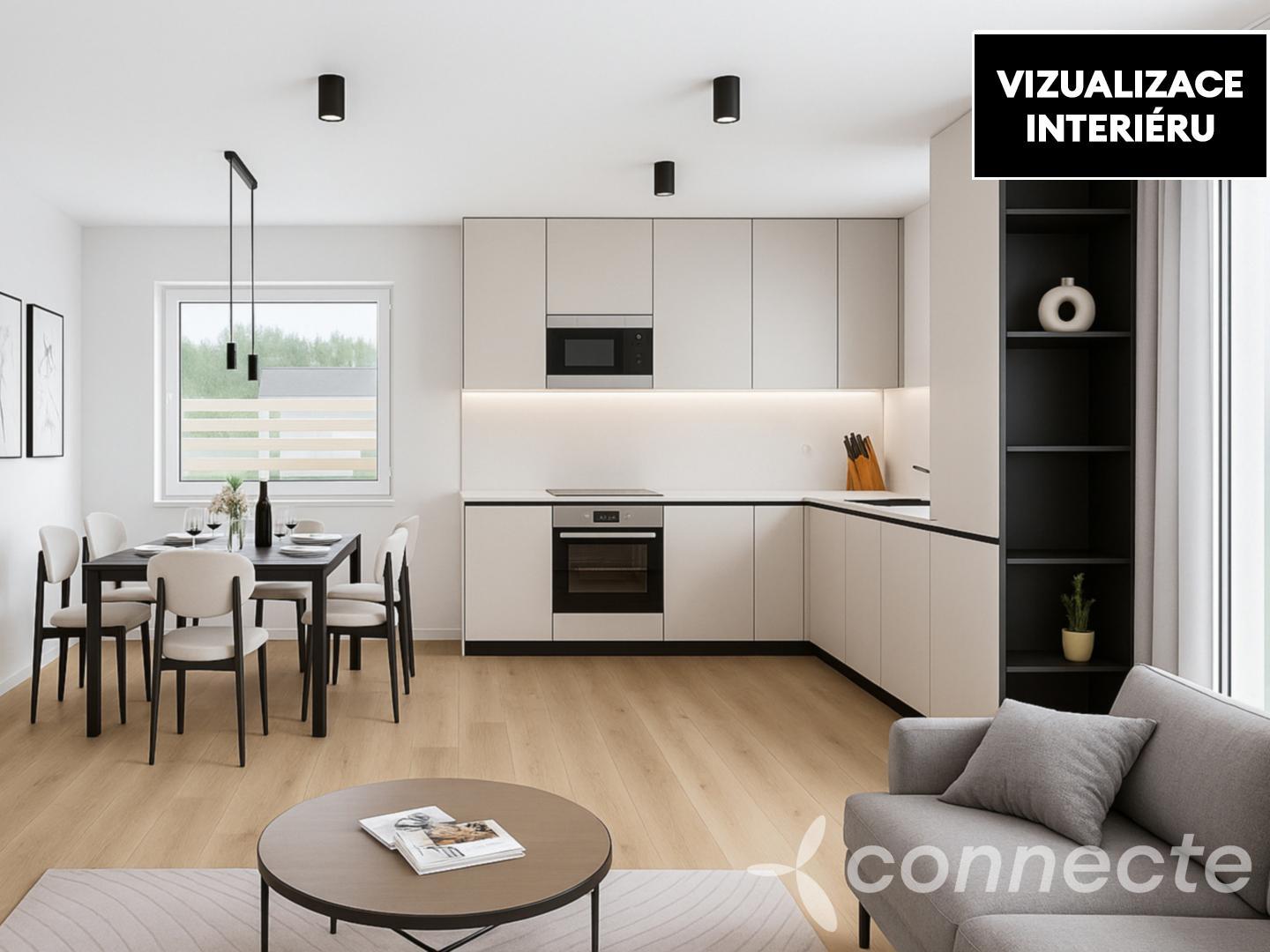- Obývací pokoj s kuchyňským koutem a vstupem na terasu místo, kde bude žít vaše rodina i víkendová setkání s přáteli