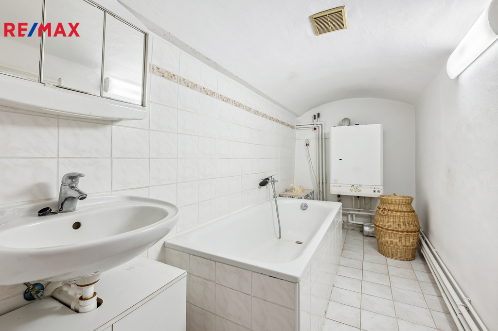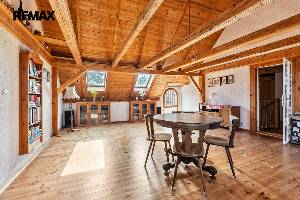 Na stodolu navazuje rodinný dům. V prvním patře se nachází dvě útulné ložnice, kuchyň, koupelna a místnost o ploše 38 m², která se perfektně hodí jako rodinná jídelna, ateliér, herna nebo třeba prostor pro podnikání. V horním patře najdete další ložnici, světlý obývací pokoj a druhou koupelnu. Dům je vytápěn plynovým kotlem, kotlem na tuhá paliva a krbem, který dodává interiéru příjemnou atmosféru.