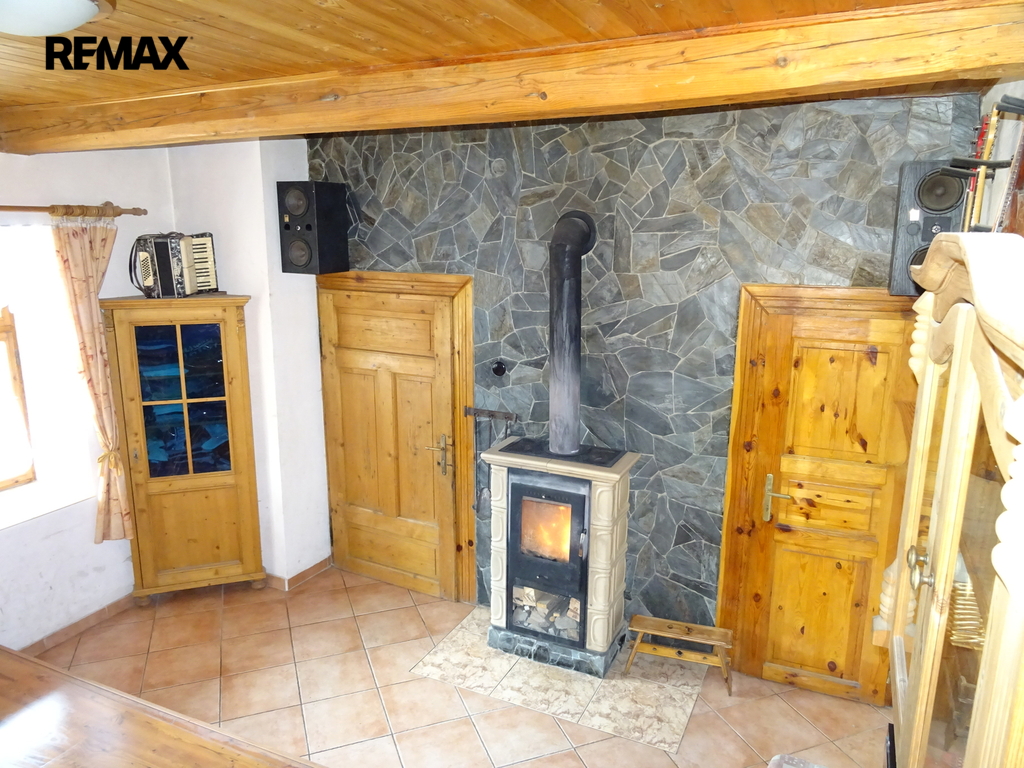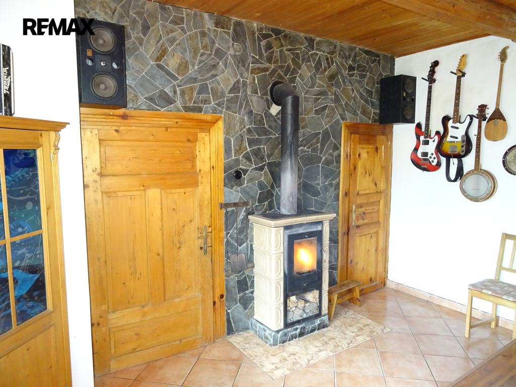 Topení zajišťují krbová kamna.
