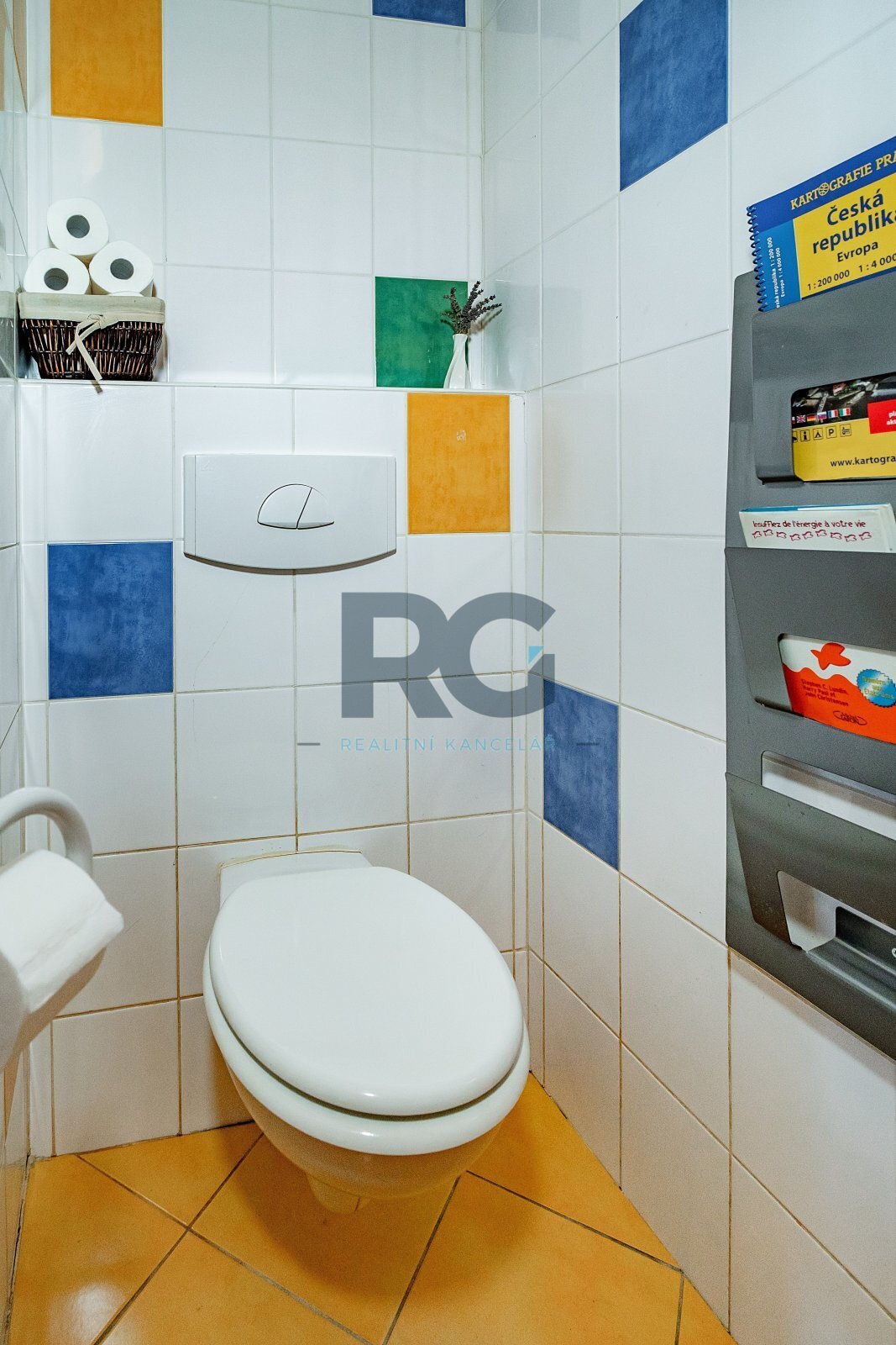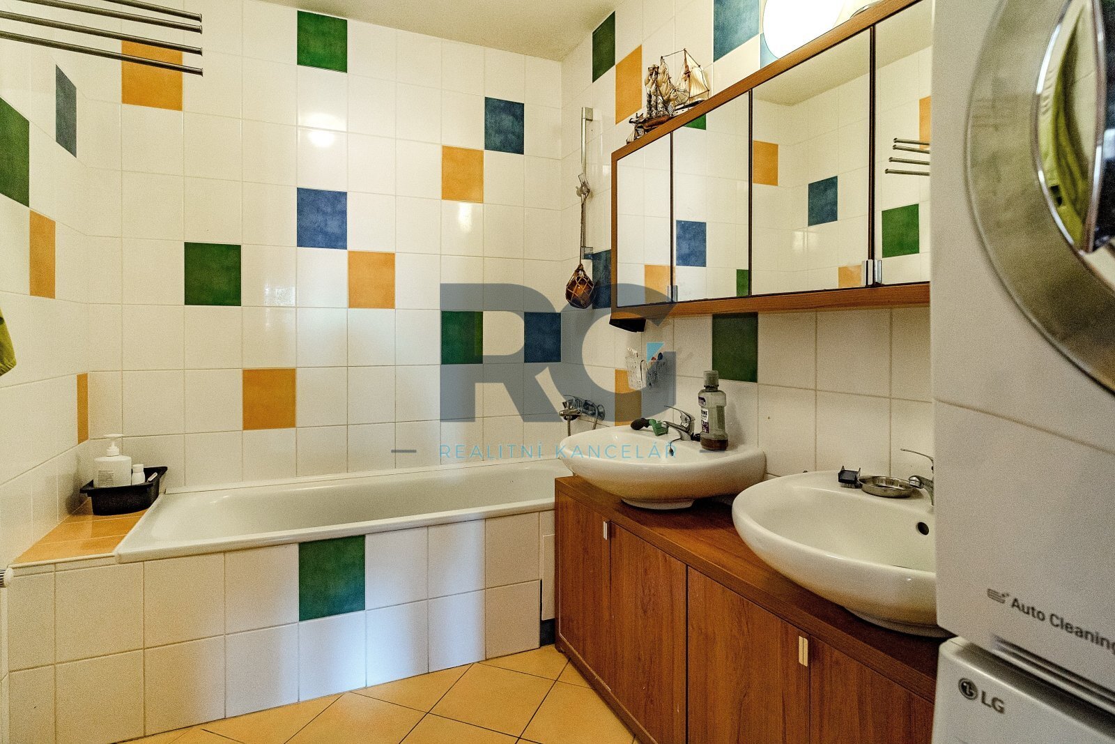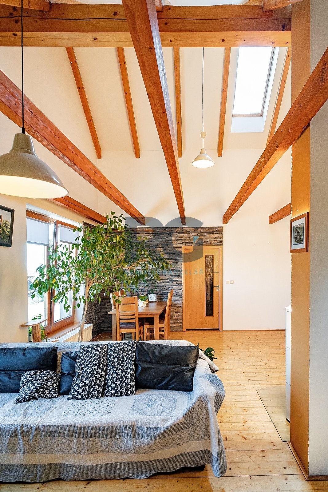 Jedna z ložnic disponuje samostatnou koupelnou se sprchovým koutem, umyvadlem a toaletou; druhá koupelna, se vstupem z haly, je s vanou, umyvadlem a přípojkou na pračku. Druhá toaleta je samostatná. Hala bytu poskytuje dostatek úložného místa, stejně tak půdní prostor o výměře 35 m2 přístupný po žebříku z haly. V obývacím prostoru, díky vysokým stropům do krovu, lze umístit vestavbu a vytvořit tak další obytnou část.