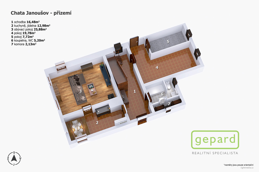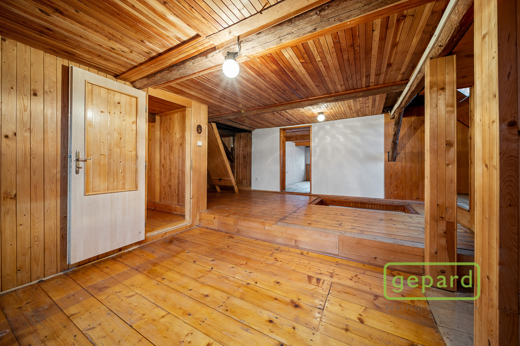 Dispozice: 1NP světnice, obývací pokoj, 2 místnosti ideální pro přizpůsobení na pokoje, nebo wellness, koupelna s toaletou, spíž. 2NP 2 samostatné ložnice, velká místnost s možností dalších lůžek a terasa. K chalupě náleží stodola pro uskladnění dřeva a na pozemku stojí i dřevěná kůlna sloužící jako zahradní domek.