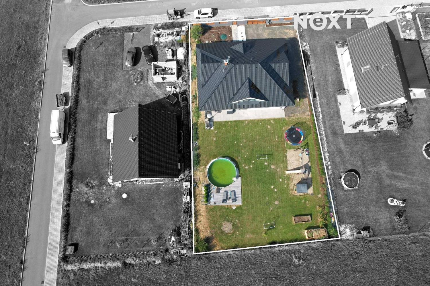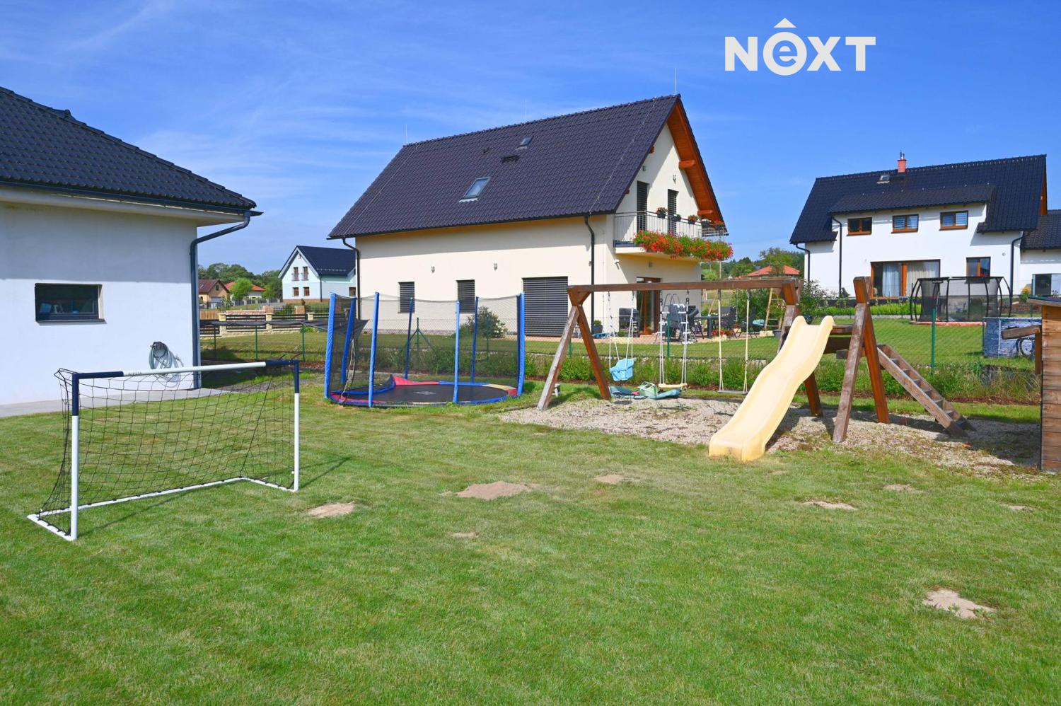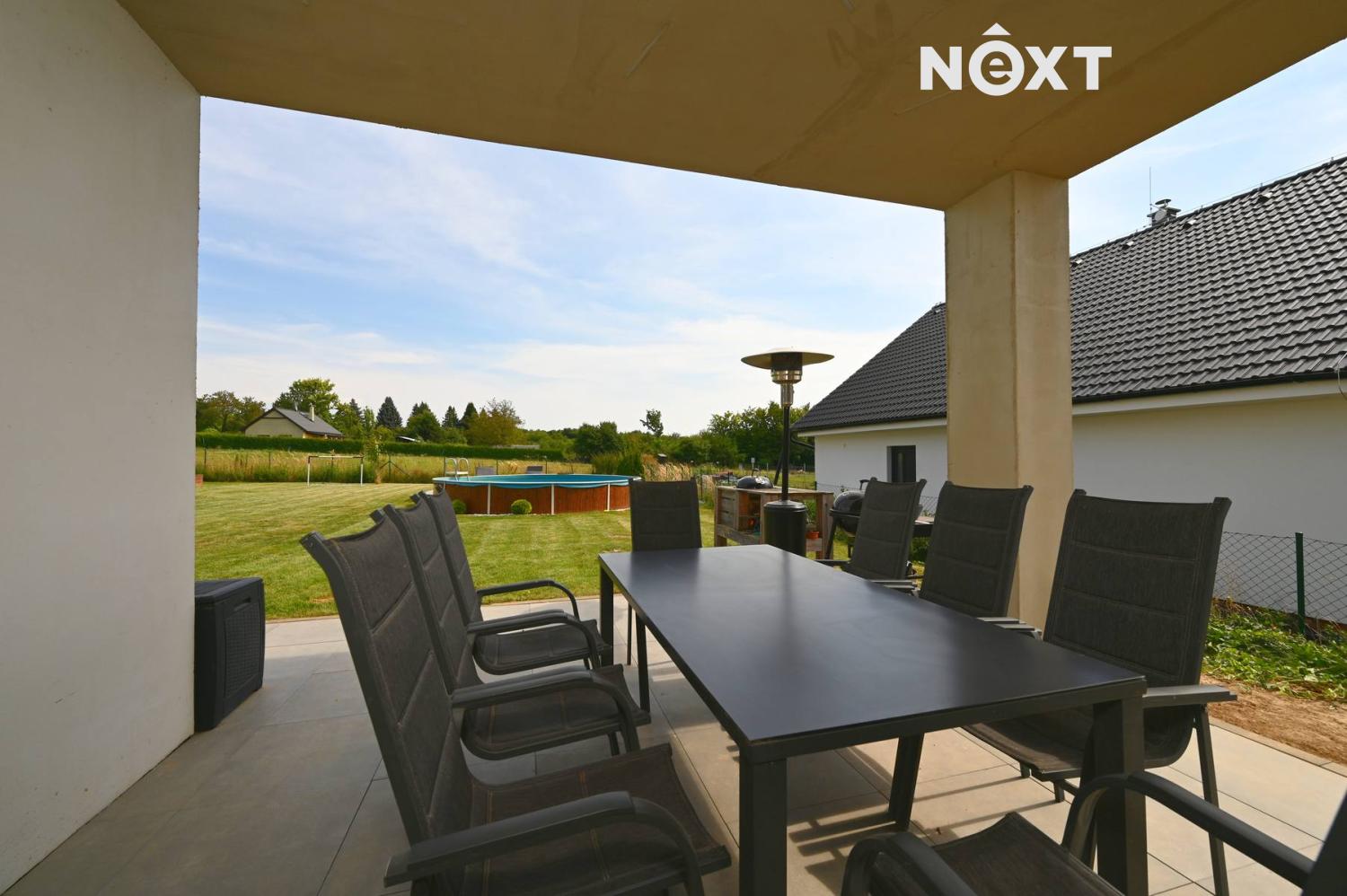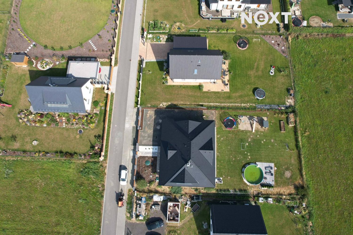 Pozemek o výměře 1.001 m² je pečlivě udržovaný a nabízí soukromí i prostor pro rodinný život. Najdete zde dětské hřiště s bazénem a dominantní zastřešenou terasu s posezením a nočním osvětlením. Celý pozemek je oplocen a vybaven elektrickou vjezdovou bránou na dálkové ovládání.