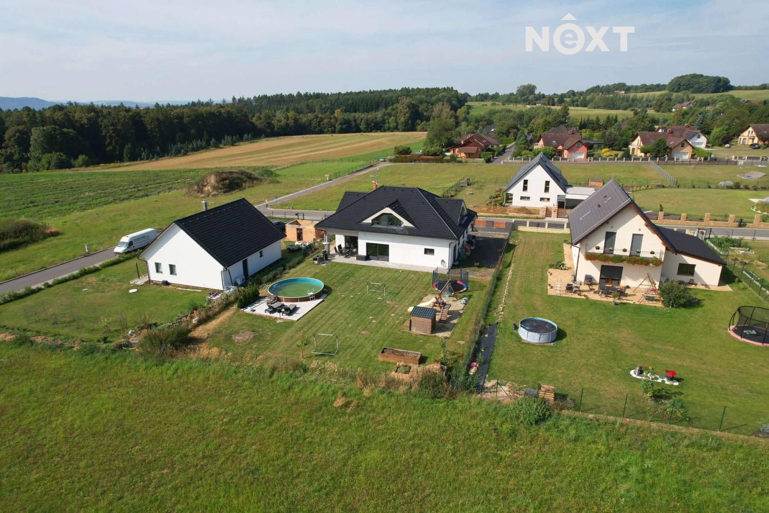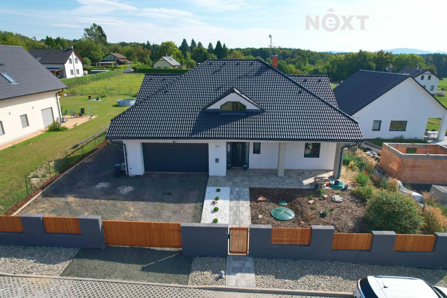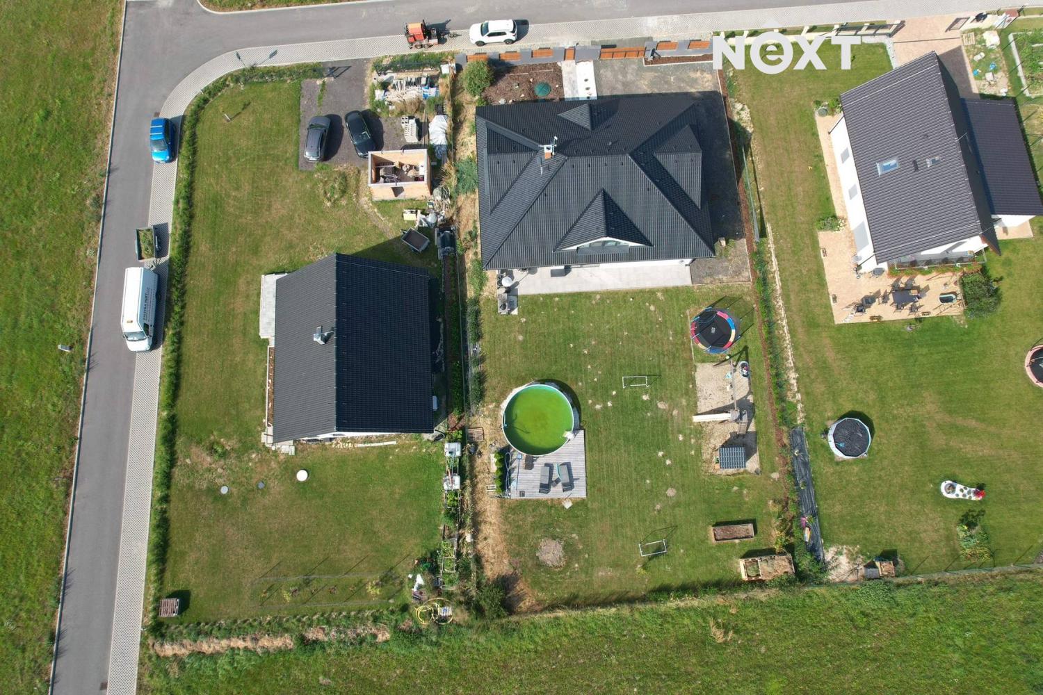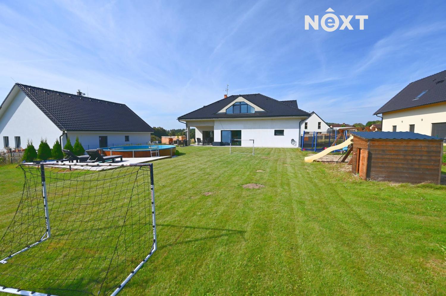 Pozemek o výměře 1.001 m² je pečlivě udržovaný a nabízí soukromí i prostor pro rodinný život. Najdete zde dětské hřiště s bazénem a dominantní zastřešenou terasu s posezením a nočním osvětlením. Celý pozemek je oplocen a vybaven elektrickou vjezdovou bránou na dálkové ovládání.