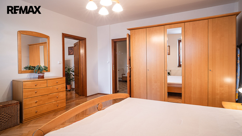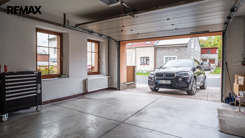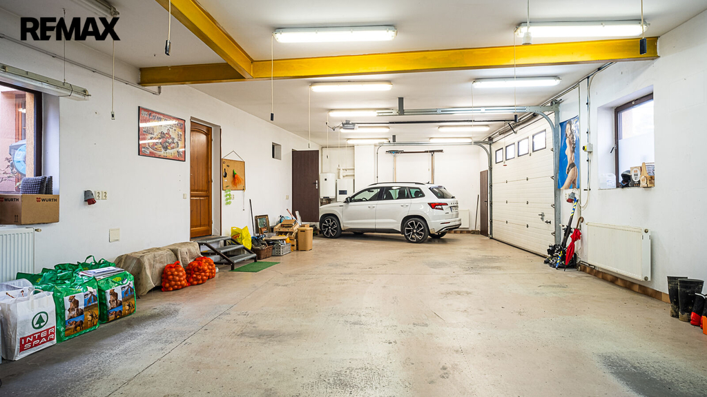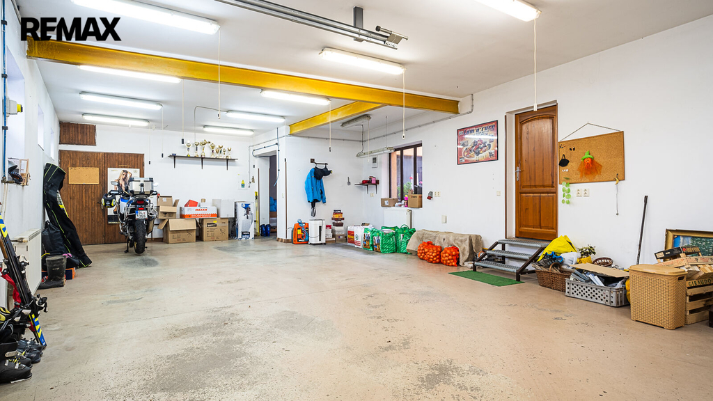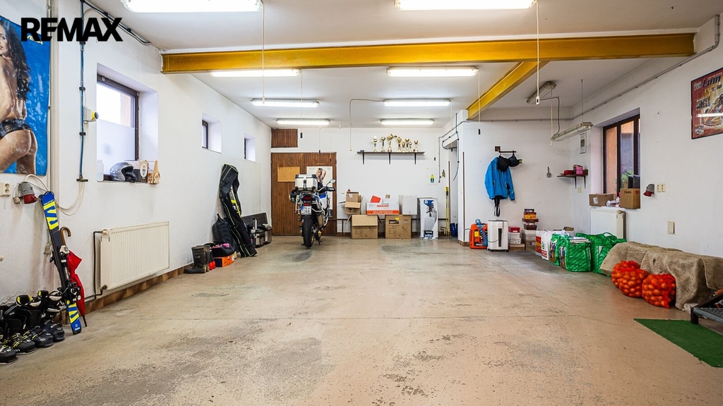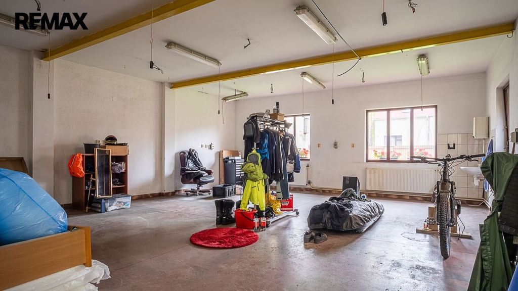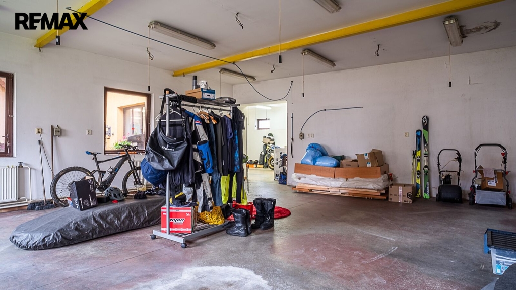 Součástí nemovitosti jsou prostorné garáže s místem pro několik vozů, dílny pro kutily nebo podnikání, a další úložné prostory. Kromě hlavní obytné části s několika pokoji a dvěma koupelnami je zde také dostatek místa pro domácí kancelář, posilovnu či hernu.