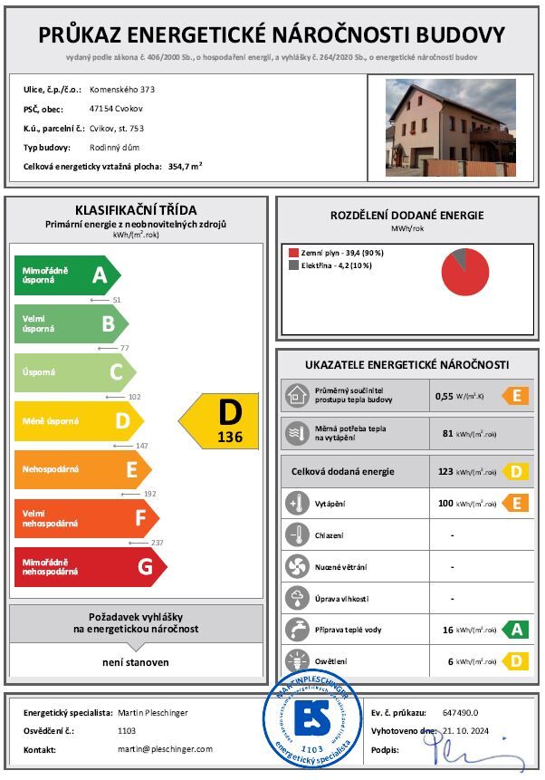 - Ukazatel energetické náročnosti budovy: 136 kWh/m²