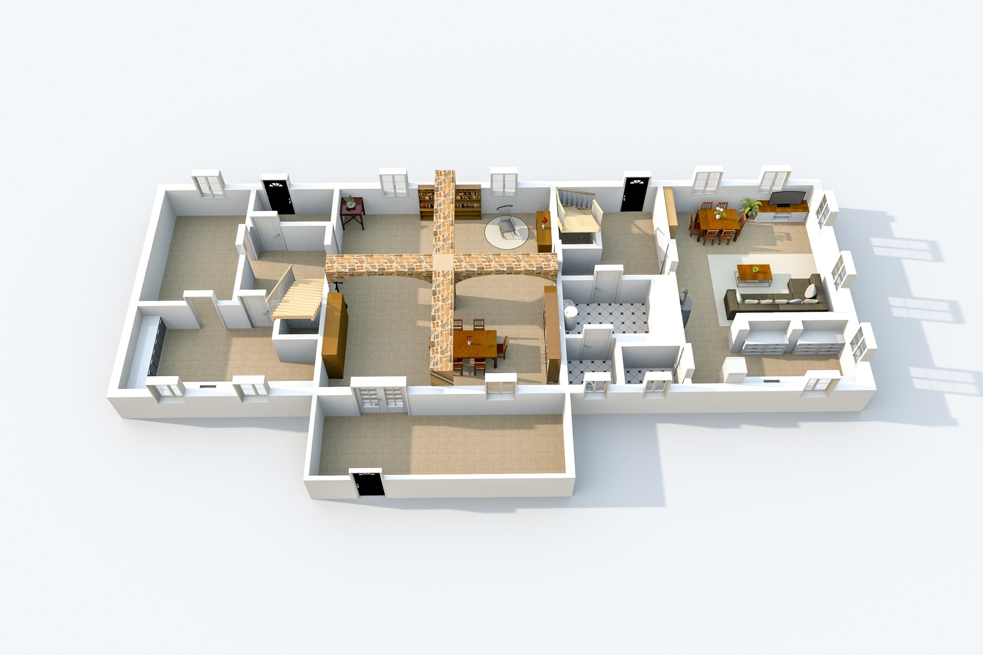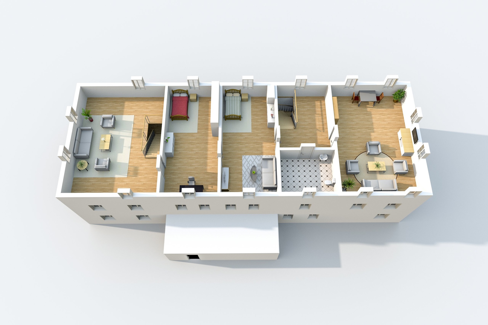 Dům má zastavěnou plochu 280 m² a stejně velké obytné patro. Rozdělen na dvě samostatné bytové jednotky: