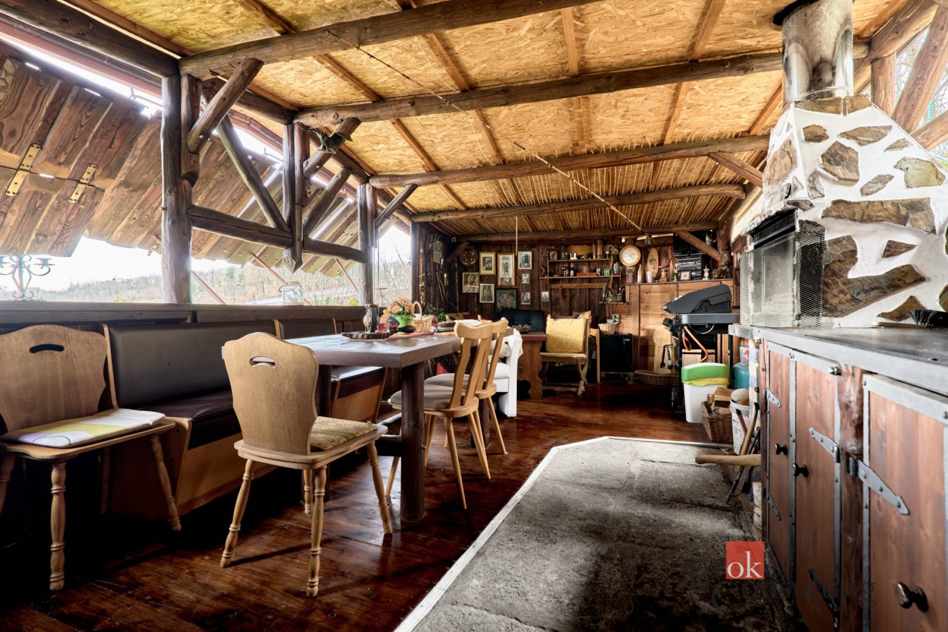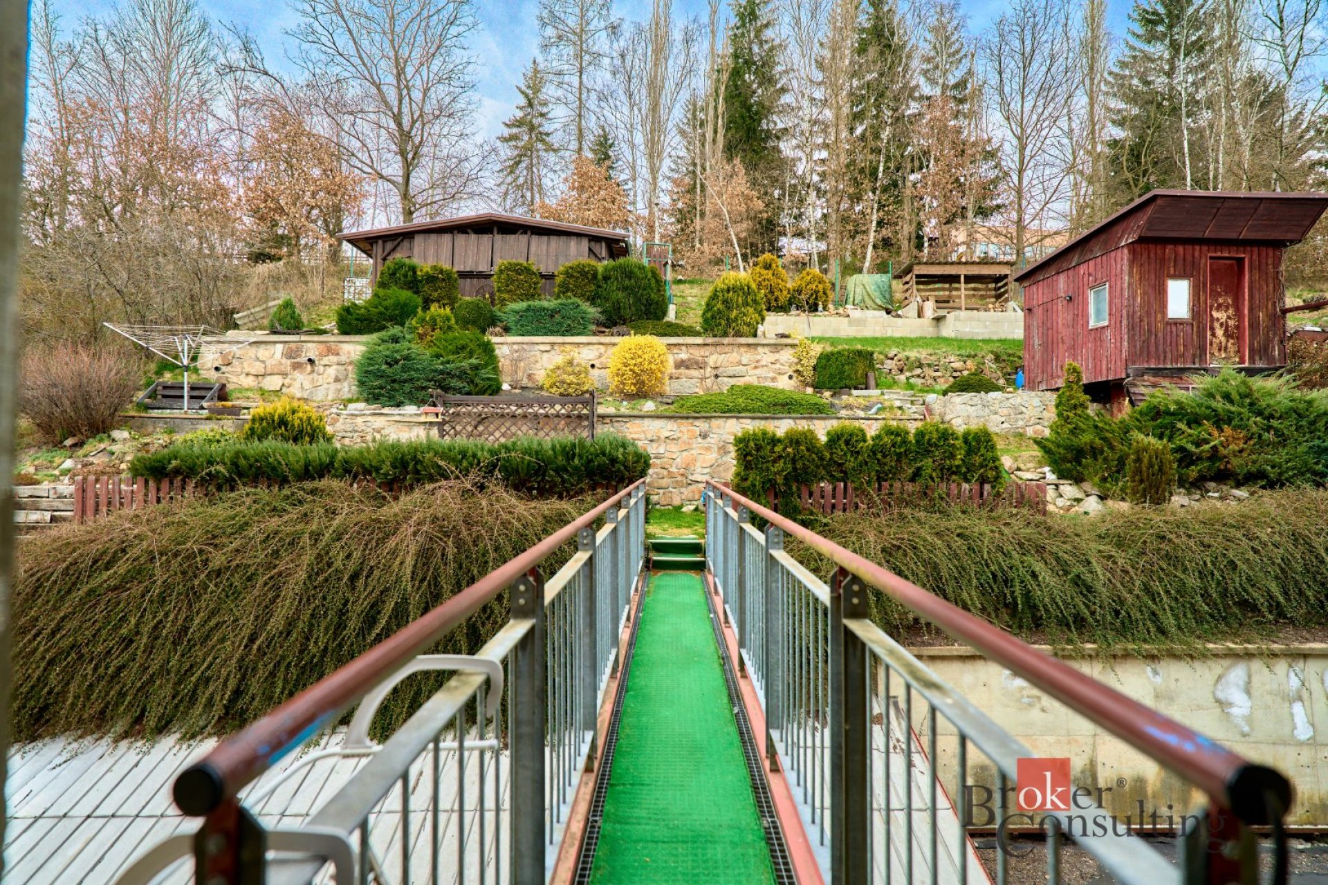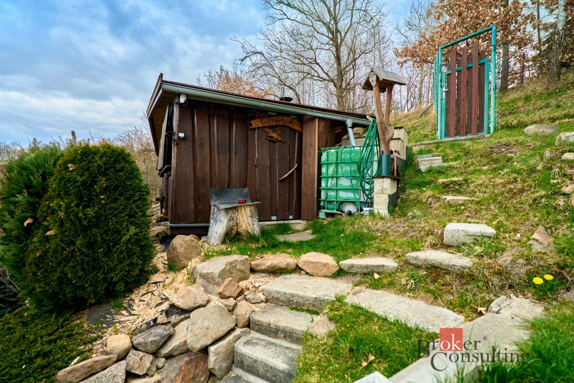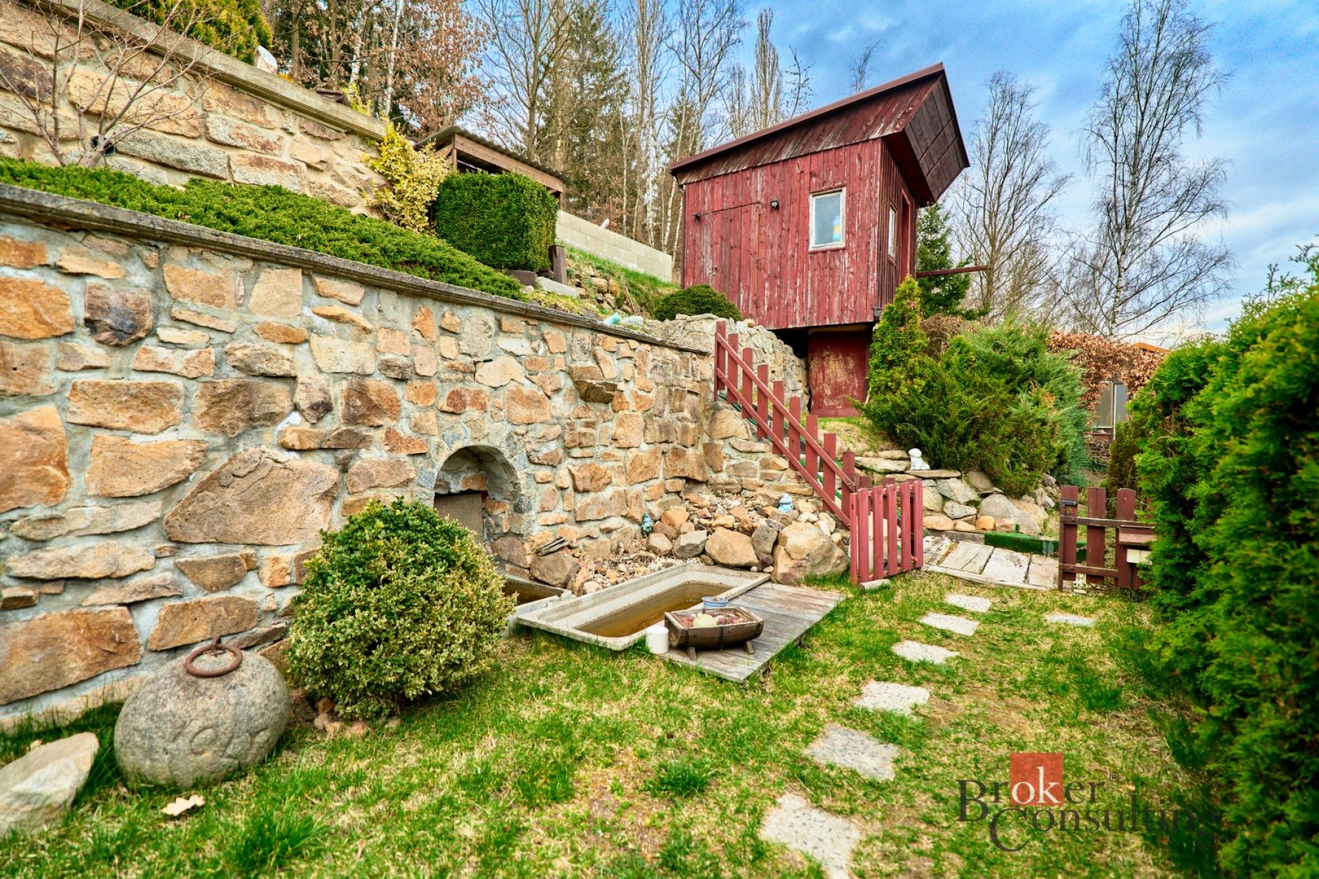 Na zahrádce se nachází „srub“ s letní kuchyní krbem a posezení, které umožňuje nerušený odpočinek a relaxaci.
