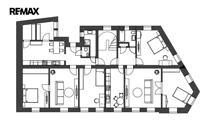 • 2.-4.NP – 6 velkometrážních bytů (3x3+1 o výměře 86,16 m2 a 3x3+1 o výměře 97,3 m2). Všechny byty jsou pronajaty. Vstup do bytové části je samostatný a oddělený od obchodní části. Vstupní prostor a chodba je po revitalizaci. Byty lze koupit i jednotlivě nebo jako balíček dohromady.