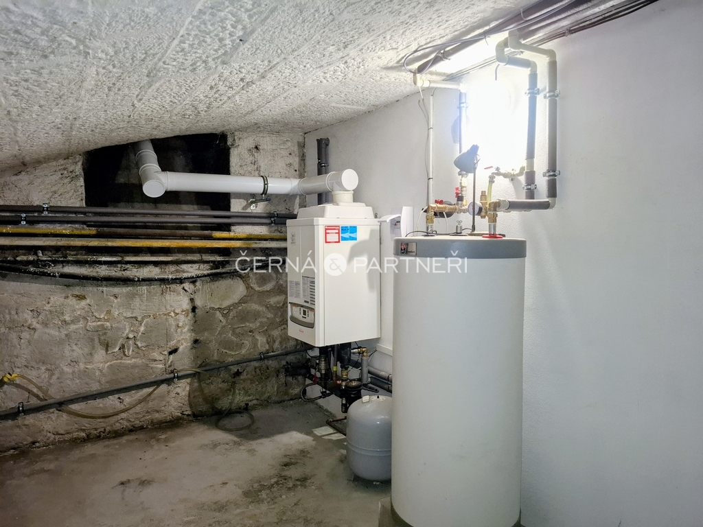 Celý objekt je podsklepen. Zde je osazený nový plynový kotel s ohřevem vody. Vytápění prostor je funkční. Dům je napojen na městský vodovod a kanalizaci. Je připojený elektrický proud a plyn.