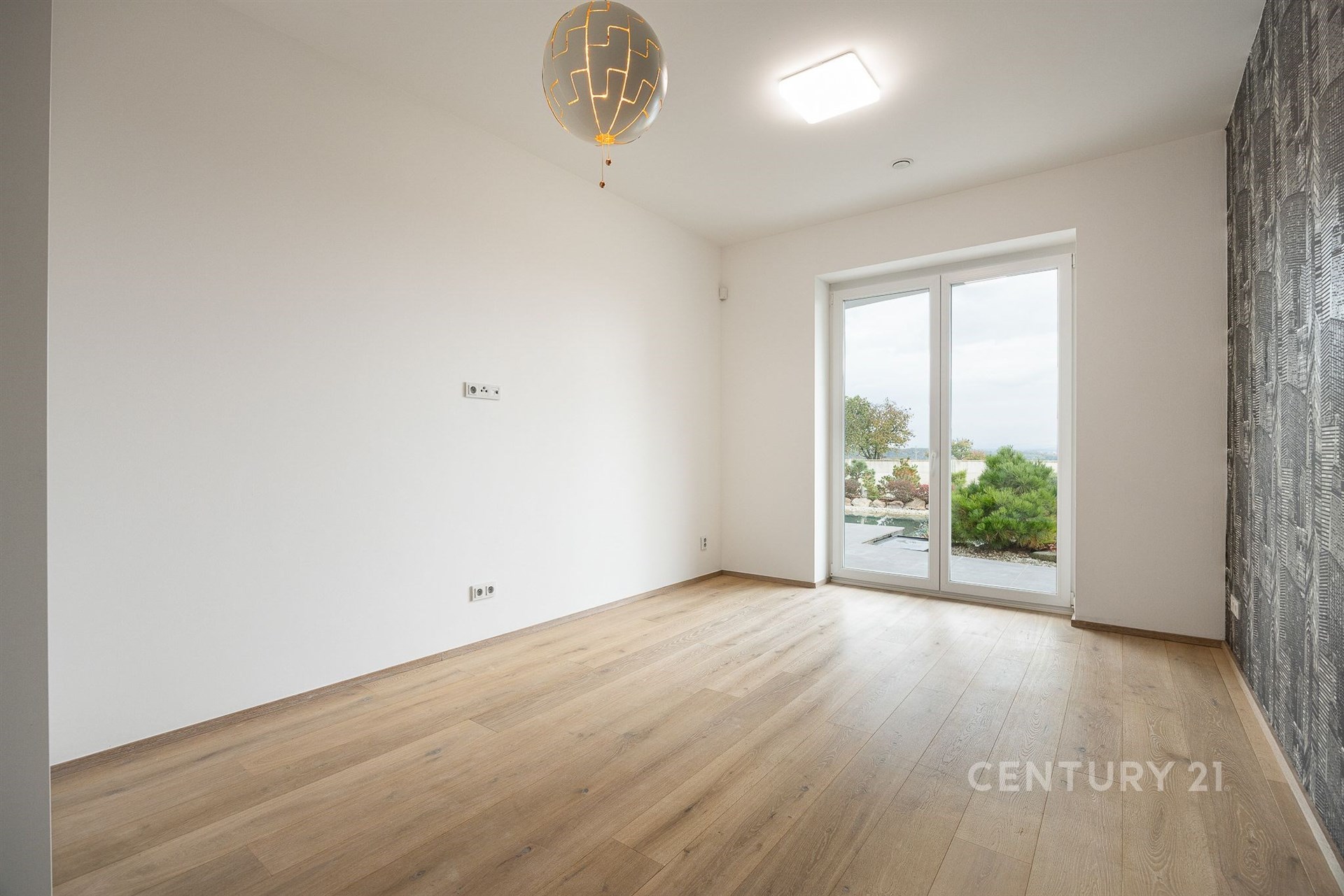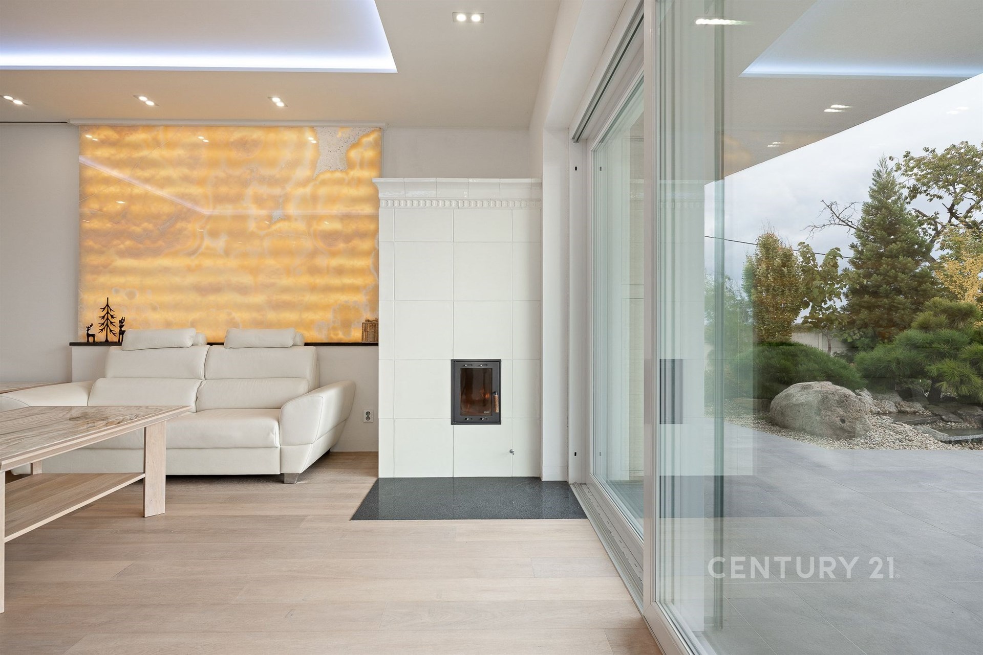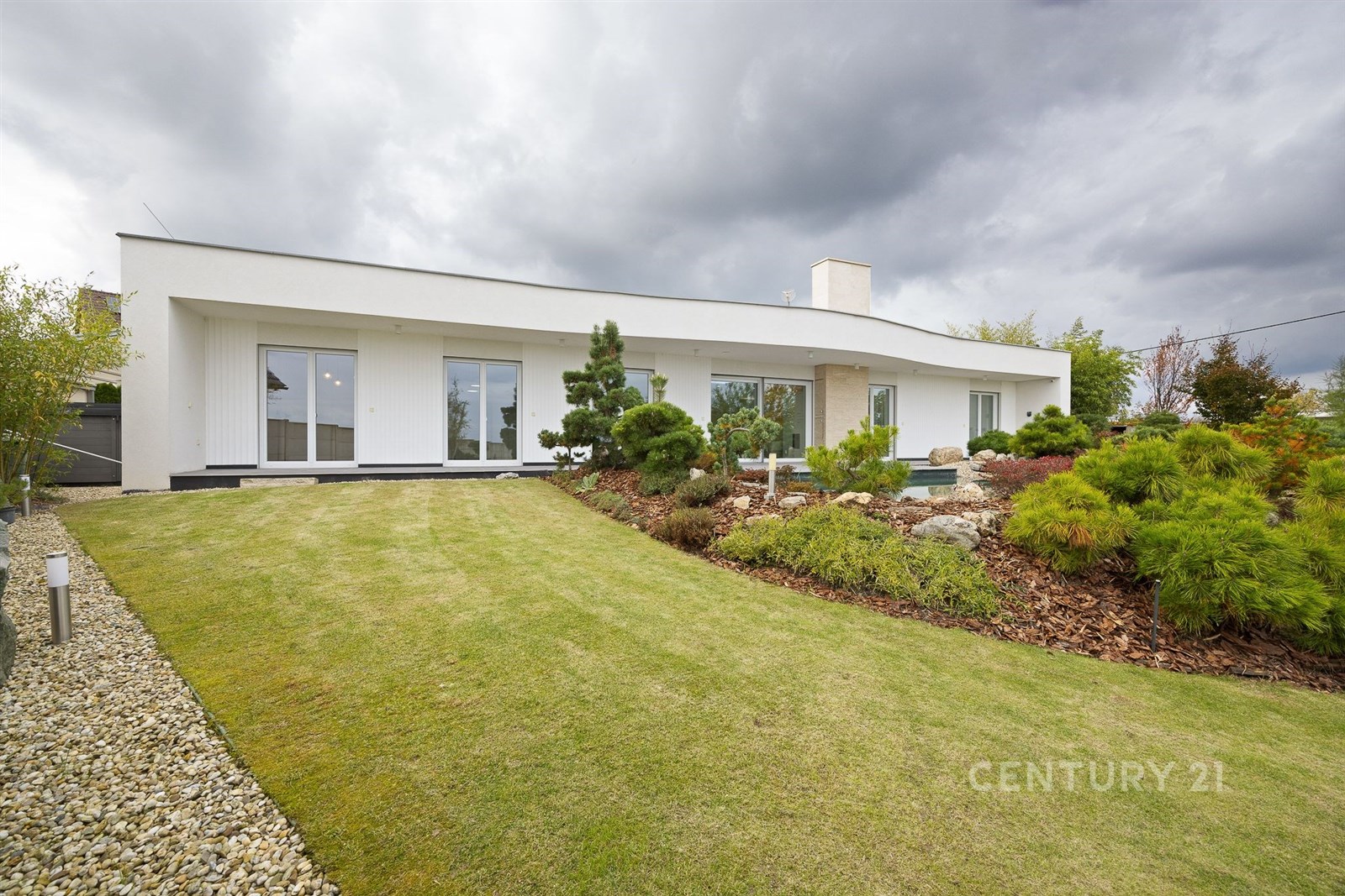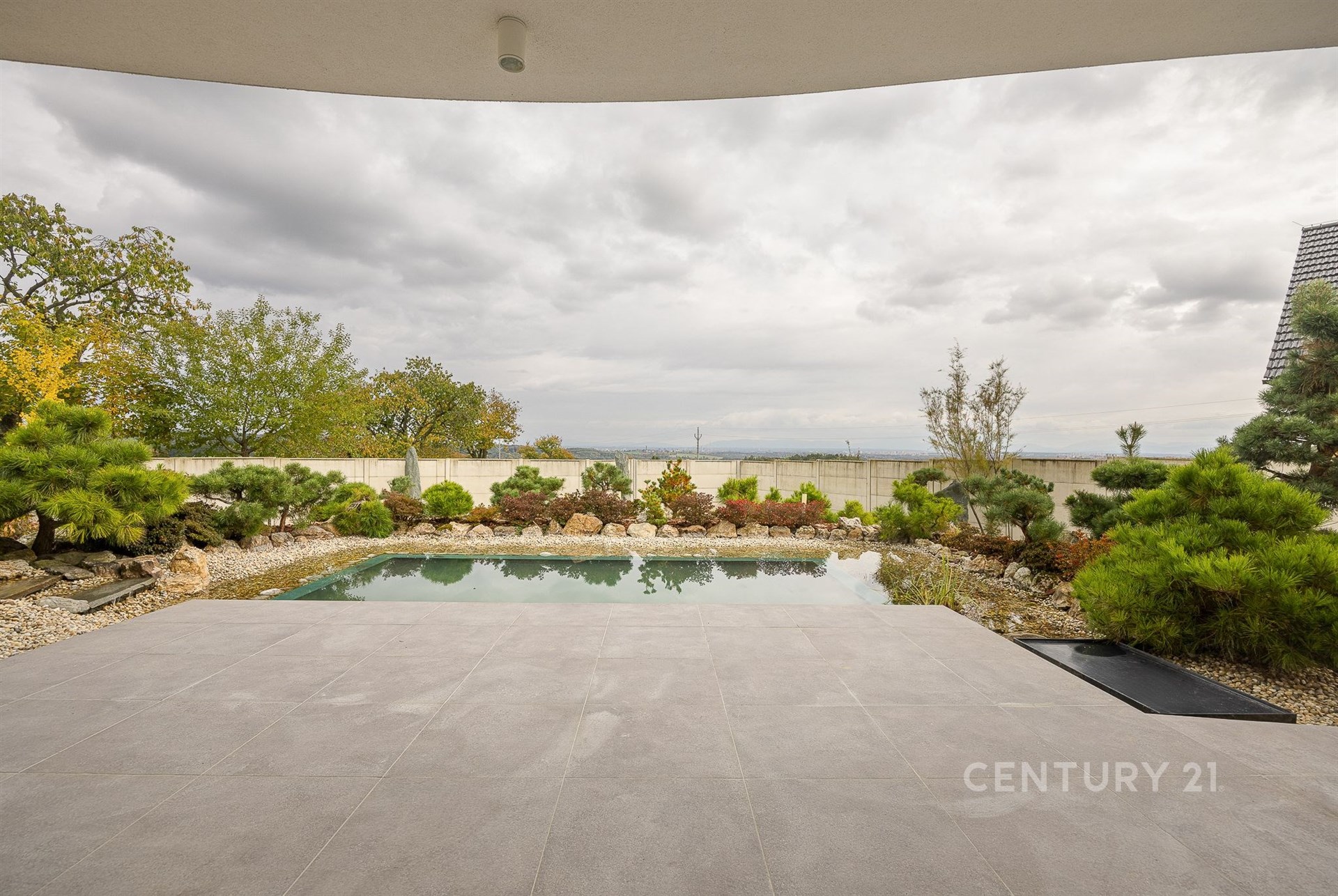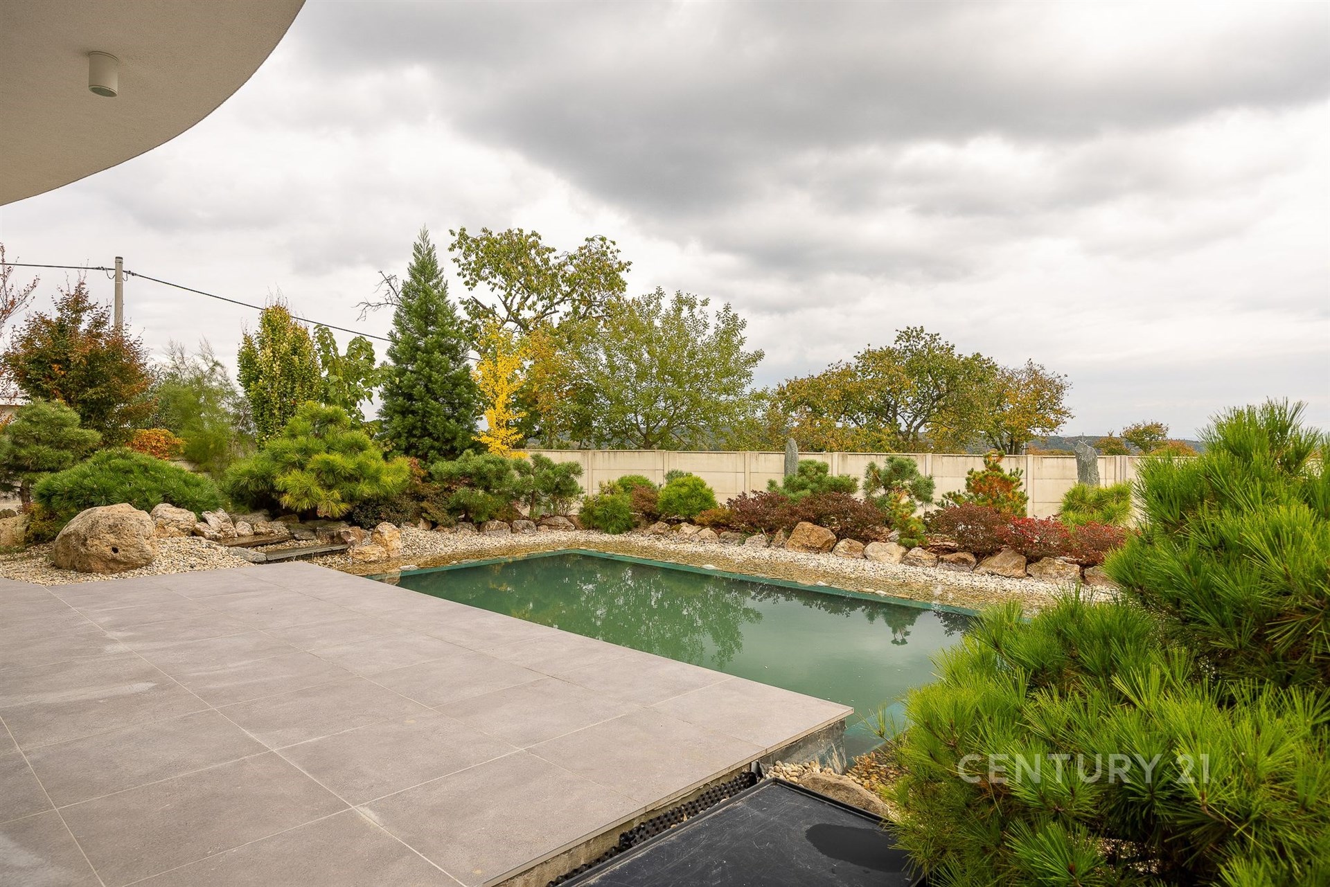 Dominantou je velkorysý obývací pokoj s kuchyní a jídelnou o rozloze 57 m², jehož atmosféru podtrhují designová kachlová kamna a přímý vstup na terasu se zahradním koupacím biotopem obklopeným skalkou. Vedle stavby se nachází vyhřívaný bazén s protiproudem a masážními tryskami, zastřešený elektricky ovládanou pergolou s boční clonou, která umožňuje využití i v chladnějším počasí. Na zahradě nechybí ani samostatná sauna – ideální místo pro relaxaci, klid a soukromí.