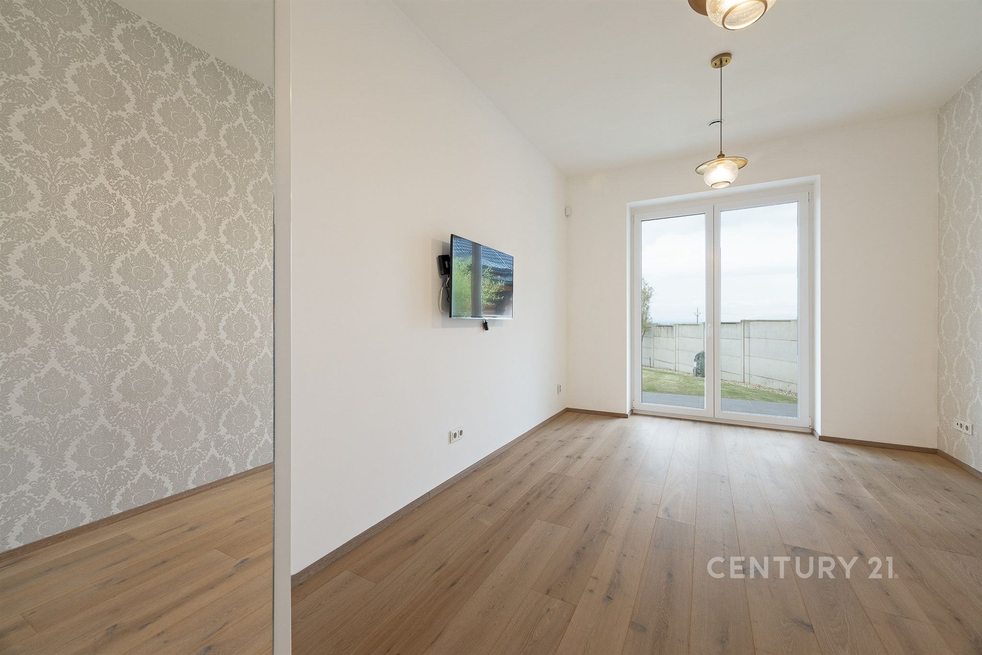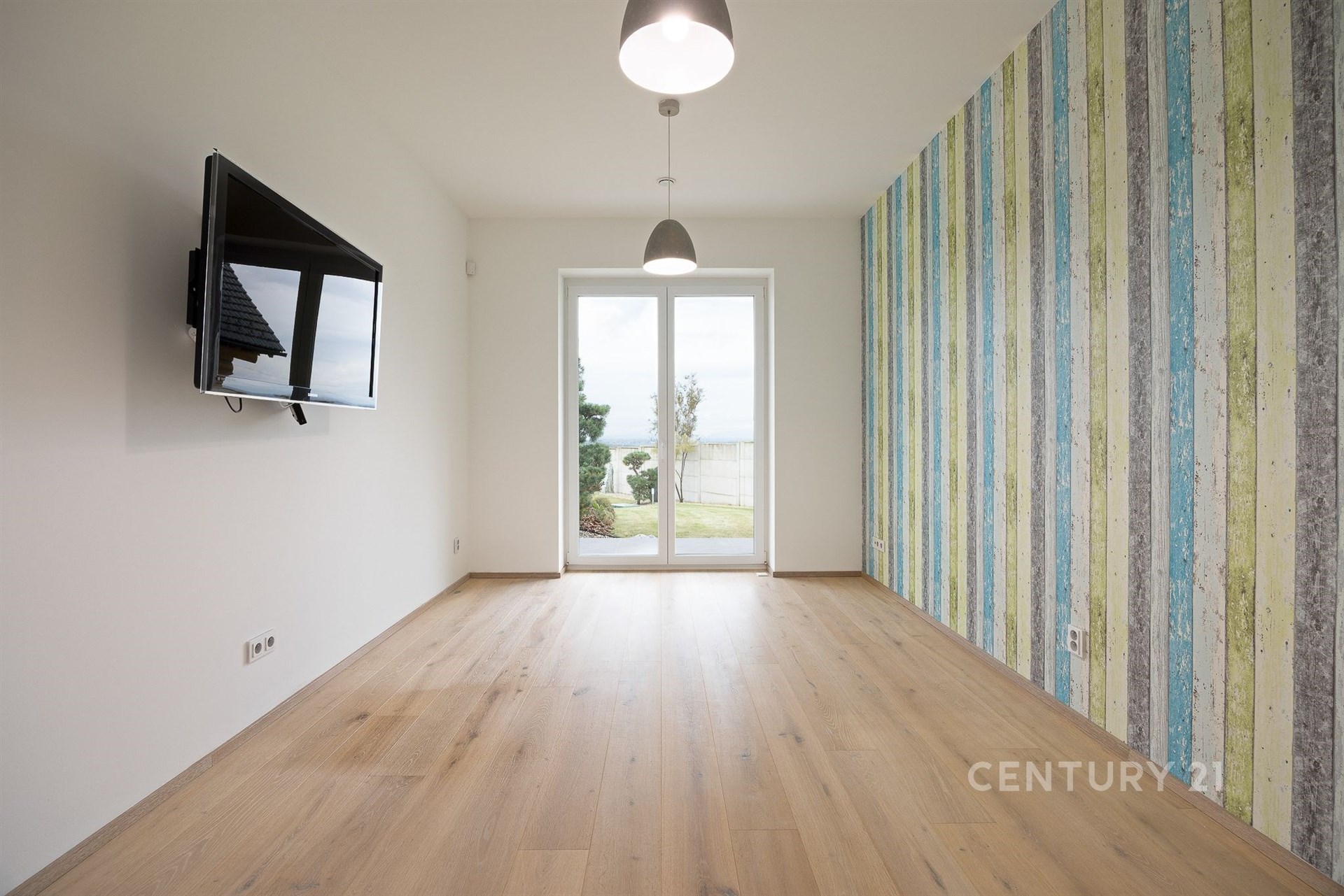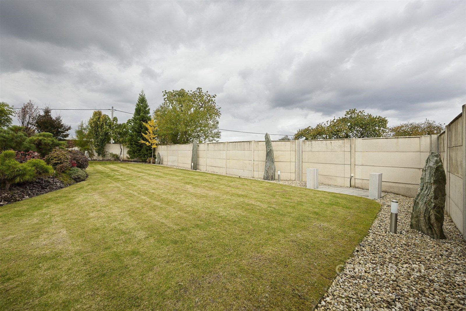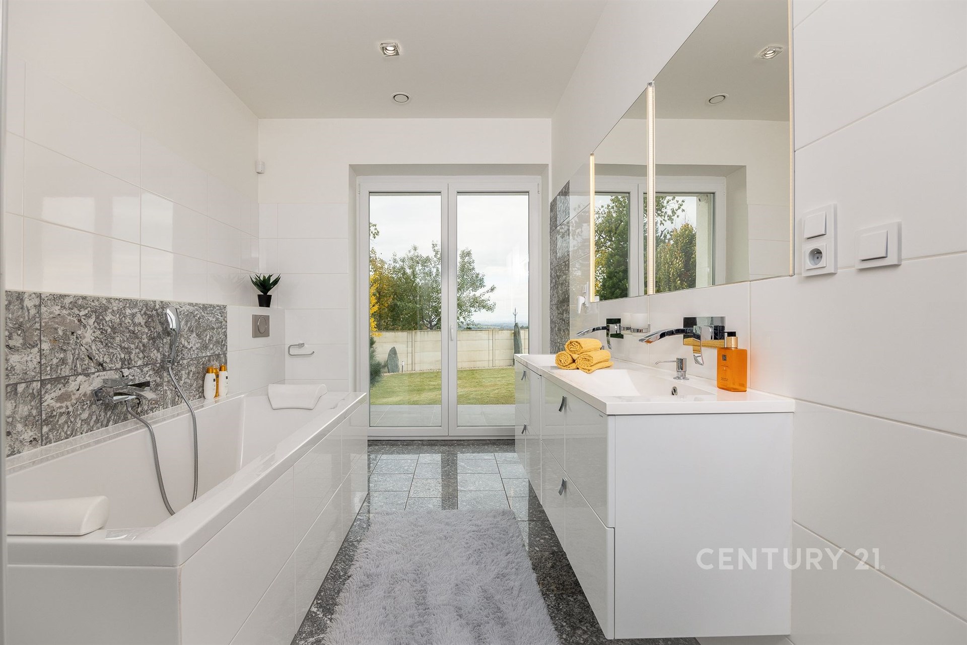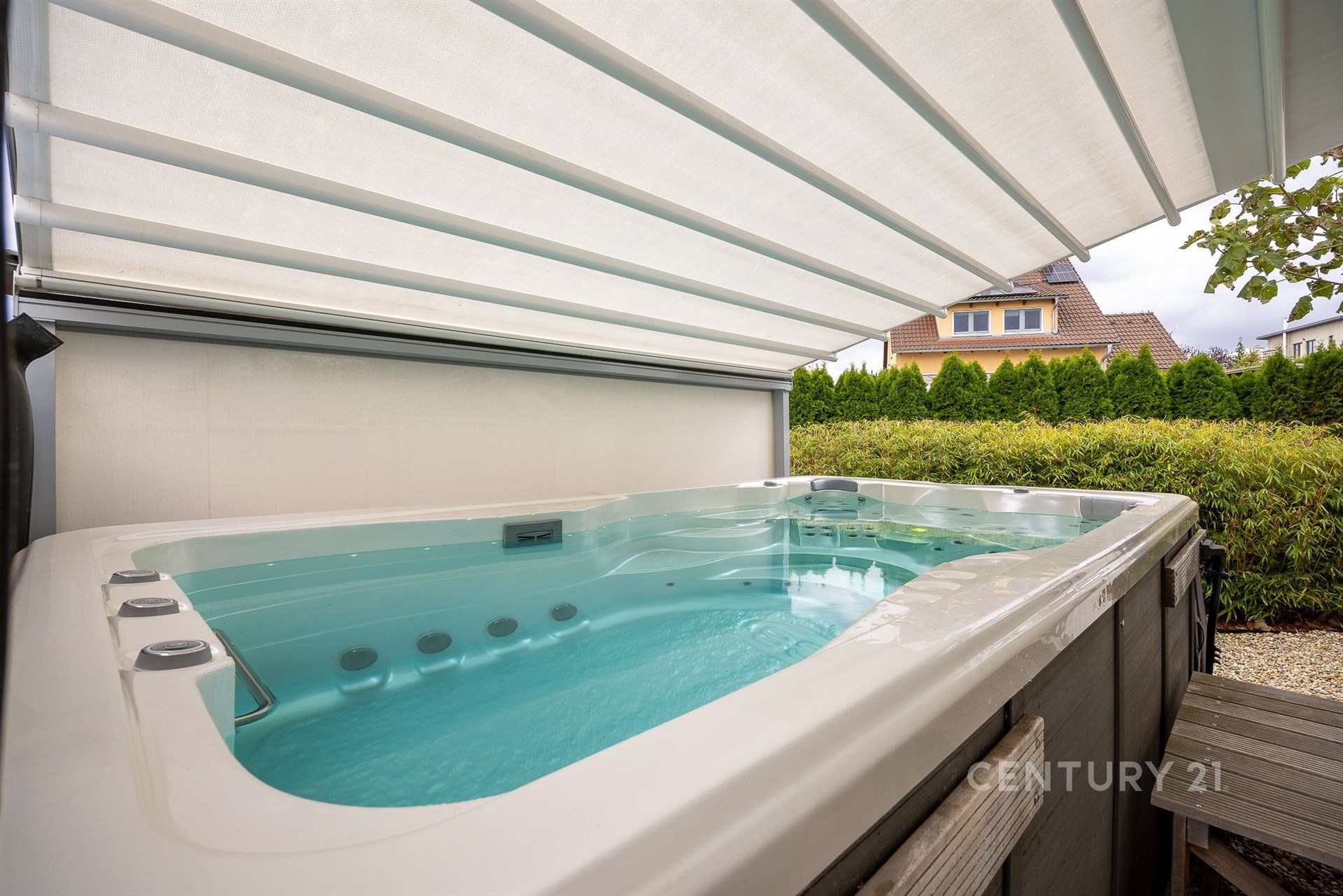 Dominantou je velkorysý obývací pokoj s kuchyní a jídelnou o rozloze 57 m², jehož atmosféru podtrhují designová kachlová kamna a přímý vstup na terasu se zahradním koupacím biotopem obklopeným skalkou. Vedle stavby se nachází vyhřívaný bazén s protiproudem a masážními tryskami, zastřešený elektricky ovládanou pergolou s boční clonou, která umožňuje využití i v chladnějším počasí. Na zahradě nechybí ani samostatná sauna – ideální místo pro relaxaci, klid a soukromí.