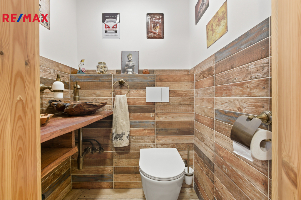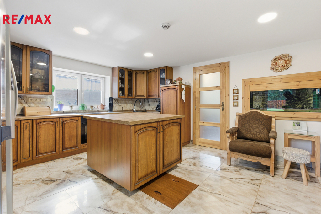 Interiér domu je laděný v přírodním stylu – dřevo dominuje podlahám, stropům i vestavěnému nábytku. První patro nabízí pracovnu, moderní koupelnu s WC, kuchyň, která důmyslně ukrývá pod posunovacím ostrůvkem sklep o velikosti 6m2 (zajištěno odvětrávání-cirkulace vzduchu), hernu pro děti, prostorný obývací prostor s jídelnou a kuchyní v otevřeném konceptu, technické zázemí a garáž. Kuchyňská linka na míru, bohaté úložné prostory, rustikální doplňky, krbová kamna a velké akvárium pod televizí tvoří jedinečnou atmosféru. Ve druhém patře najdeme několik ložnic a koupelnu s WC. Schodiště a detaily z masivu vytváří útulný, ale zároveň reprezentativní vzhled. Nad garáží je prostorná půda (cca 40m2) a nad domem také (cca 80m2), na kterou je přivedené topení což nabízí další možnost vybudovat podkrovní pokoje. Dům je moderně vybavený co se tyká ovládání. Má kamerový systém kolem celého domu a je napojen na bezpečnostní firmu Jablotron. Video telefon připojeny i ke vzdálenému přihlášení. Elektronické venkovní rolety představují moderní a efektivní řešení pro stínění, zabezpečení a tepelnou izolaci oken. Díky elektrickému pohonu a možnosti automatizace poskytnou maximální komfort a ochranu. Navíc přispívají ke snížení energetických nákladů.