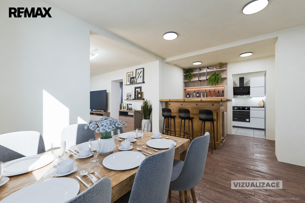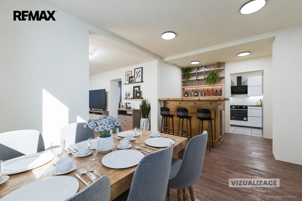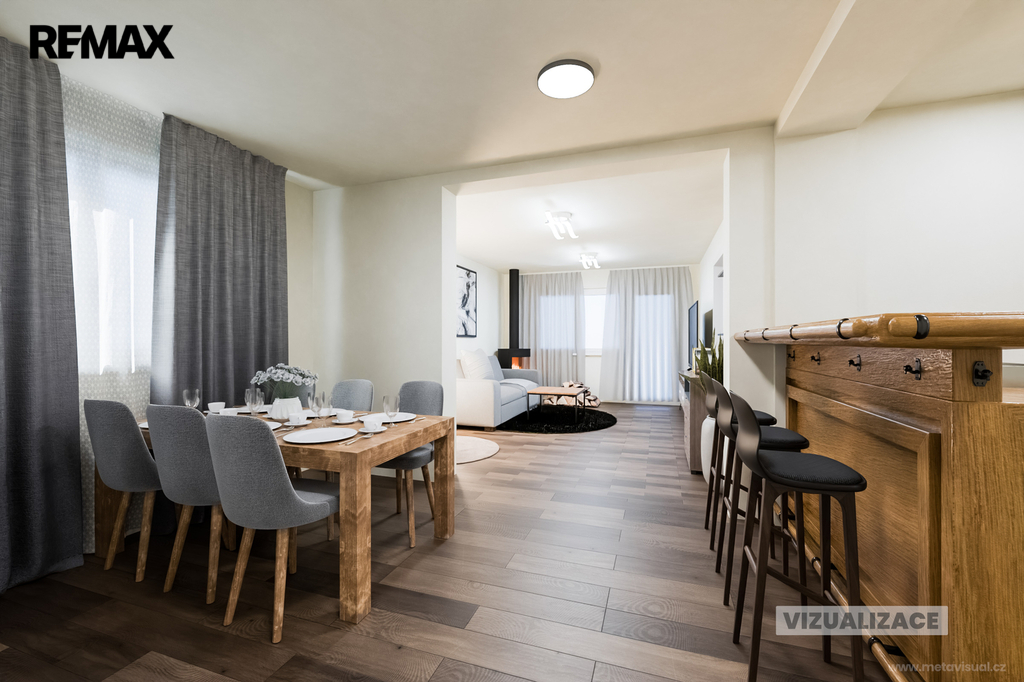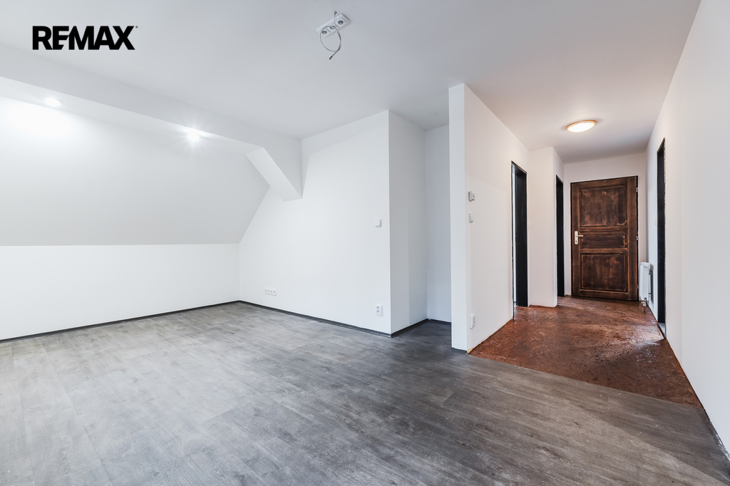 Prostory prvního nadzemního podlaží je možné uzpůsobit na trvalý pobyt a využít tak rozsáhlé prostory bývalé hospody.