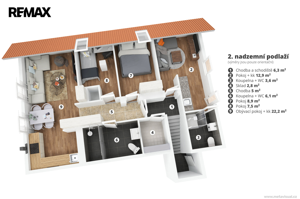 - obývací pokoj a kuchyňský kout (22,2 m²)