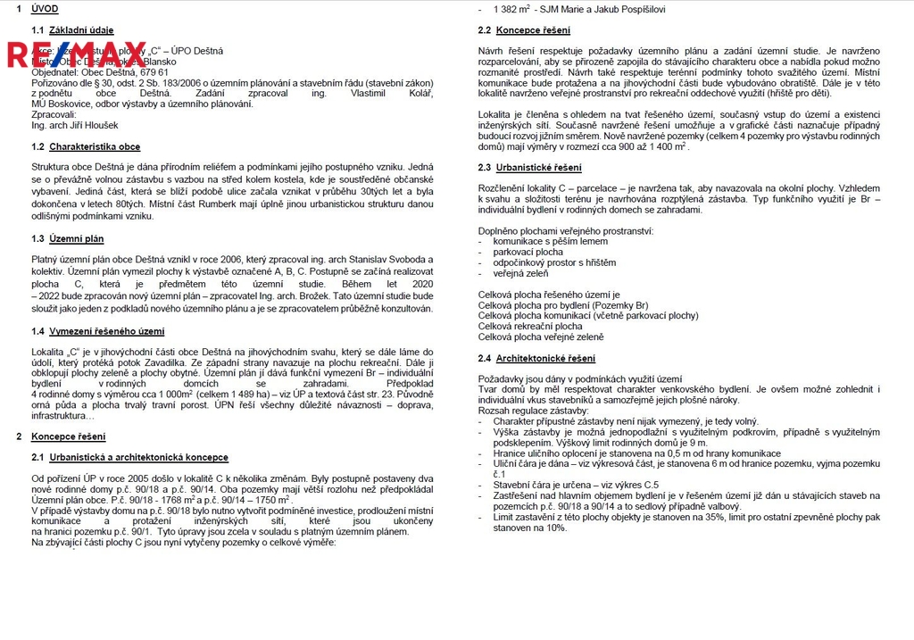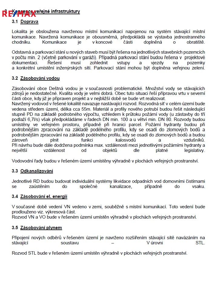 Celková plocha nabízeného souboru 2 pozemků je 6.002 m2, nyní jsou pozemky definované jako trvalý travní porost a jedná se o mírně svažité udržované travnaté plochy, které jsou volně přístupné z veřejné komunikace. Nabízené pozemky jsou v souladu s územním plánem obce součástí tzv. Plochy "C" (funkční vymezení Br), na kterou byla vypracována samostatná studie a na základě které zde územní plán umožňuje individuální bydlení v rodinných domcích se zahradami. Předpokládají se zde až 4 rodinné domy s výměrou cca 1 000 m2 na pozemcích s označením 1, 2, 3, 4. Na pozemku č.1 již započala stavba domu. Lokalita „C“ je v jihovýchodní části obce Deštná na mírném jihovýchodním svahu, který se dále láme do údolí, kudy protéká potok Zavadilka. Ze západní strany navazuje na plochu rekreační. Dále ji obklopují plochy zeleně na jihu a plochy obytné na severu. Jihovýchodní hranice pozemku je nově vytyčená.
