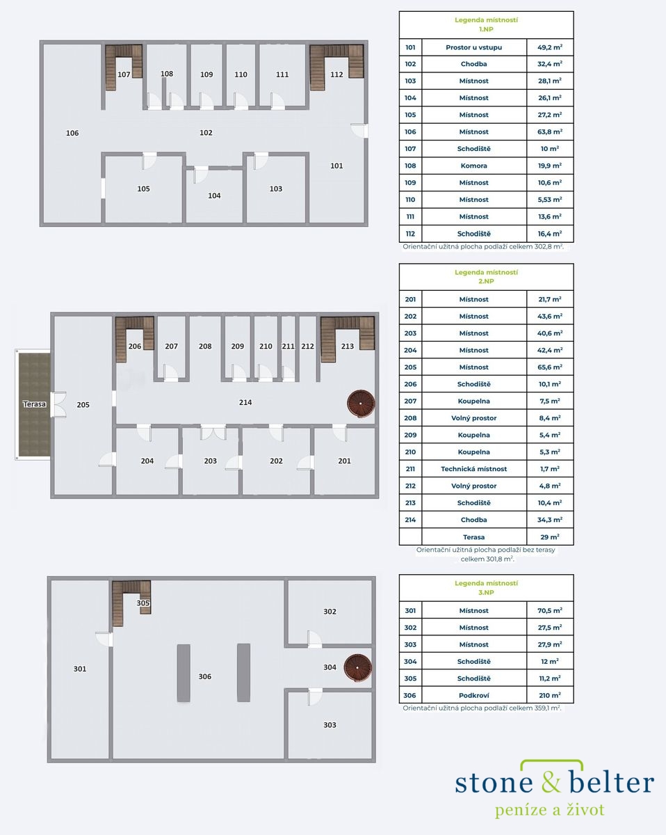• 3. NP – celková plocha 359,1 m² – 3 místnosti a podkroví