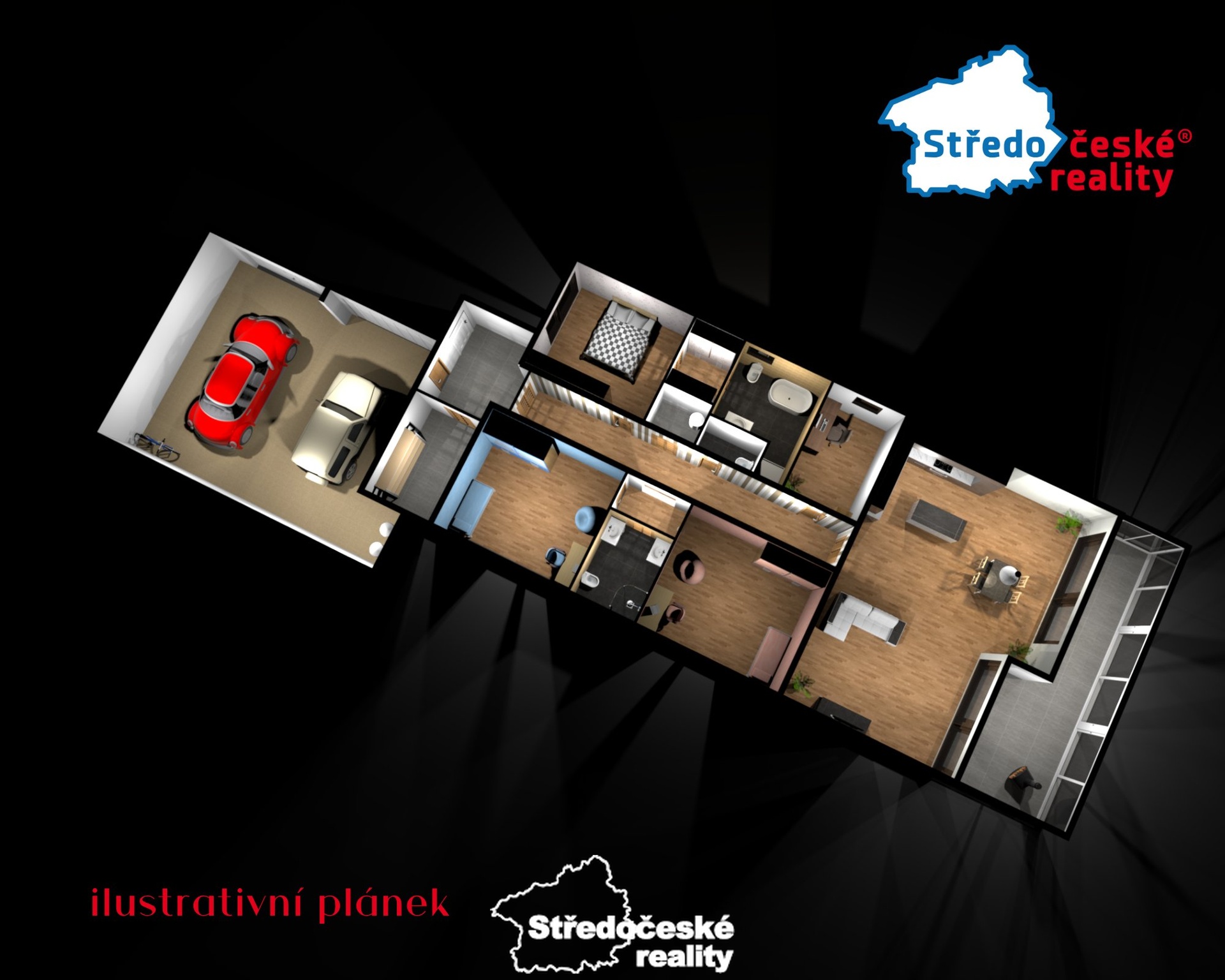 - dva samostatné dětské pokoje (každý 16 m²) se společnou koupelnou (wc, sprcha)