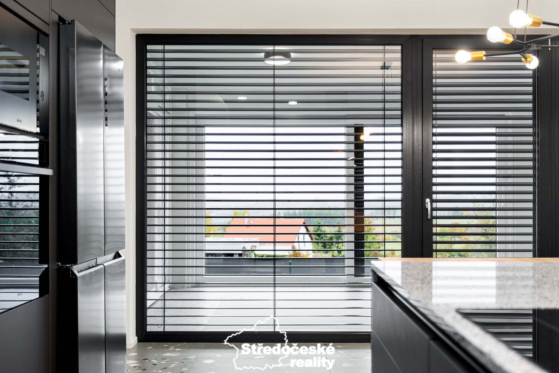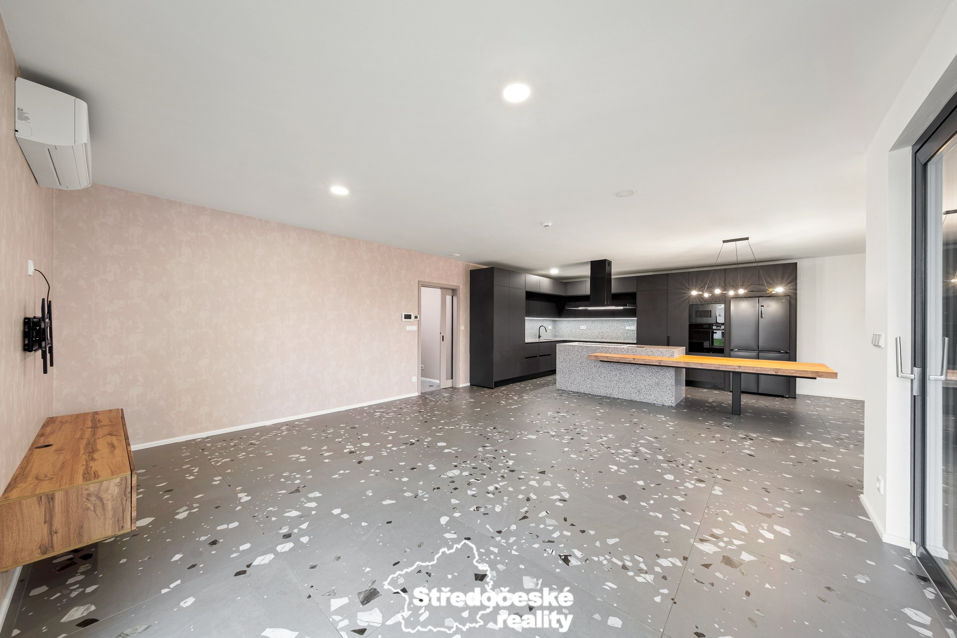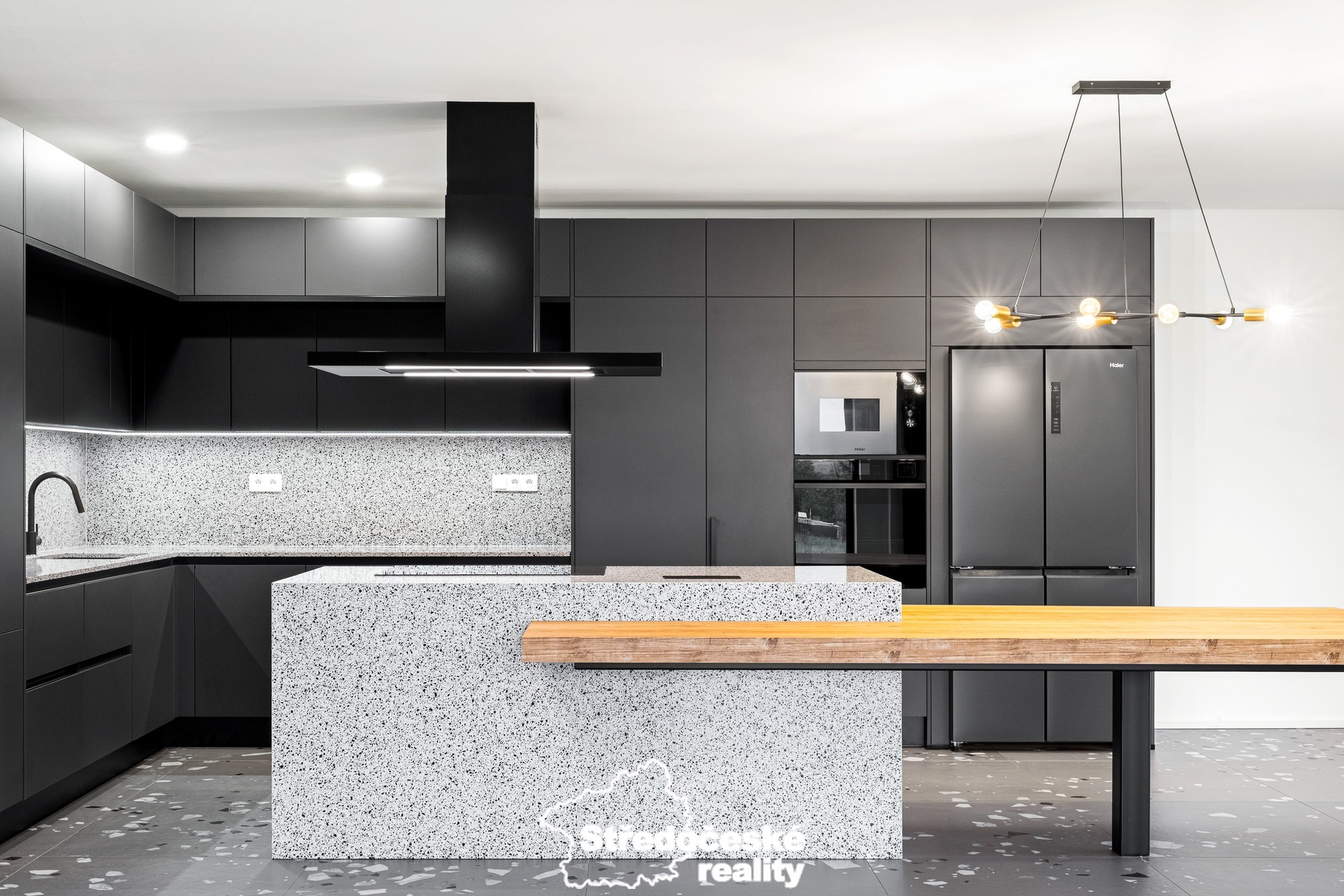 - kuchyňská linka s vestavěnými spotřebiči a americkou lednicí, dále pracovní pult