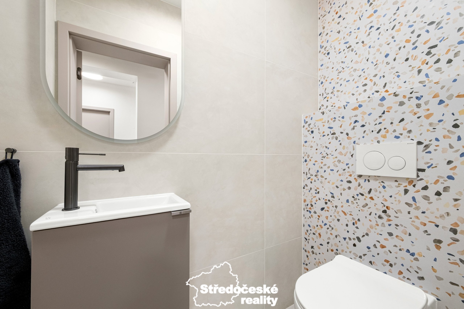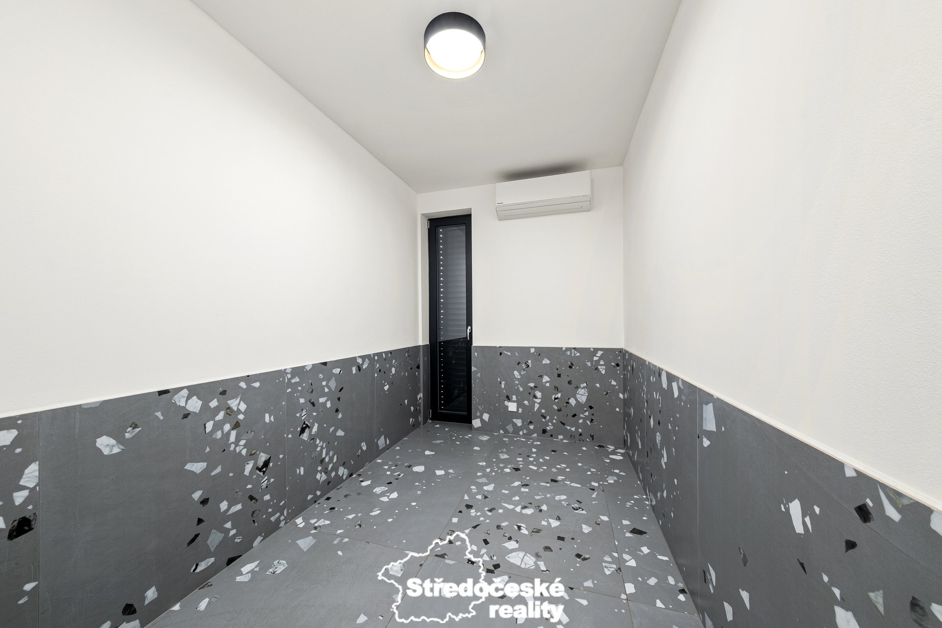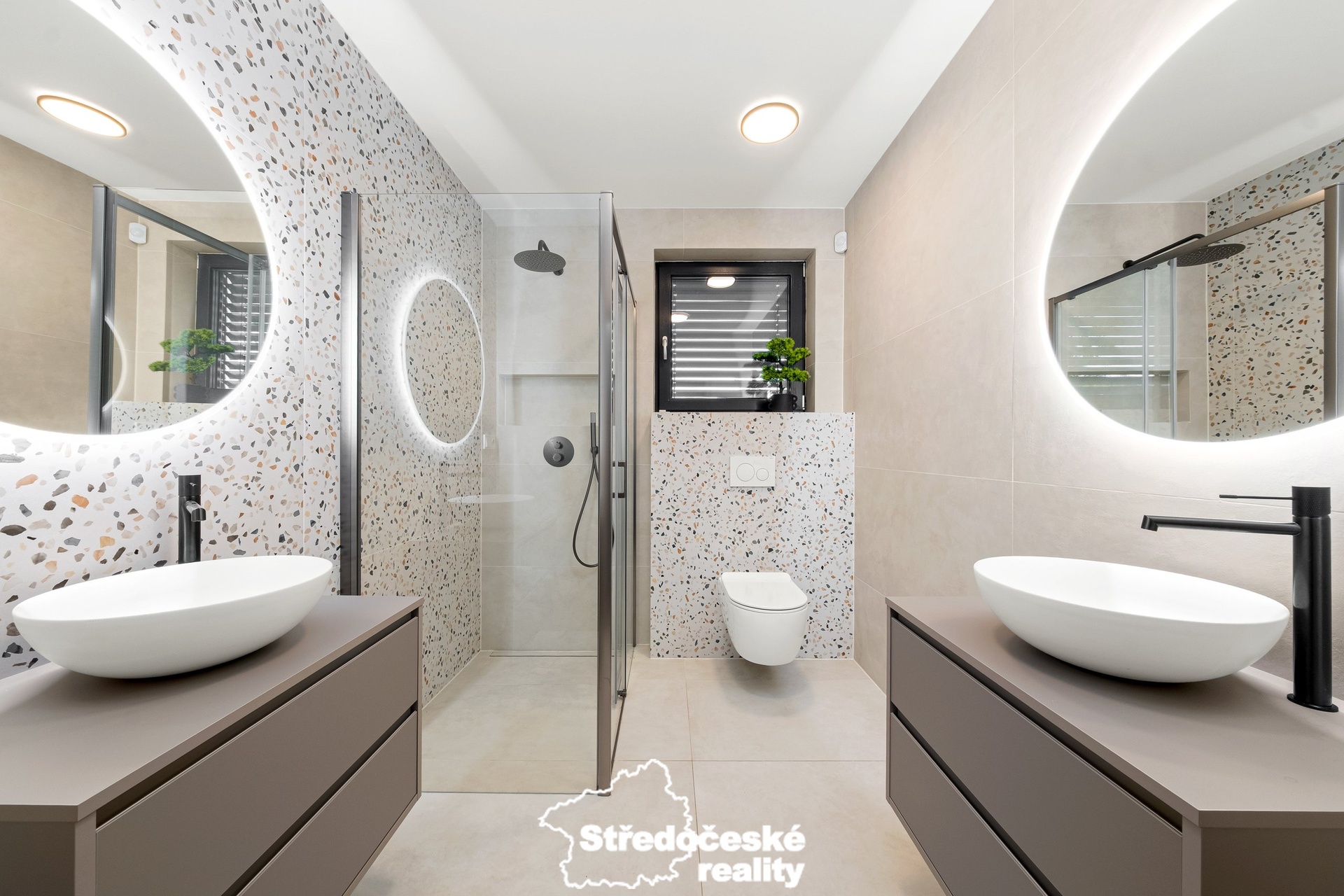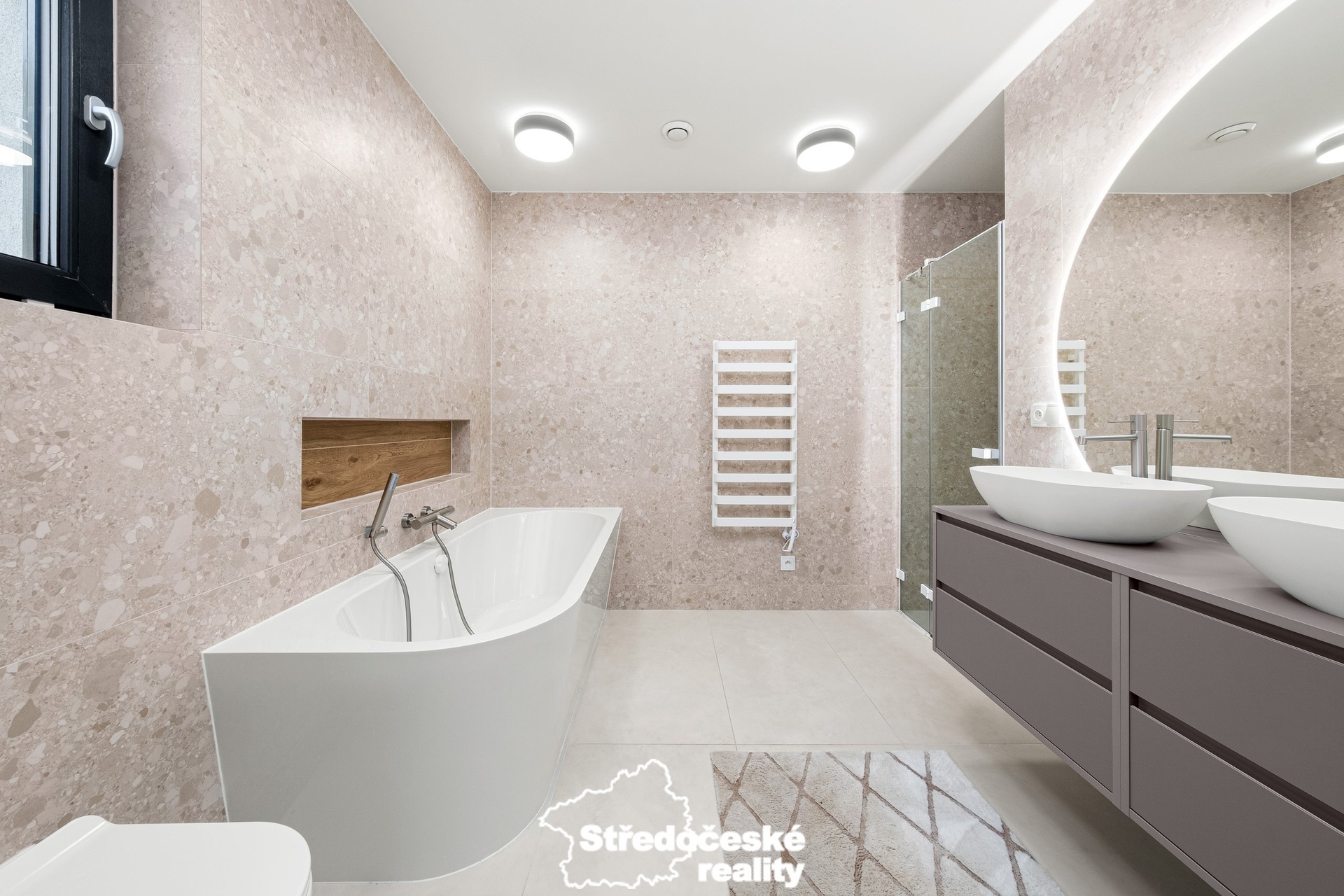 V interiéru jsou použity kvalitní materiály – italská keramika, prémiová sanita a moderní detaily. Bezpečí zajišťuje kamerový systém napojený na telefon a alarm s protipožárními čidly.