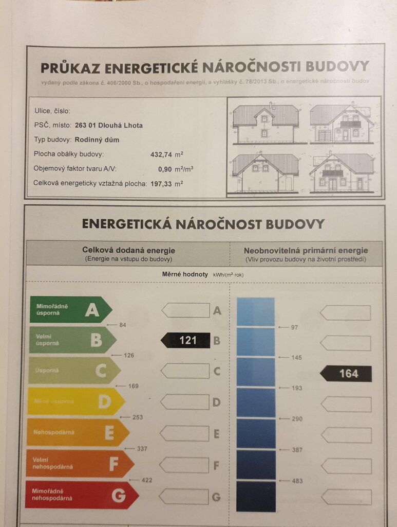 - Ukazatel energetické náročnosti budovy: 121 kWh/m²