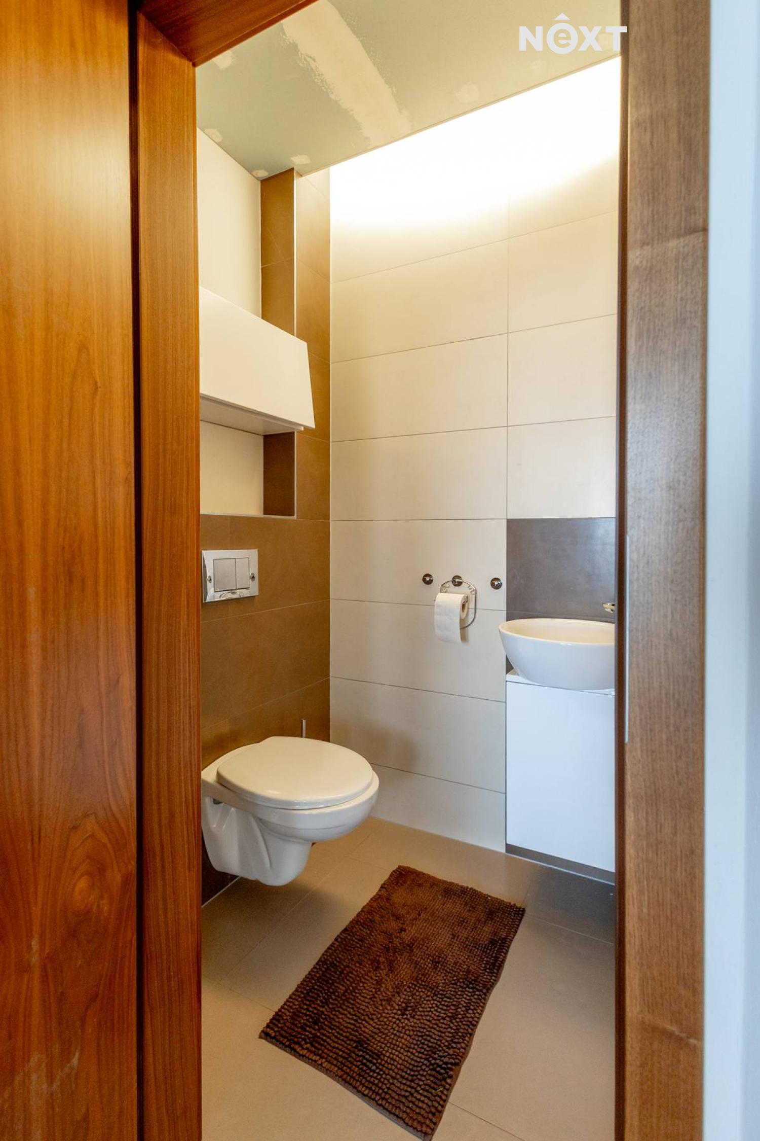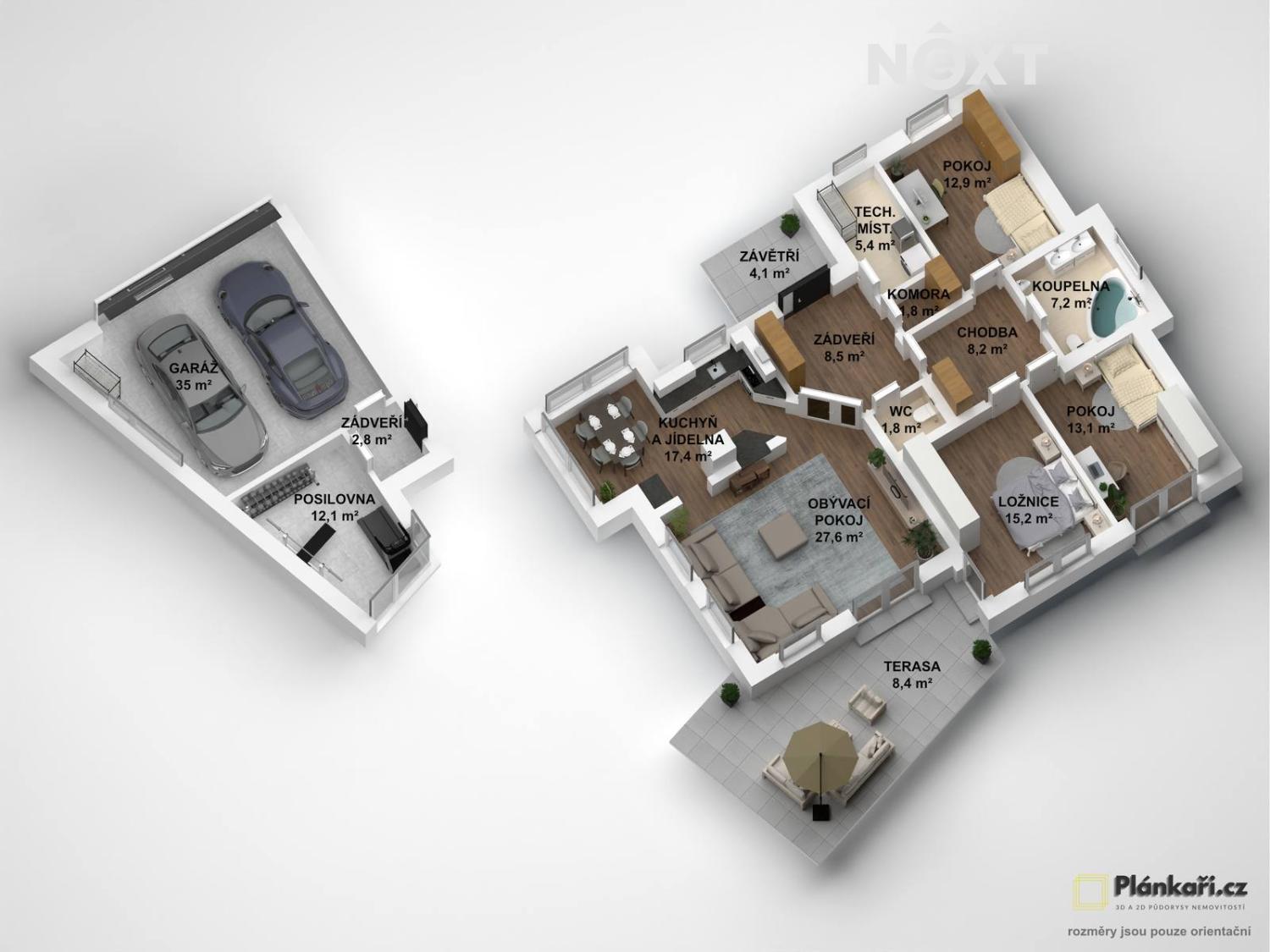 V rámci domu je k dispozici garáž o velikosti 50m2 pro dvě auta a navíc samostatná místnost s kuchyňkou a přívodem vody, kterou lze využít jako domácí kancelář, pracovnu, posilovnu, nebo praktické zázemí pro podnikání z domova. Další výhodou jsou dvě venkovní parkovací místa, která oceníte při návštěvách a která jsou za gabionovým plotem s pojezdovou bránou, což zajišťuje soukromí, bezpečnost a pohodlný vjezd na pozemek.