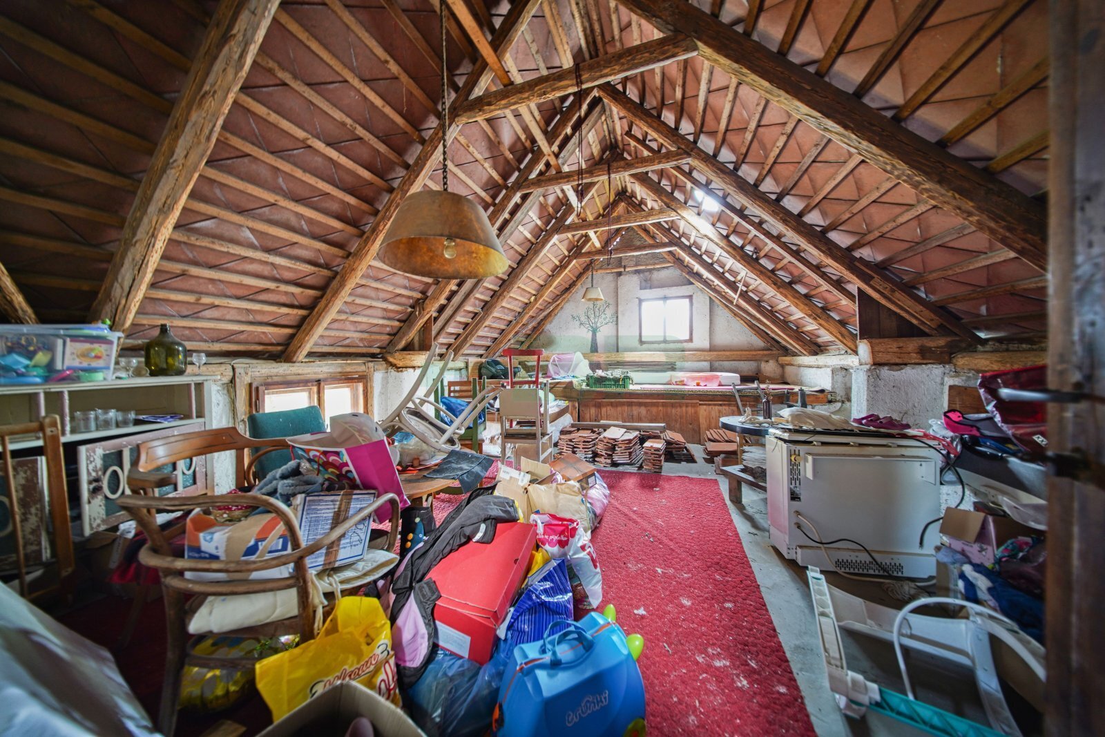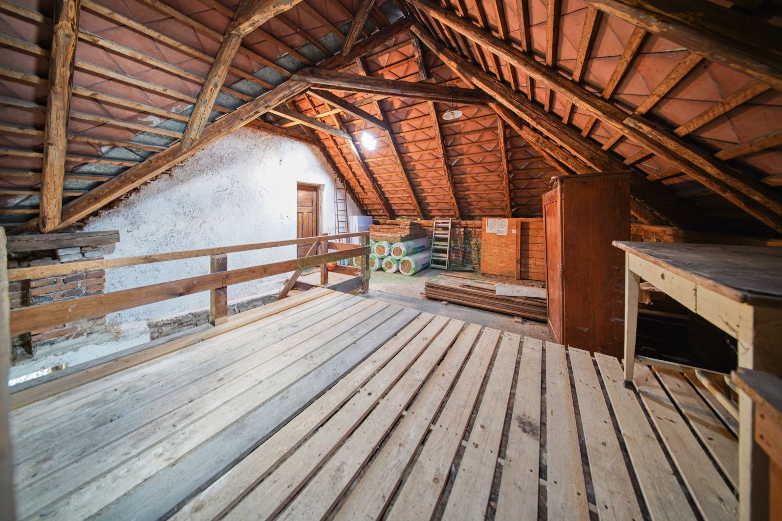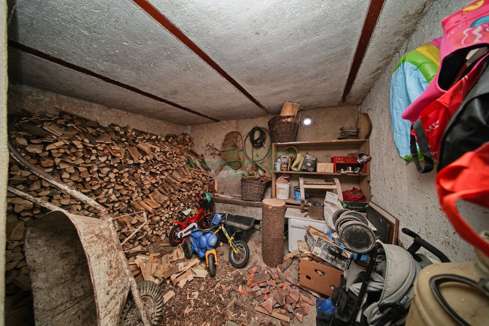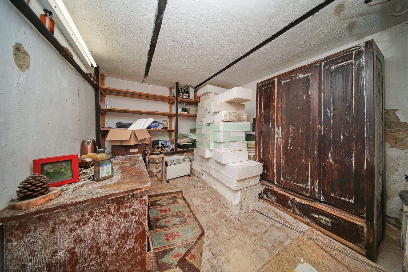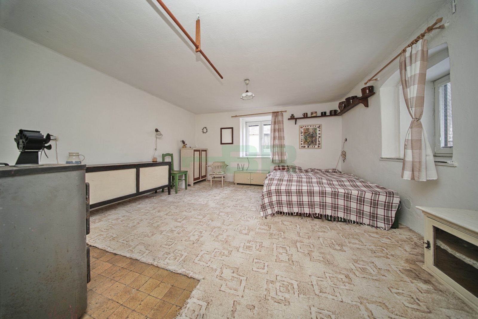 Obývací pokoj 19,3 m2, ložnice 16,2 m2, kuchyňský kout 4,8 m2, koupelna 7,7 m2, předsíň 5,1 m2 a WC 1,1 m2. Dále tři technické místnosti v přízemí 90 m2, půdní pokoj 30 m2 (bude vyklizen) a pochozí půda.