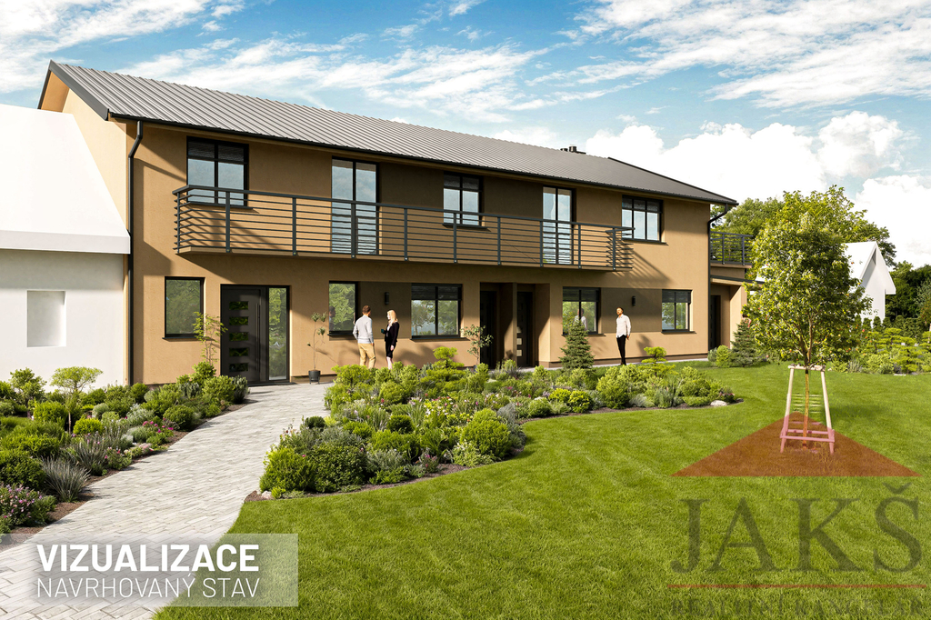 Apartmán/byt č. 6 o dispozici 1+kk s balkonem, skladem a parkovacím místem na oploceném pozemku s komunitní zahradou se skleníkem, trampolínou a posezením.