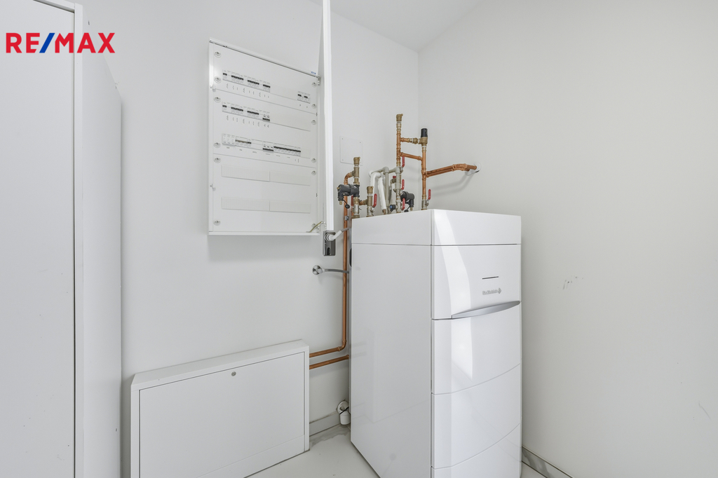 Dům je vybaven tepelným čerpadlem, podlahovým vytápěním v přízemí a radiátory v patře. Napojení na obecní vodovod a kanalizaci je samozřejmostí, na střechu je zajištěna příprava pro instalaci fotovoltaických panelů, což dává budoucímu majiteli možnost další optimalizace provozních nákladů.