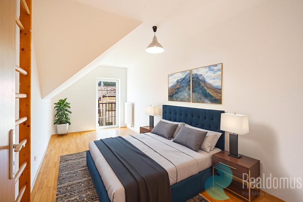 Byt se nachází ve druhém patře/podkroví malého zděného domu a nabízí komfortní a klidné bydlení s výbornou dostupností do města. Dispozičně je byt velmi prakticky řešen, najdeme zde velkorysý obývací pokoj s moderním kuchyňským koutem (31,6 m²), dvě ložnice (19,7 m² a 15,63 m²), koupelnu s vanou (4,4 m²), samostatnou toaletu (1,87 m²) a předsíň (7,7 m²). Kuchyňská linka je vybavena troubou, varnou deskou, digestoří a mikrovlnnou troubou.
