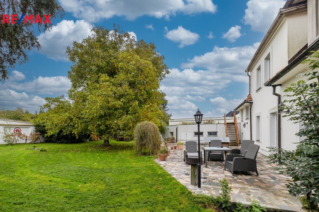 Za domem se rozprostírá udržovaná okrasná zahrada o celkové ploše 1 015 m², které dominuje vzrostlý ořech.