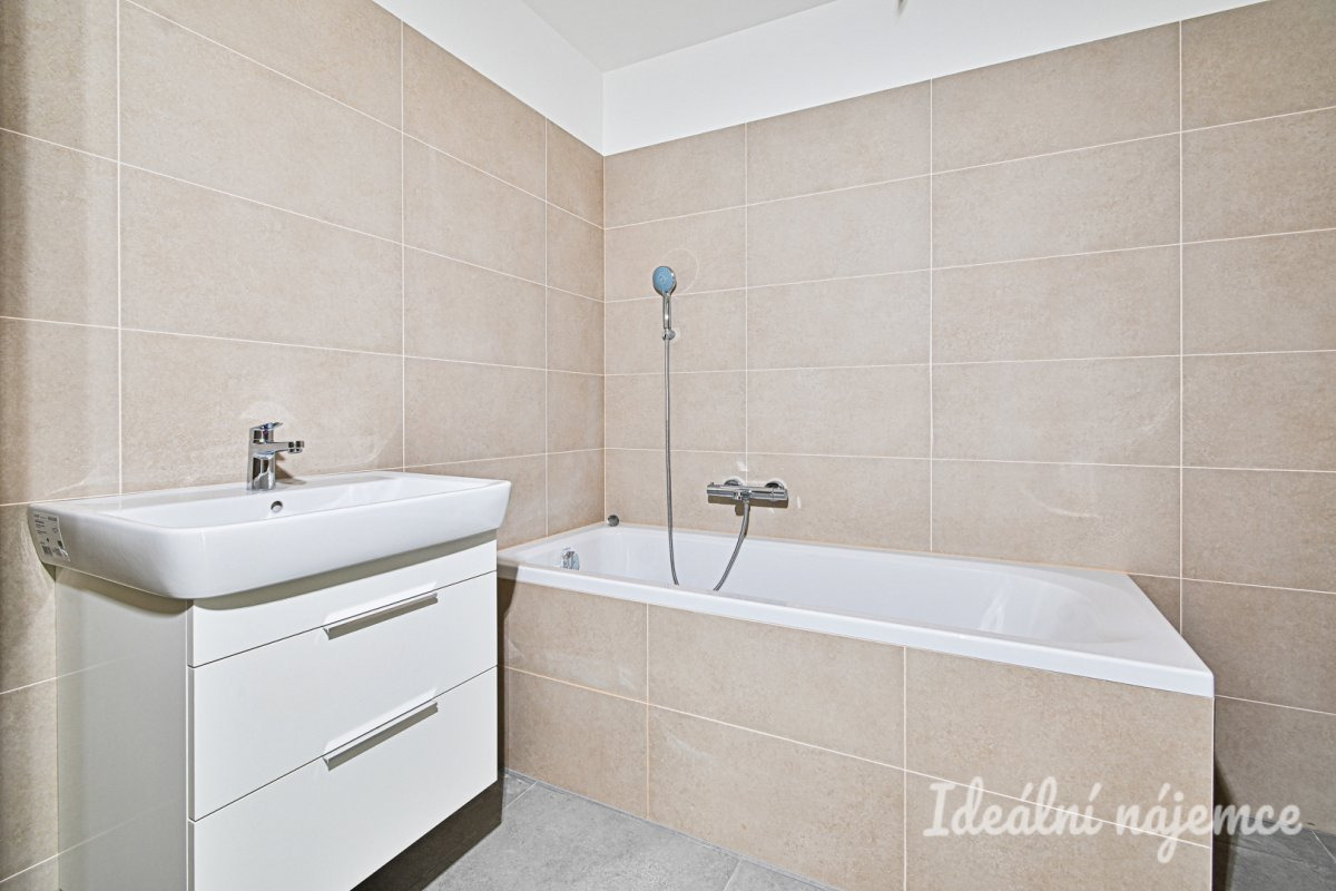 Koupelna je vybavena vanou a umyvadlovou skříňkou s umyvadlem.