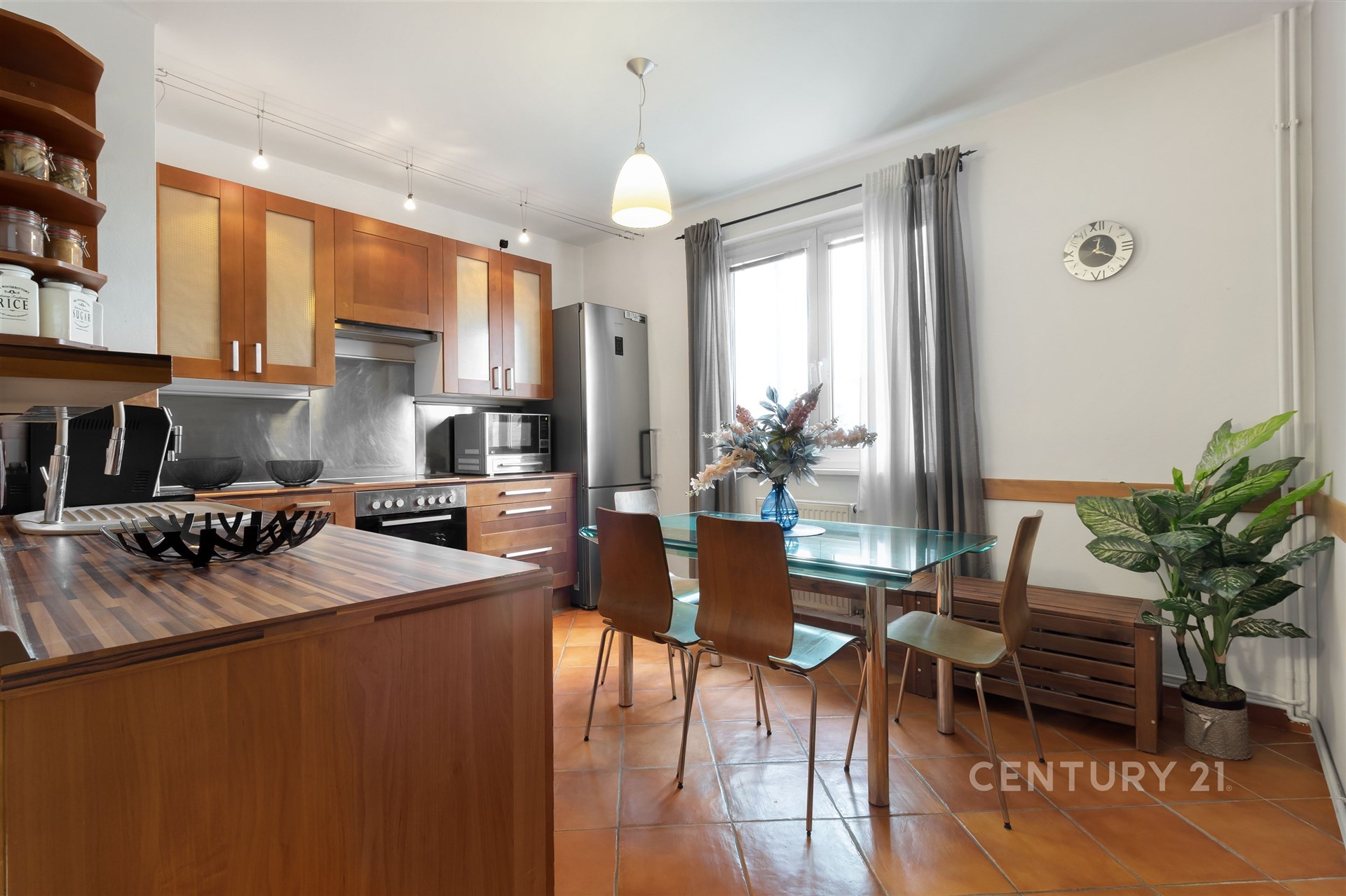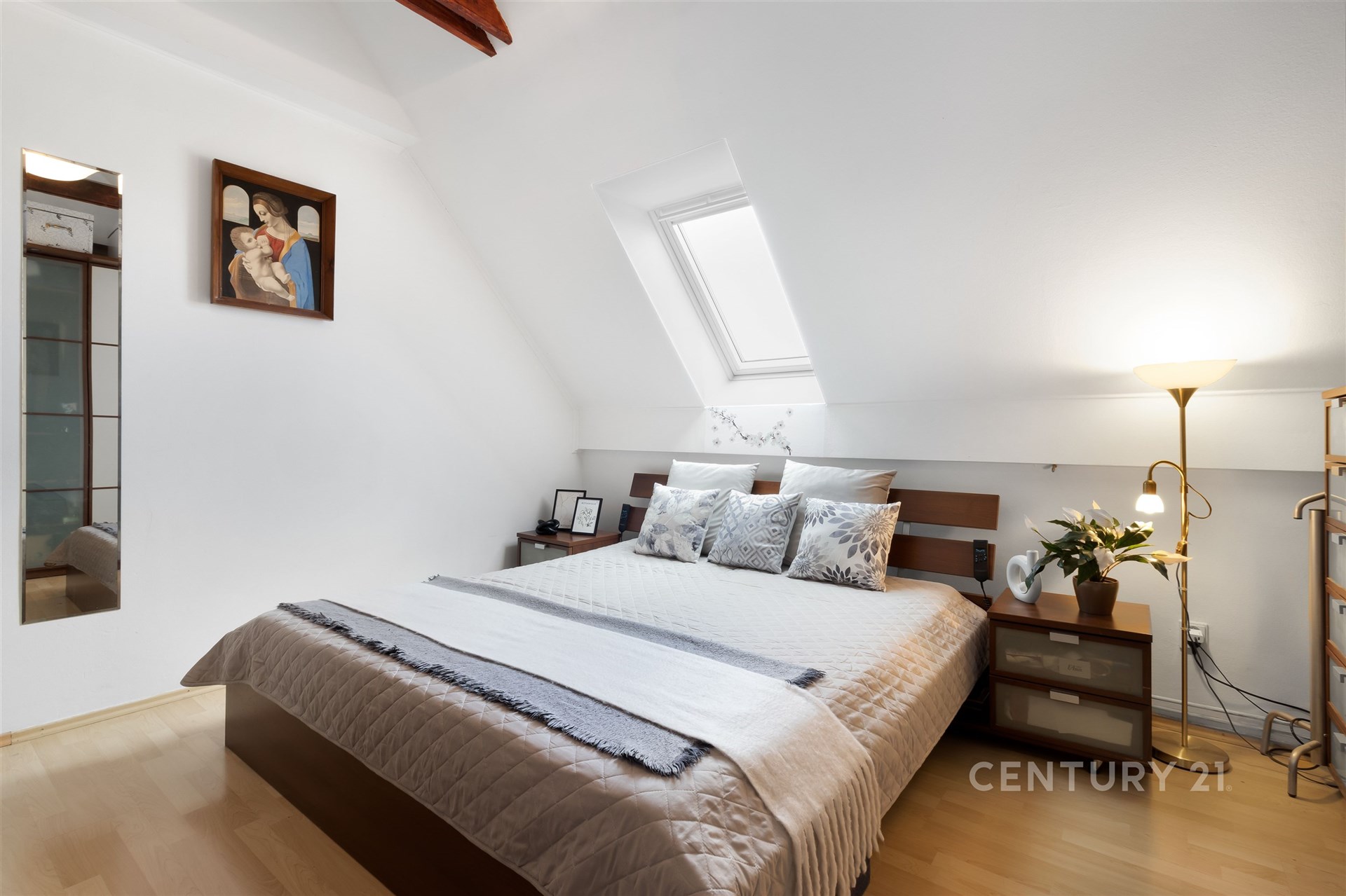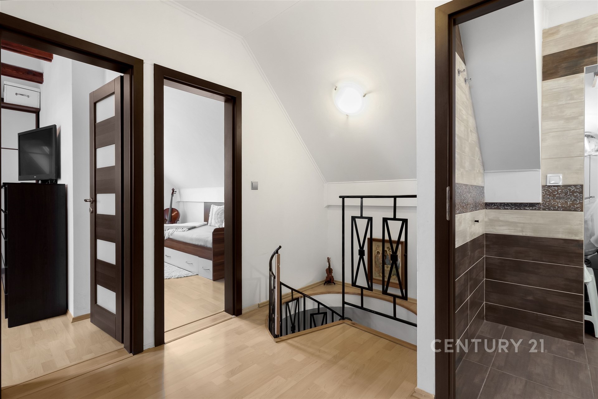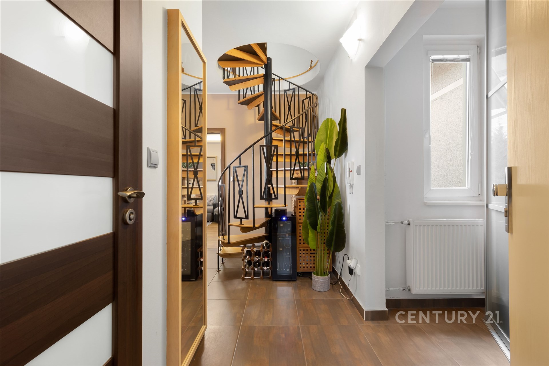 Už po vstupu do bytu vás přivítá útulná hala a praktická šatna na boty i kabáty. V této úrovni najdete také samostatnou toaletu, plně vybavenou kuchyň s jídelním koutem a světlý obývací pokoj, odkud se vstupuje na zasklenou lodžii – místo, kde si odpočinete v každém ročním období. Po elegantním schodišti vystoupáte do horního patra, kde se nachází tři prostorné ložnice, koupelna s vanou a technickou místností. Celý byt působí vzdušně a promyšleně a díky chytré poloze v domě je mimořádně klidný. Sousedí pouze malou částí své dispozice – u kuchyně a koupelny – se sousedním bytem, a jinak je bez přímých sousedů. Nabízí tak maximální soukromí i pohodlí každému členovi rodiny.