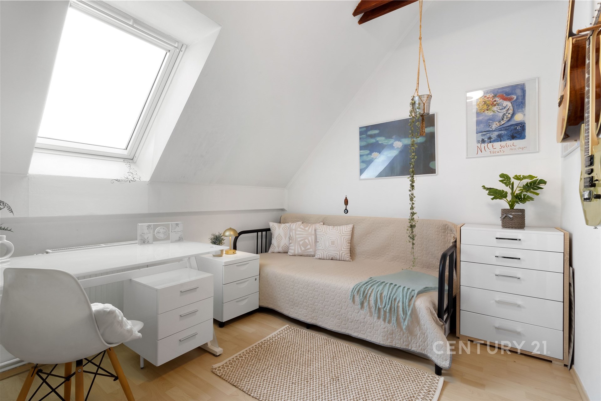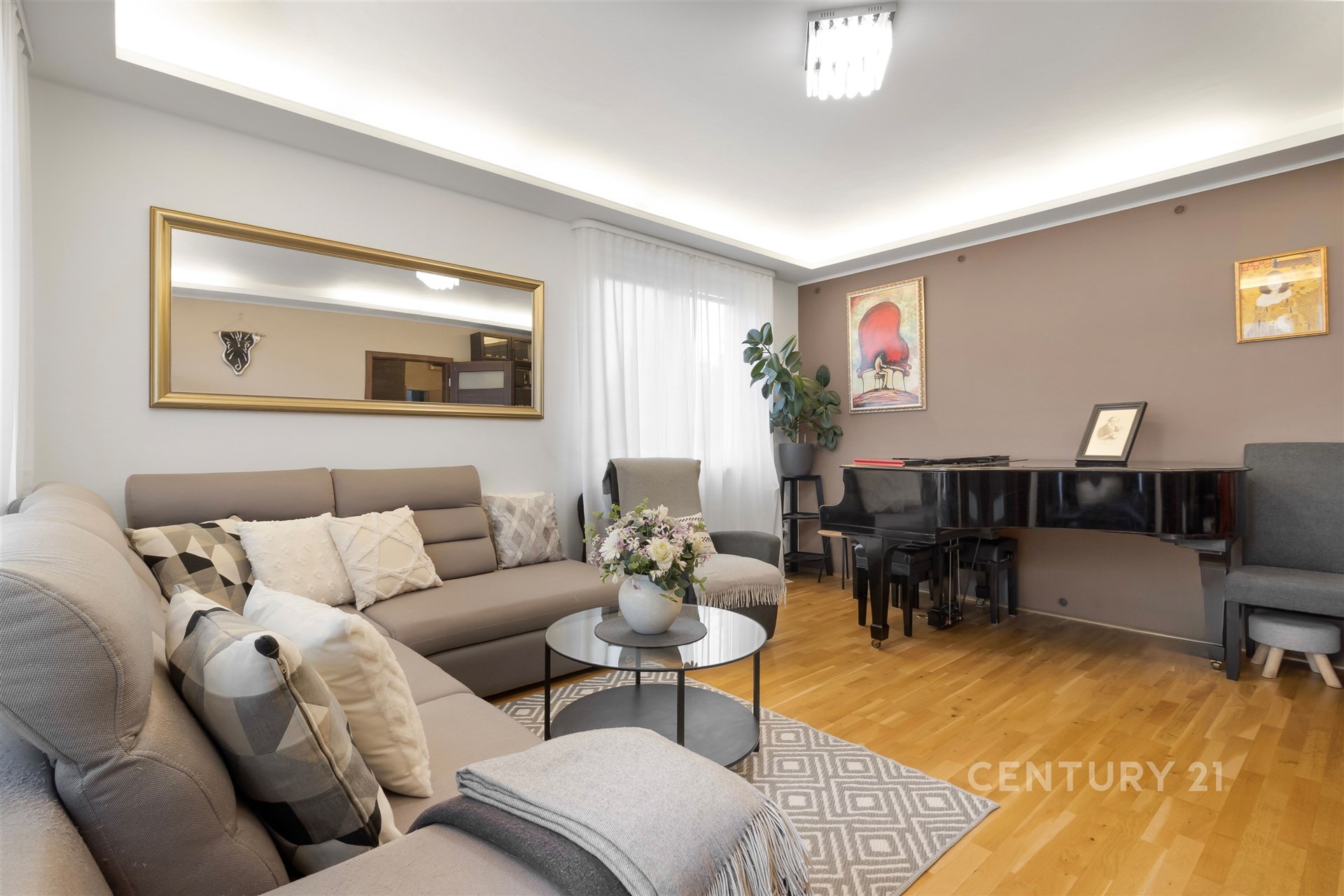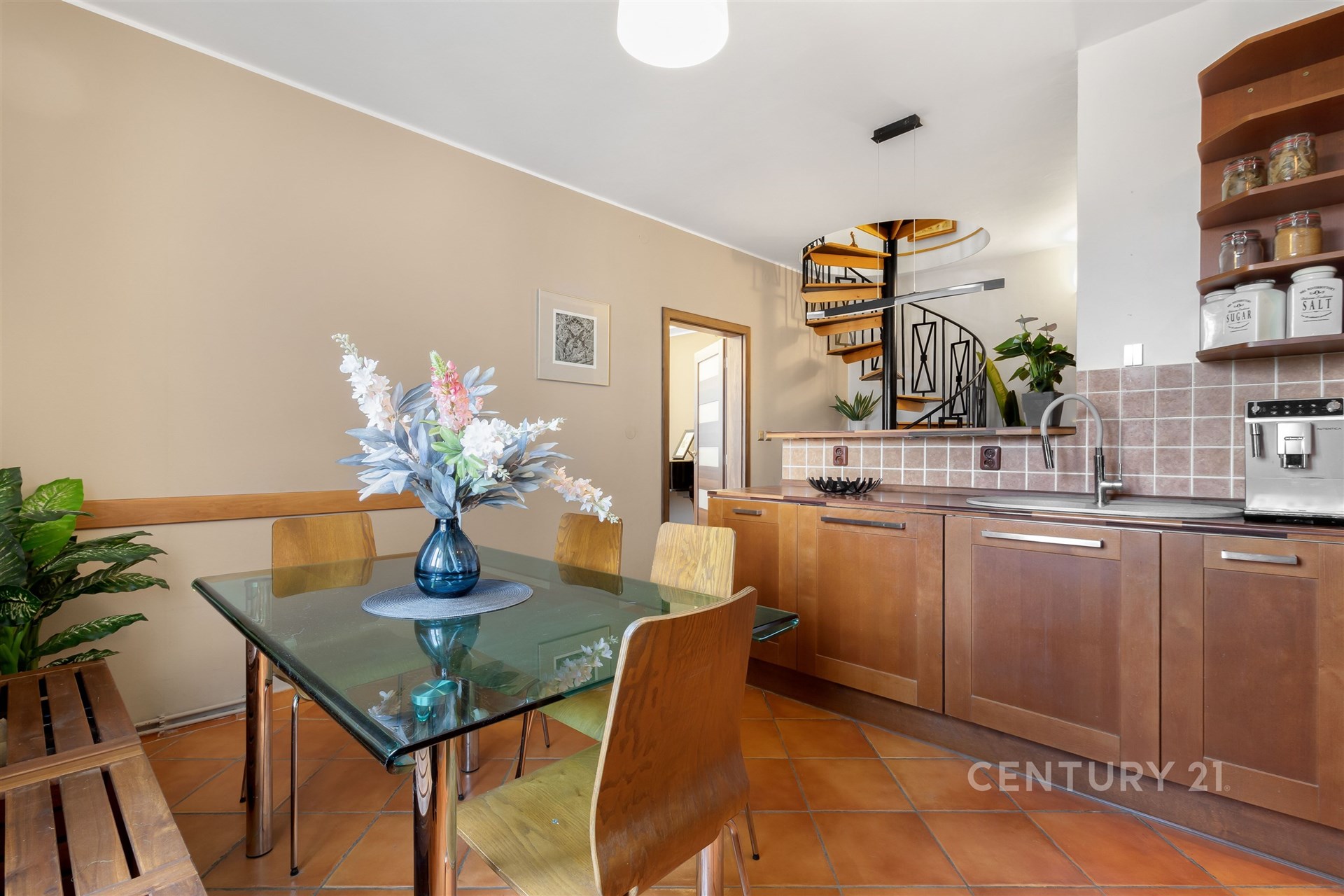 Už po vstupu do bytu vás přivítá útulná hala a praktická šatna na boty i kabáty. V této úrovni najdete také samostatnou toaletu, plně vybavenou kuchyň s jídelním koutem a světlý obývací pokoj, odkud se vstupuje na zasklenou lodžii – místo, kde si odpočinete v každém ročním období. Po elegantním schodišti vystoupáte do horního patra, kde se nachází tři prostorné ložnice, koupelna s vanou a technickou místností. Celý byt působí vzdušně a promyšleně a díky chytré poloze v domě je mimořádně klidný. Sousedí pouze malou částí své dispozice – u kuchyně a koupelny – se sousedním bytem, a jinak je bez přímých sousedů. Nabízí tak maximální soukromí i pohodlí každému členovi rodiny.