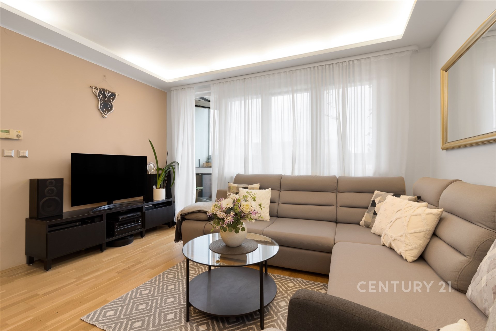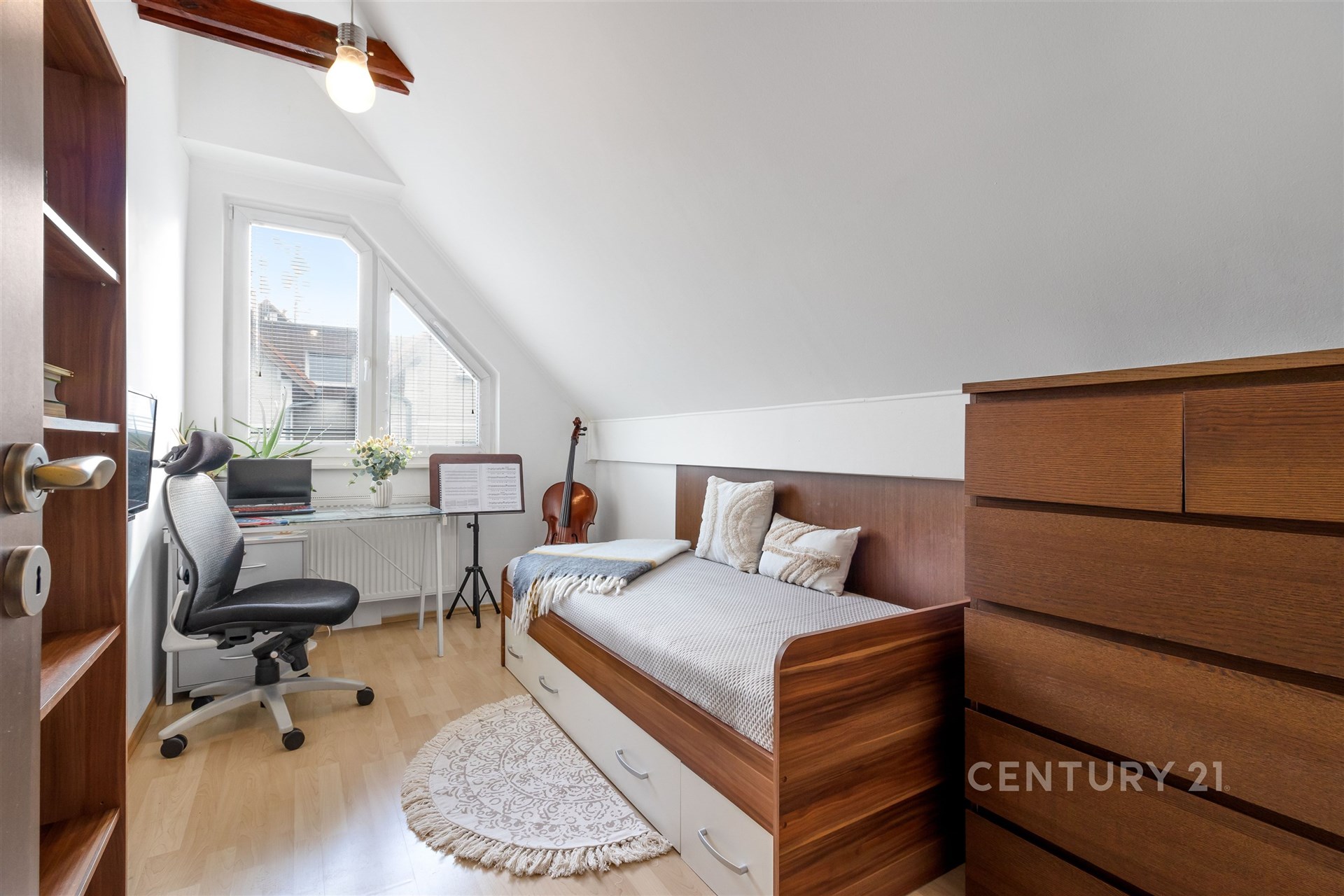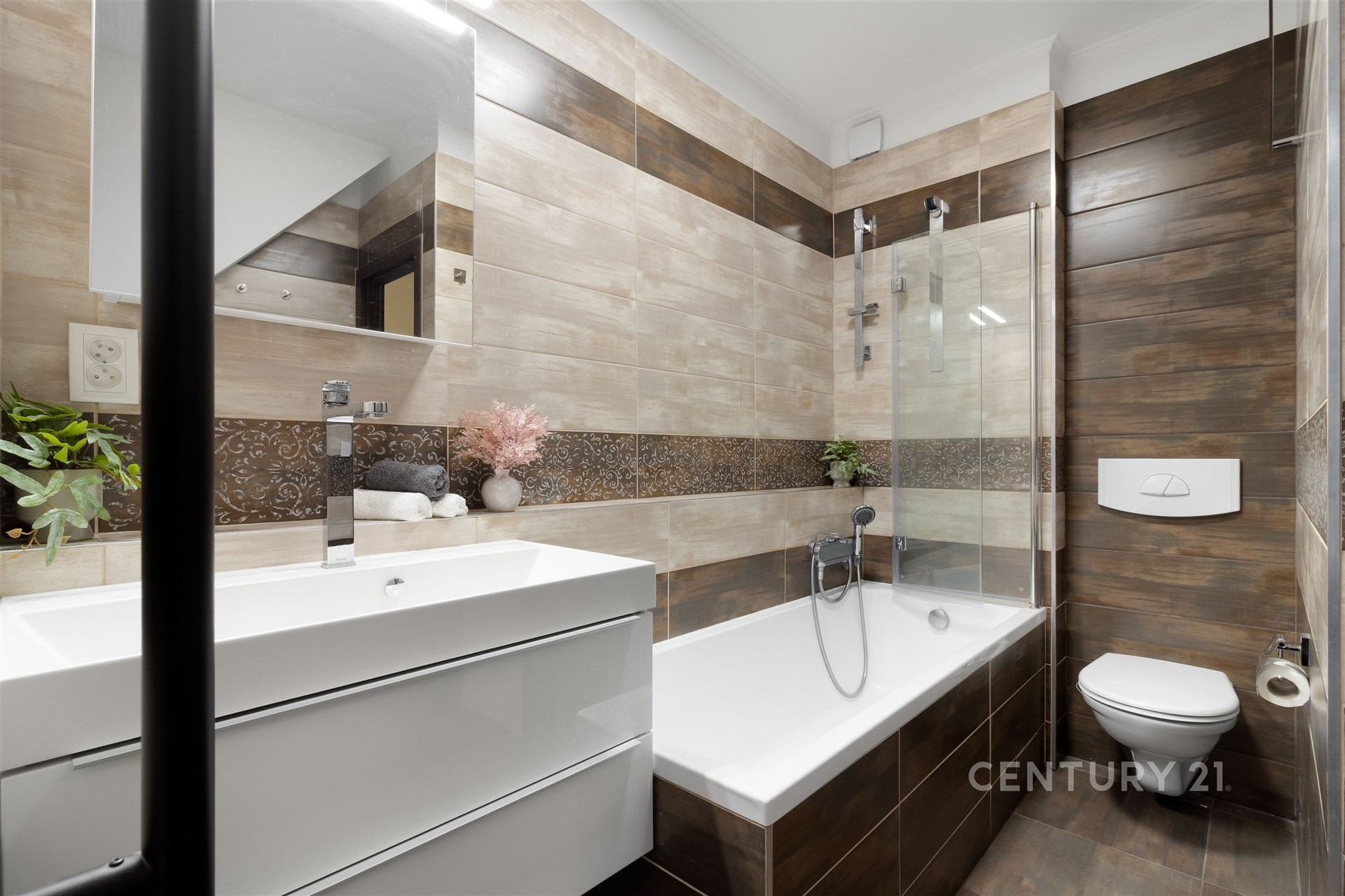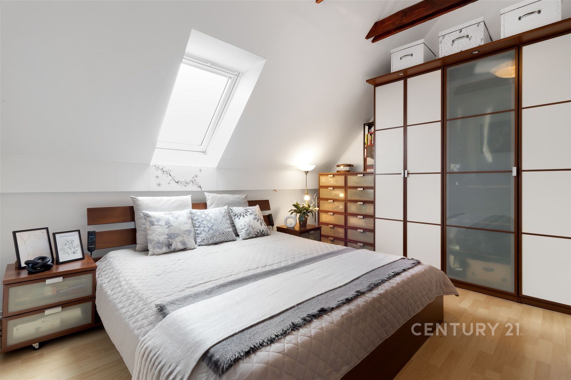 Už po vstupu do bytu vás přivítá útulná hala a praktická šatna na boty i kabáty. V této úrovni najdete také samostatnou toaletu, plně vybavenou kuchyň s jídelním koutem a světlý obývací pokoj, odkud se vstupuje na zasklenou lodžii – místo, kde si odpočinete v každém ročním období. Po elegantním schodišti vystoupáte do horního patra, kde se nachází tři prostorné ložnice, koupelna s vanou a technickou místností. Celý byt působí vzdušně a promyšleně a díky chytré poloze v domě je mimořádně klidný. Sousedí pouze malou částí své dispozice – u kuchyně a koupelny – se sousedním bytem, a jinak je bez přímých sousedů. Nabízí tak maximální soukromí i pohodlí každému členovi rodiny.