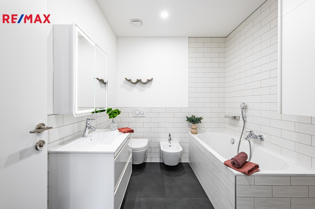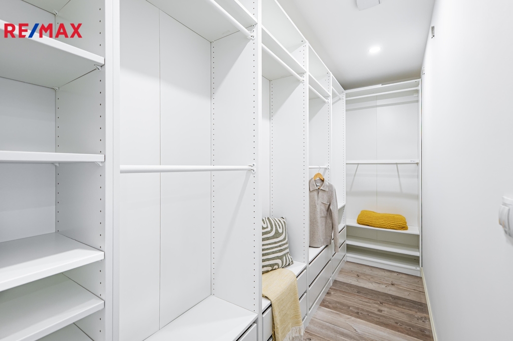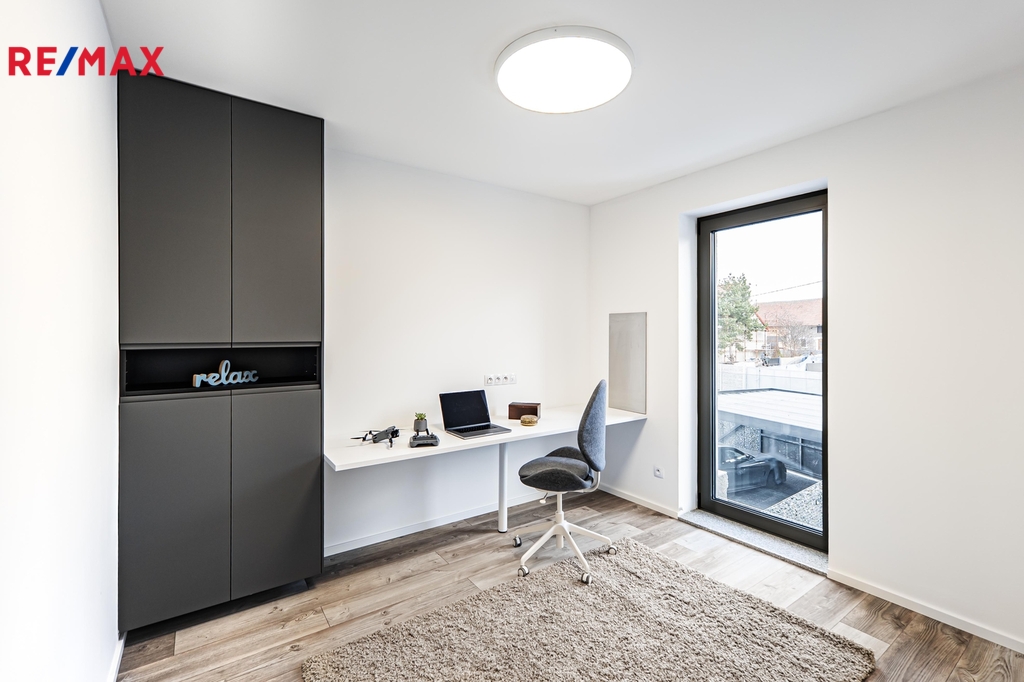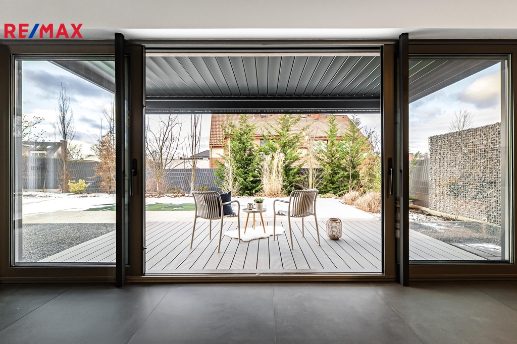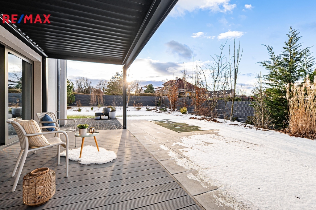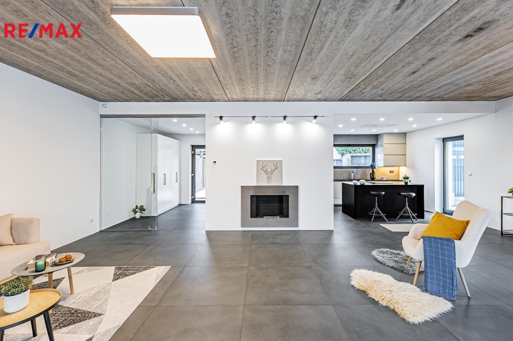 Dominantou interiéru je velký obývací pokoj s krbem, který harmonicky navazuje na moderní kuchyňský kout s žulovou pracovní deskou, jehož součástí jsou kvalitní spotřebiče – lednice, myčka, indukční varná deska, trouba, digestoř. Dům disponuje dvěma koupelnami a třemi toaletami, což uvítá vícečlenná rodina. Nechybí plovoucí podlahy v kombinaci s keramickou dlažbou a italská designová světla. Z obývacího pokoje je přímý vstup na terasu s bioklimatickou pergolou se 2 roletami, která poskytne příjemné místo pro posezení a relaxaci.