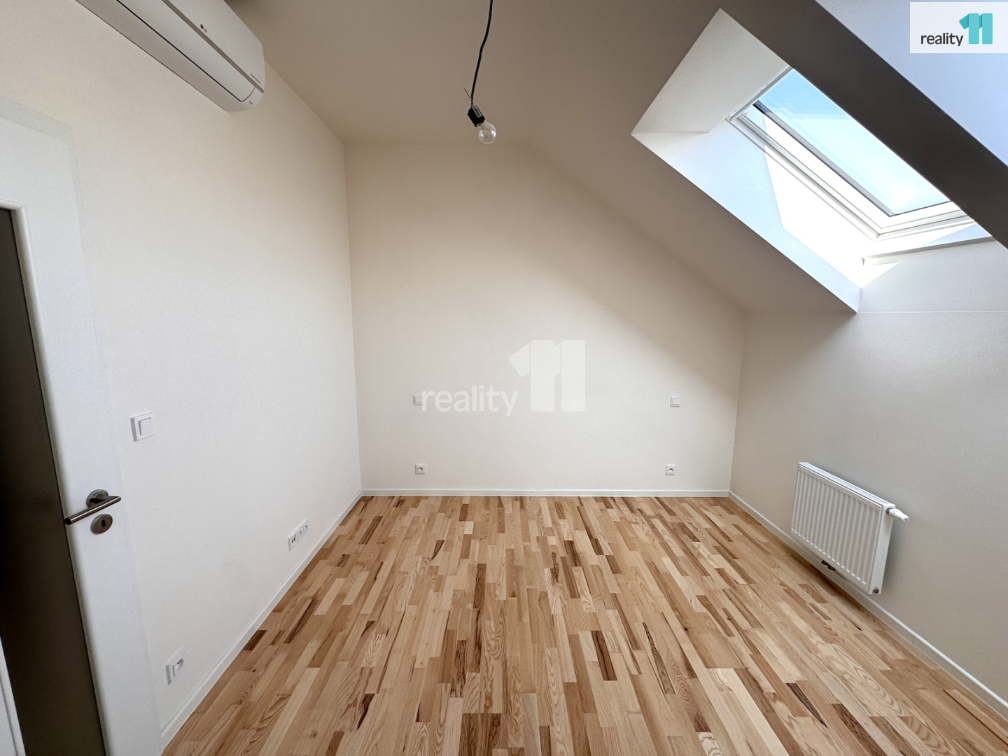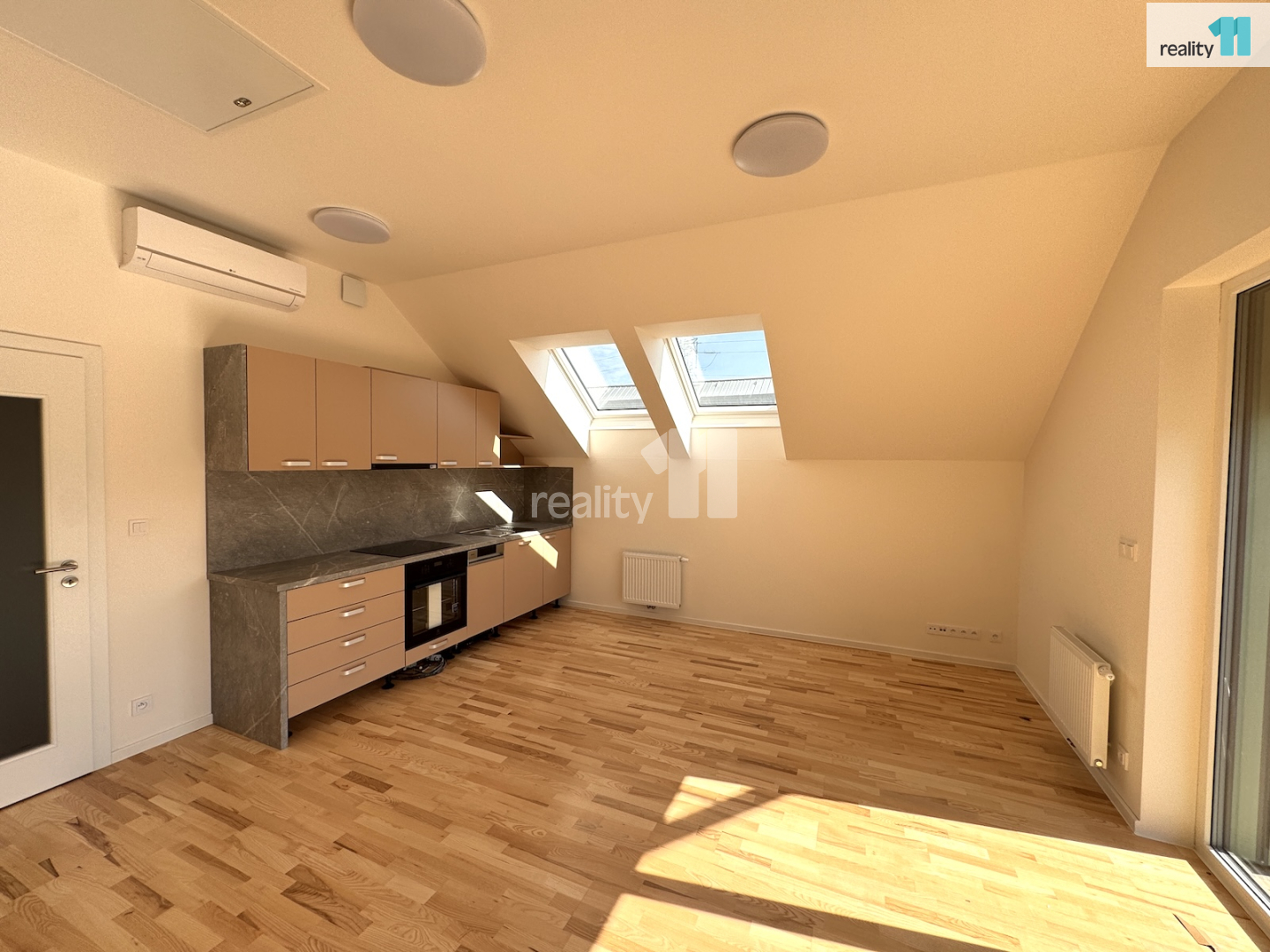 Nezařízený byt, s výměrou 53.7 m², je dispozičně rozdělen na vstupní chodbu, ze které se vchází do slunného obytného pokoje, kde je nová kuchyňská linka na míru (varná deska, trouba, digestoř, myčka, lednice po dohodě), se střešními okny a vstupem na prostorný balkon (výměra 11.4 m²). Samostatná ložnice, koupelna s vanou a toaletou. Do chodby byla instalována vestavná skříň ve stejném designu jako je kuchyně. V celém bytě použity kvalitní, moderní materiály v neutrálních barvách - dřevěné podlahy, rekuperace, podlahové topení v koupelně, klimatizace. Velkou výhodou bytu je úložný prostor přístupný sklápěcími schody přímo v bytě, dále velký zděný sklep (2.1 m²) a vlastní parkovací stání se závorou.