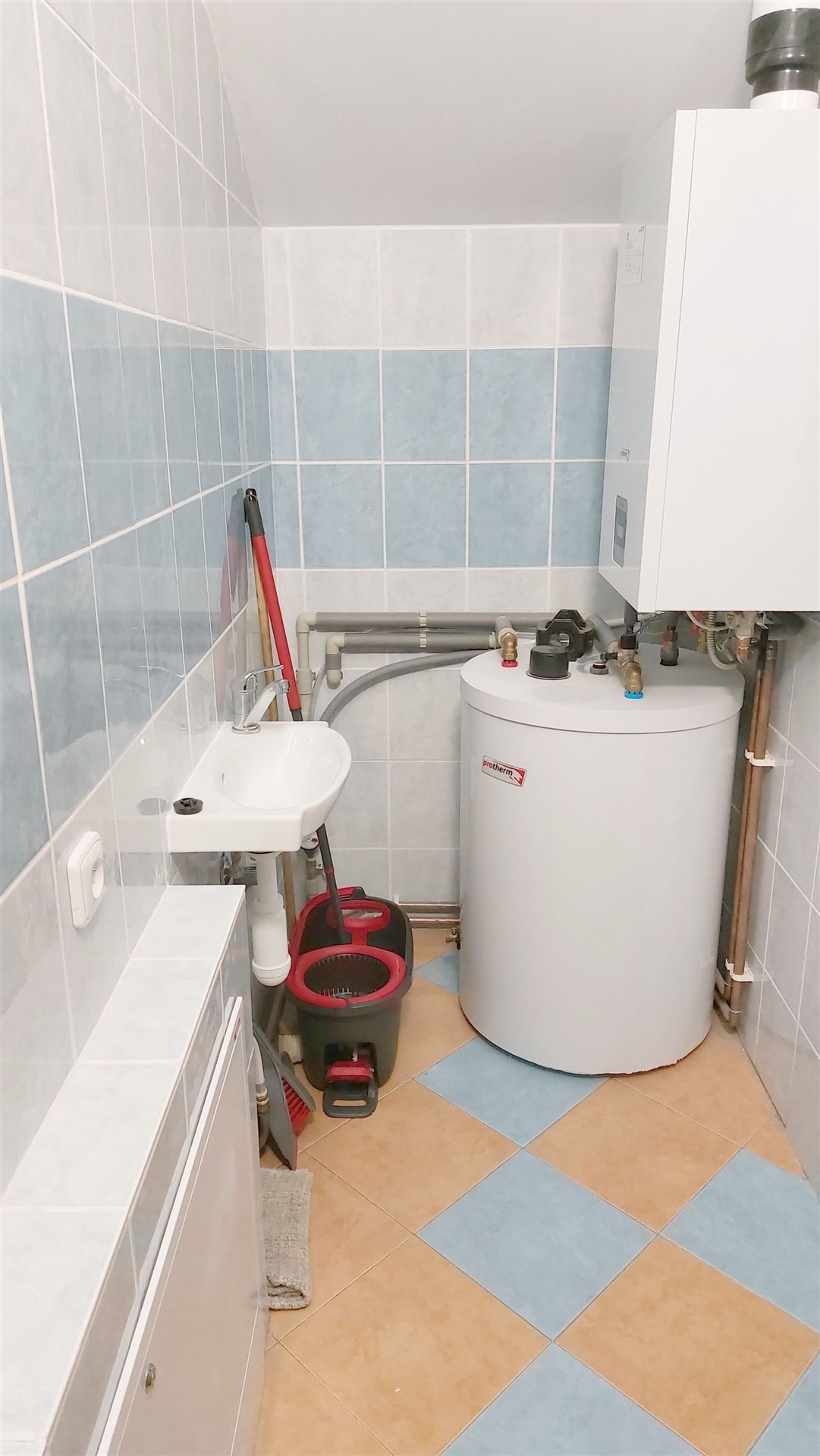 • V prostorné technické místnosti se nachází moderní plynový kotel Prothem se zásobníkem na teplou vodu a ovládání na podlahové topení.