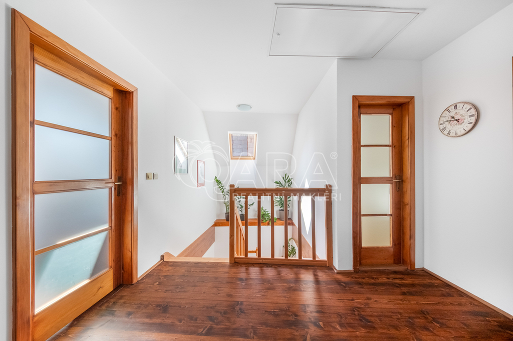 2. NP – hala (10 m2), tři pokoje (18,3 m2, 18,2 m2, 14,3 m2), koupelna s vanou a WC, šatna, půda s úložným prostorem je přístupná z haly po výsuvném žebříku