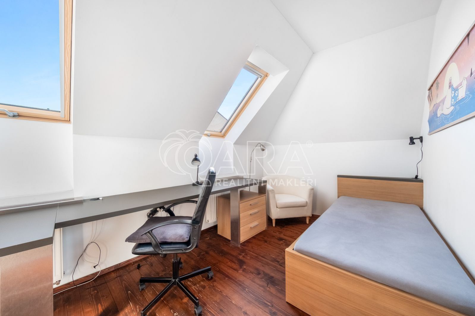 2. NP hala (10 m2), tři pokoje (18,3 m2, 18,2 m2, 14,3 m2), koupelna s vanou a WC, šatna, půda s úložným prostorem je přístupná z haly po výsuvném žebříku