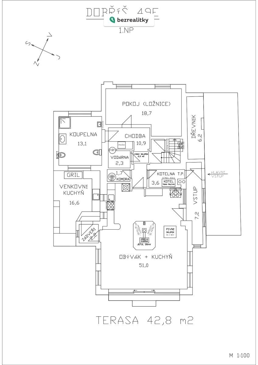 • velkorysá obytná místnost 51 m² + terasa 42 m² orientovaná na jihozápad,