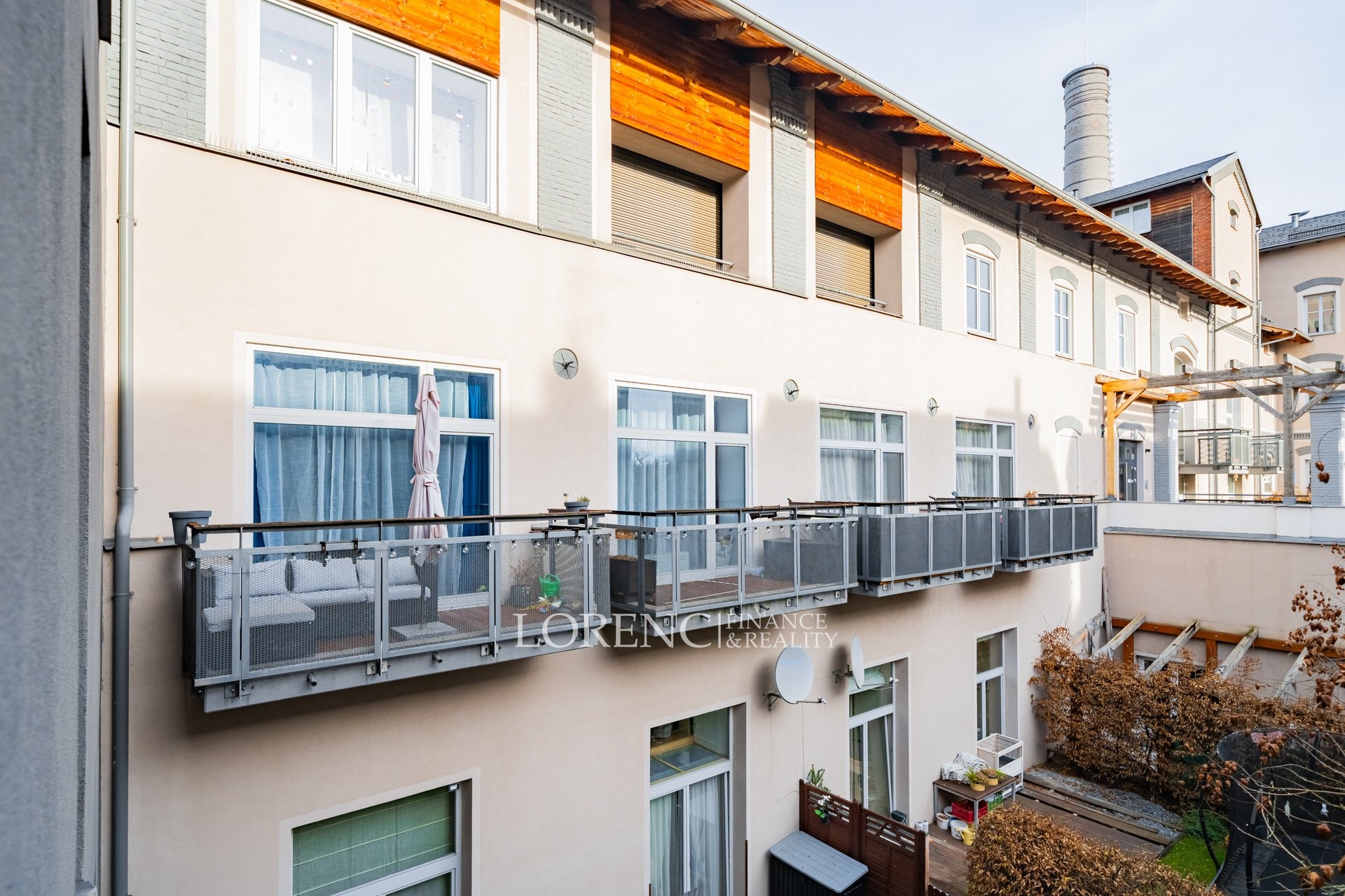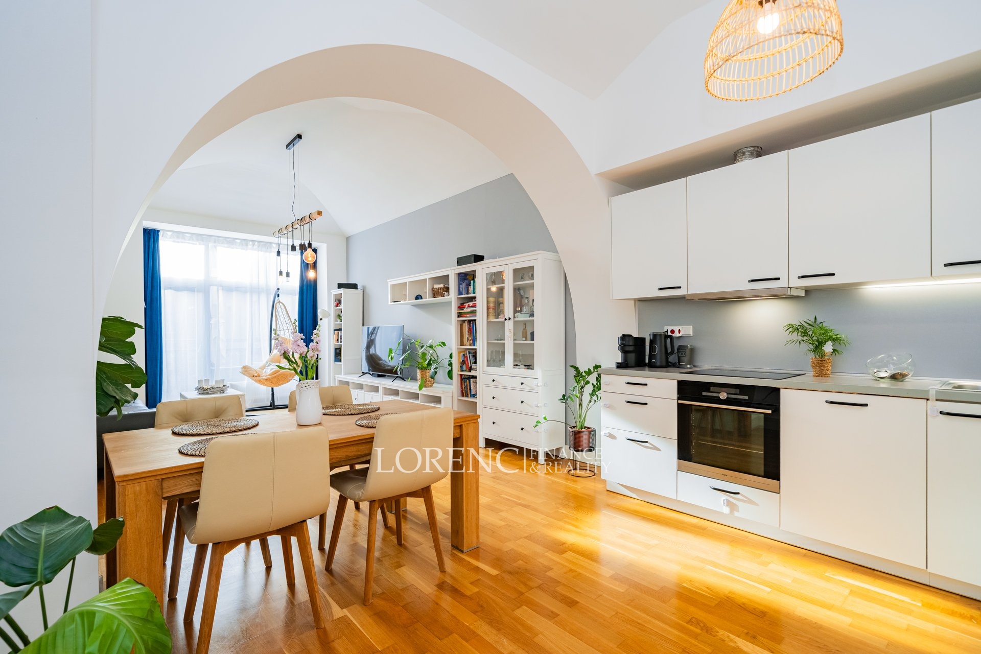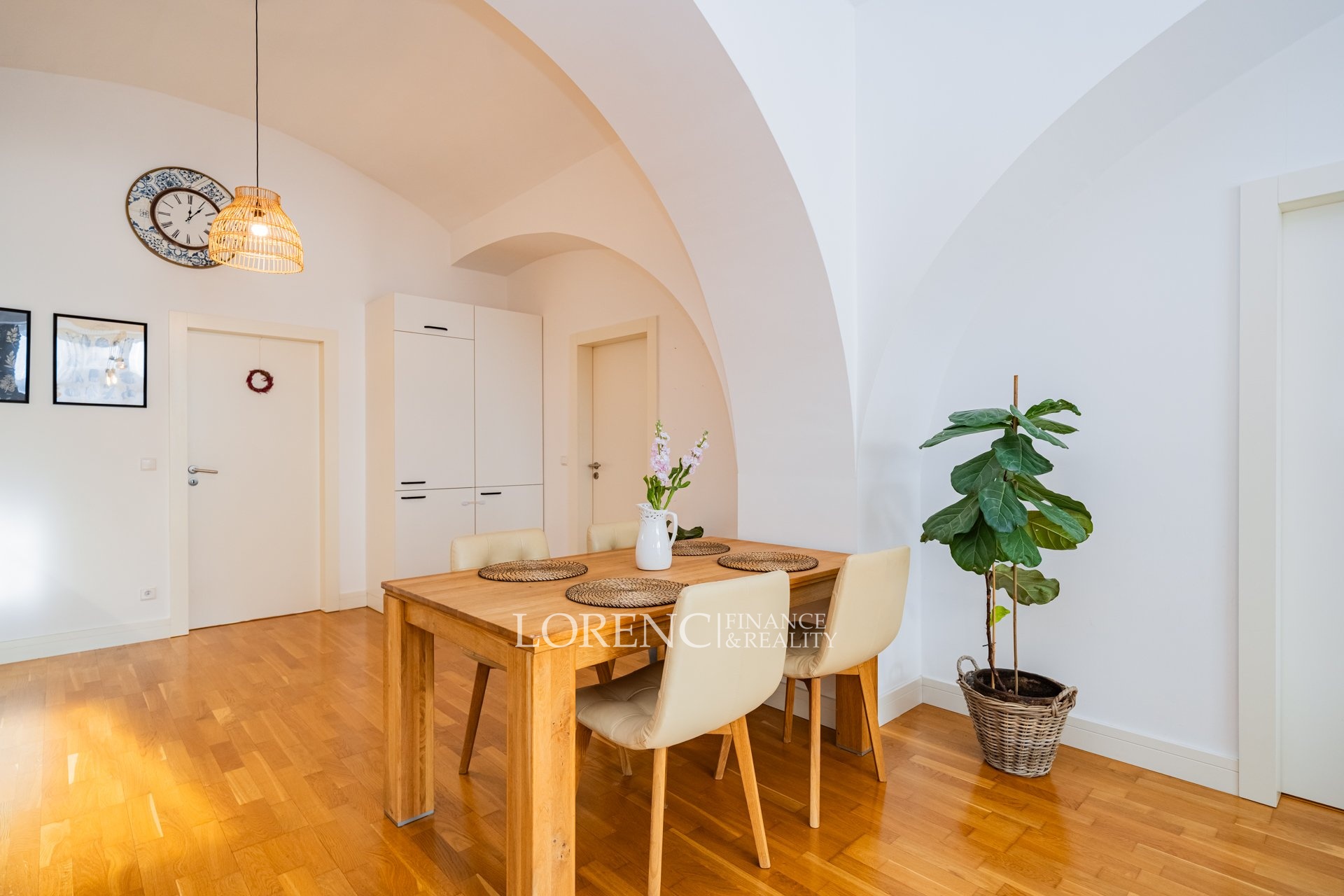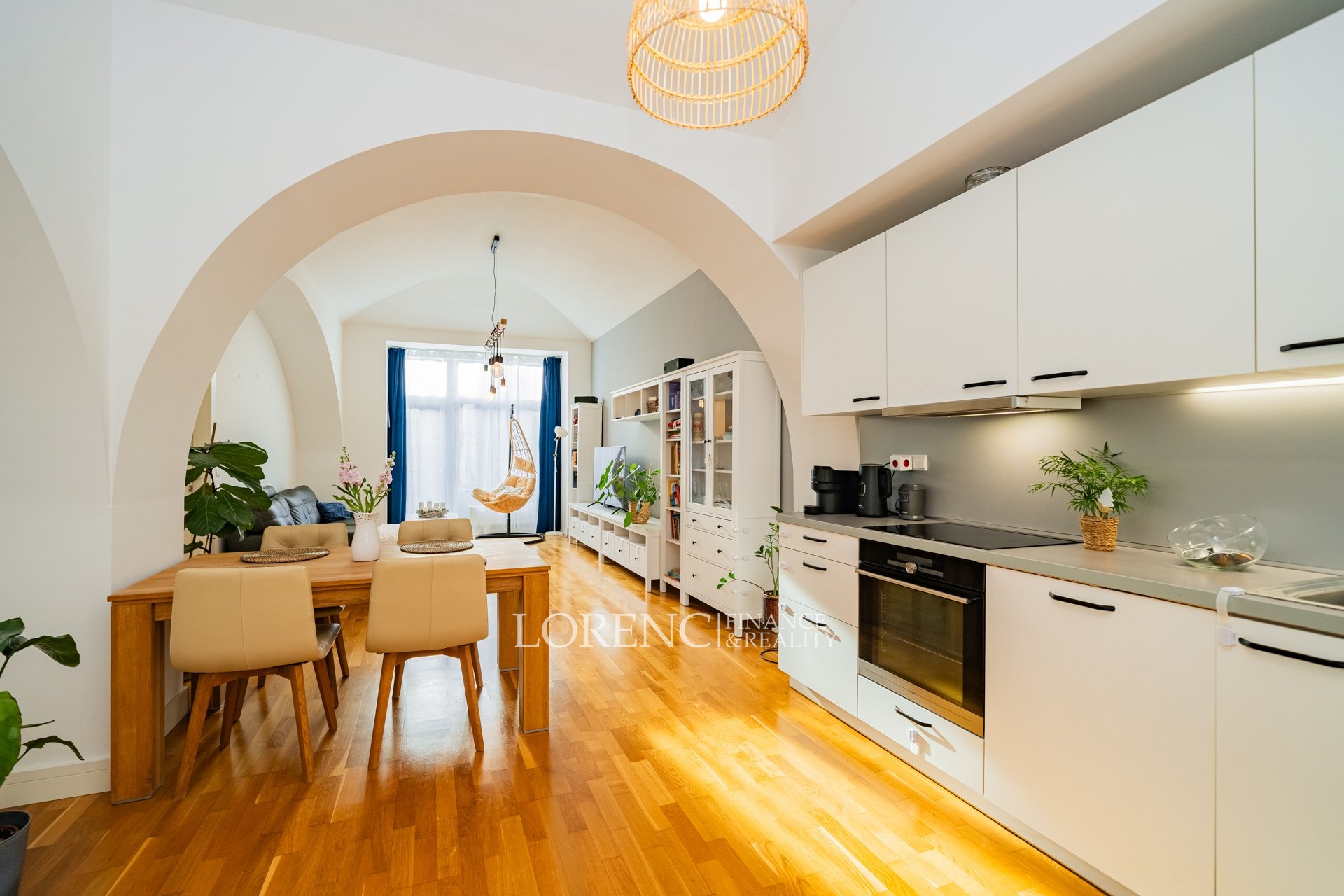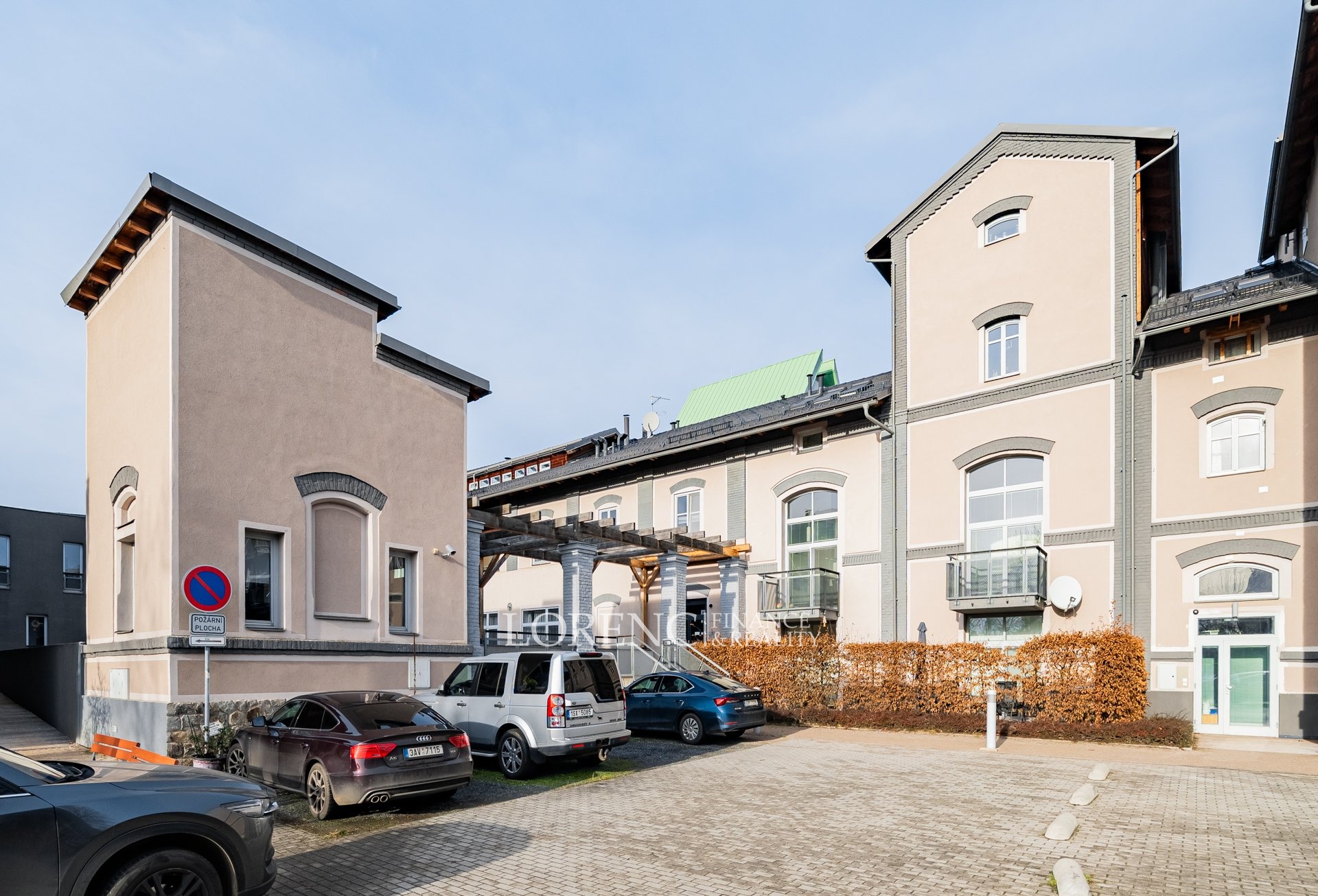 Byt se nachází ve 2. nadzemním podlaží zděné budovy a je umístěn na konci chodby, což zajišťuje maximální klid a soukromí. Jedinečnou atmosféru interiéru podtrhují klenbové stropy a dřevěné podlahy ve všech pokojích.