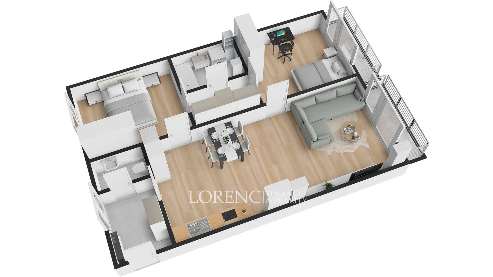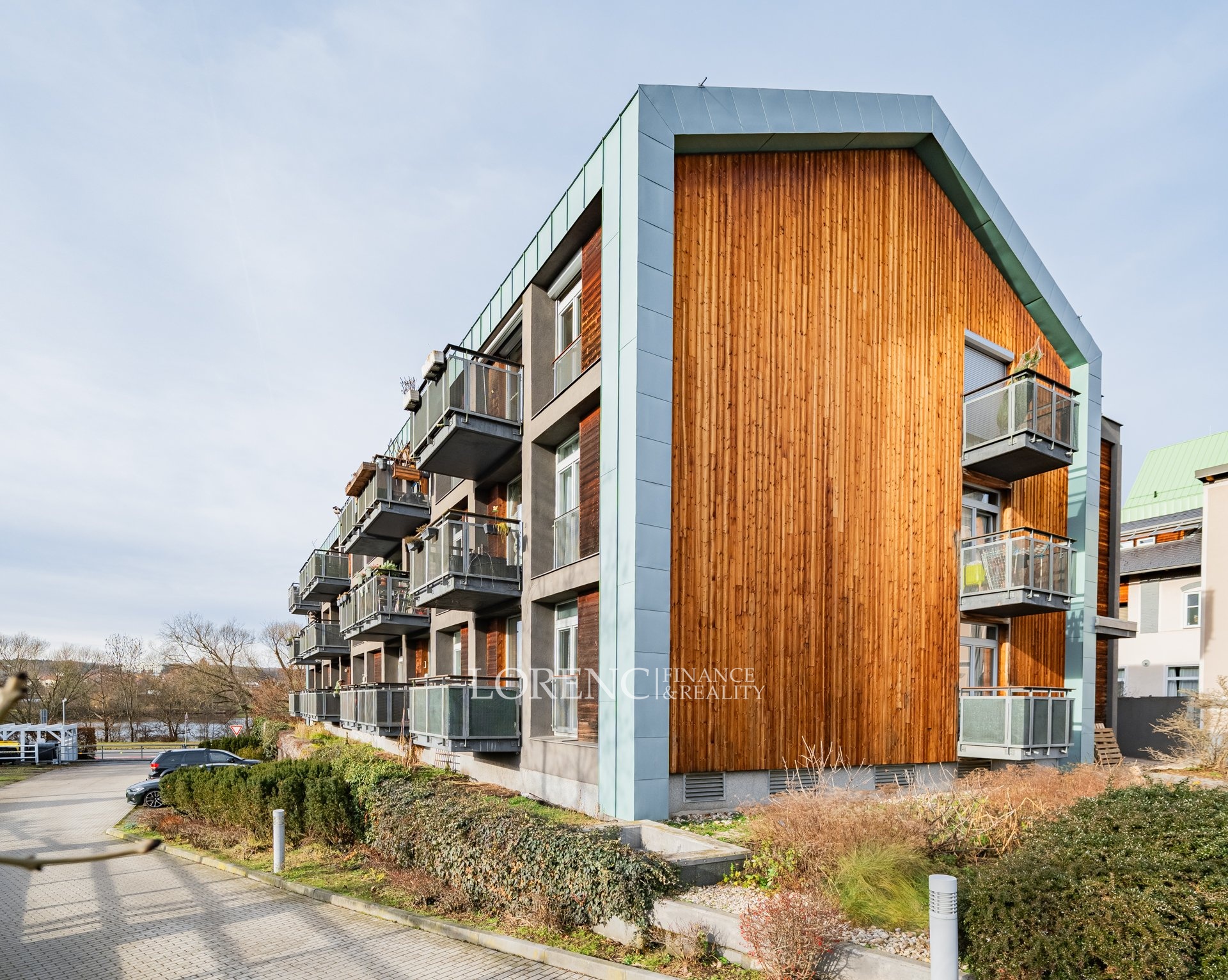 Z obývacího pokoje i dětského pokoje je vstup na dva samostatné balkony (každý 3,5 m²), oba orientované na jih, ideální pro ranní kávu i večerní relax.