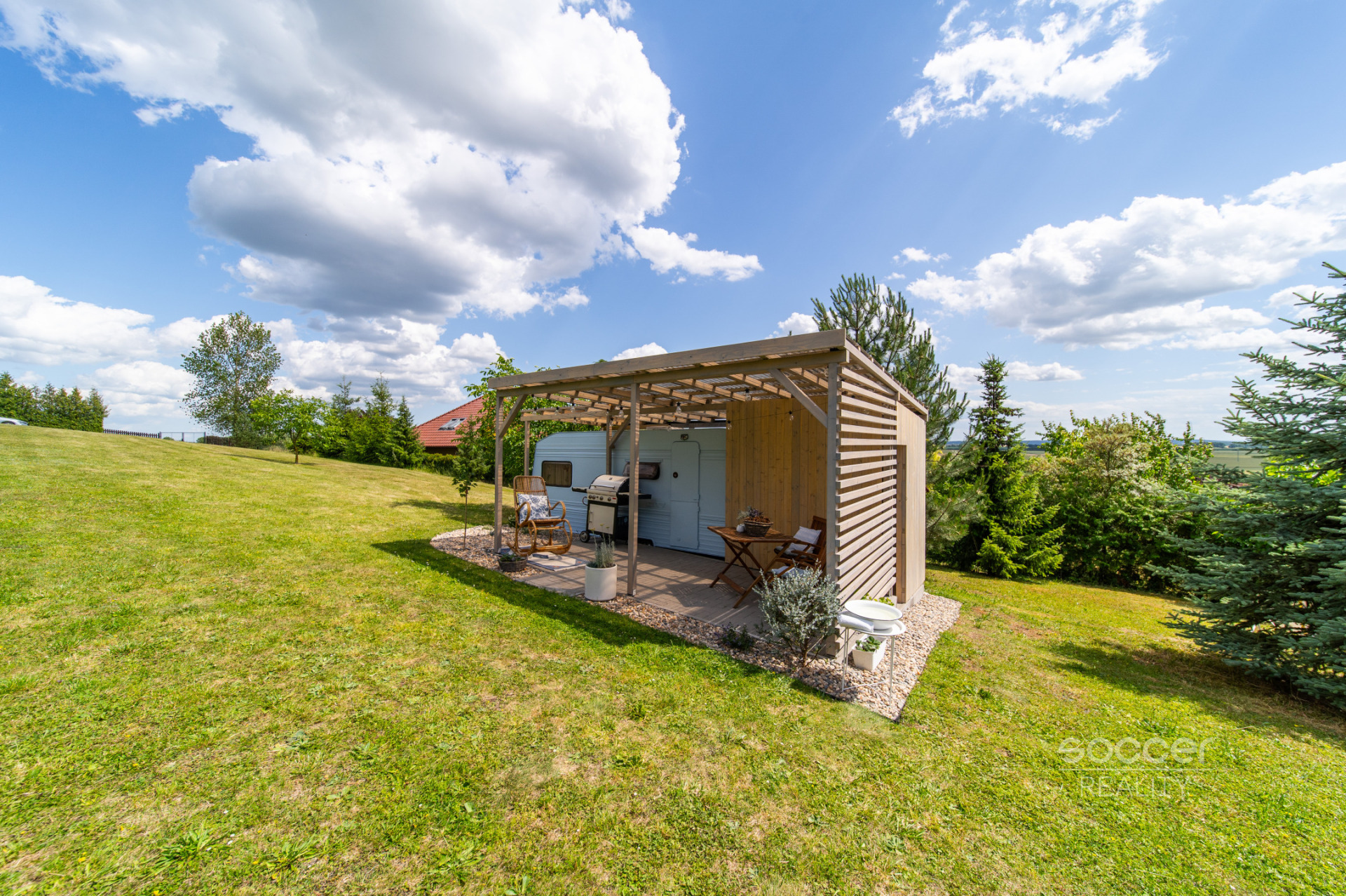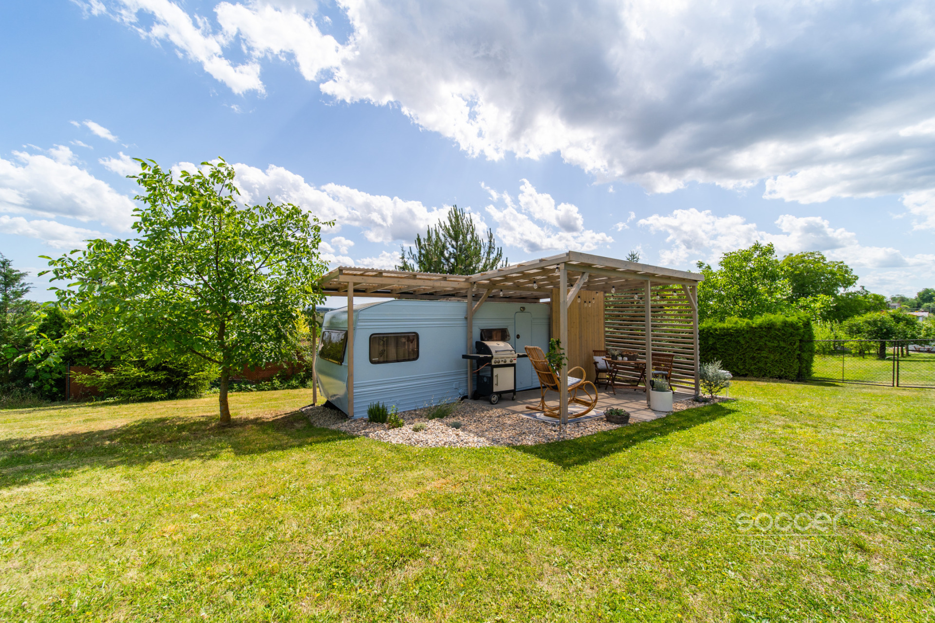 Příjemná venkovská zahrada s rekreačním karavanem a terasou.